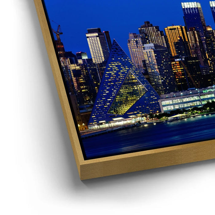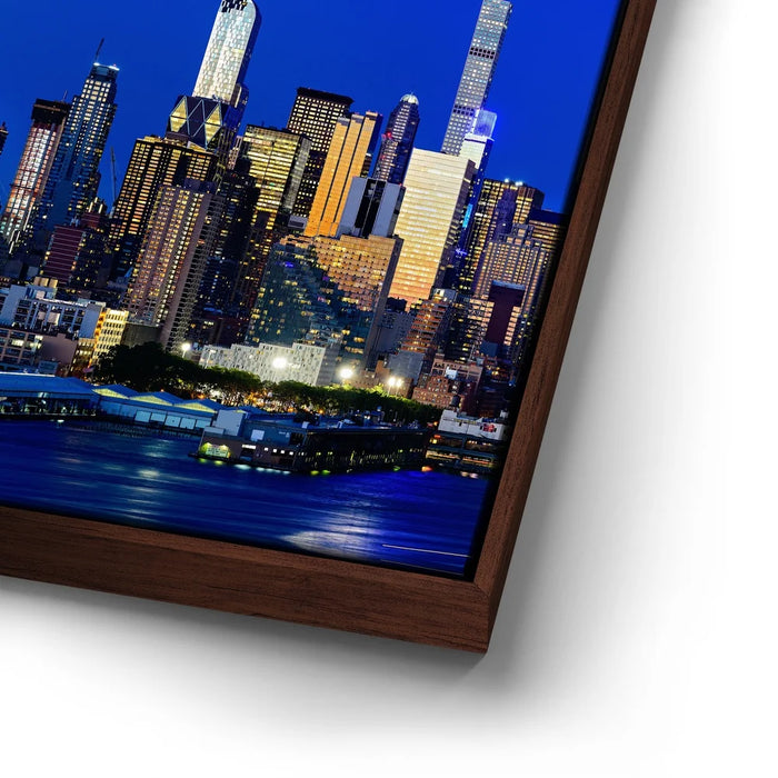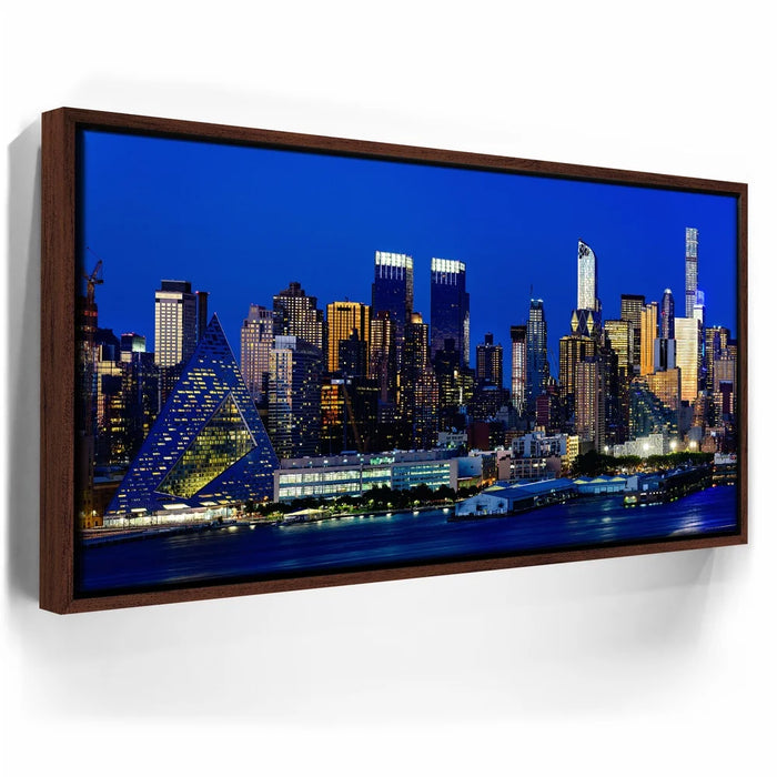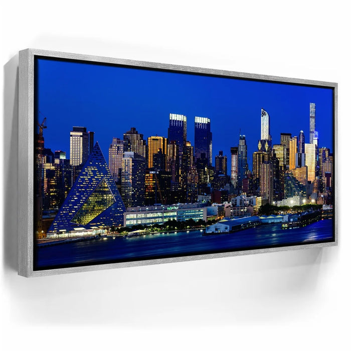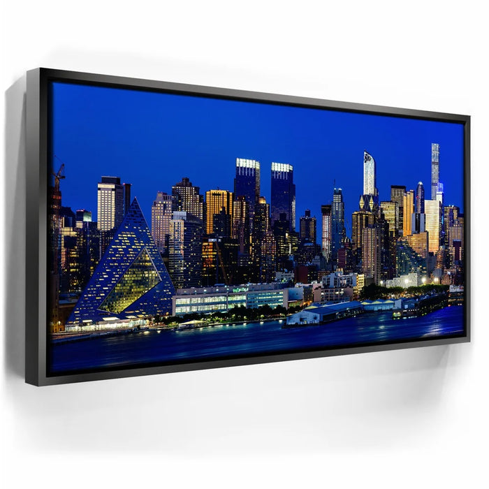 “Famous Midtown Manhattan Skyline View At Night - 1 Of 3” by Barbarossa captures the dazzling glow of New York City under a deep blue evening sky. The illuminated skyscrapers, including the striking pyramid-shaped VIA 57 West, create a vibrant panorama reflected across the Hudson River.
