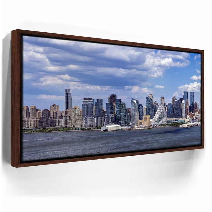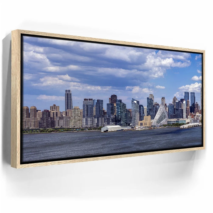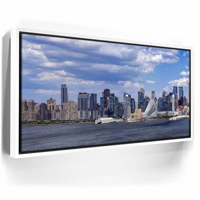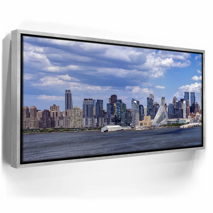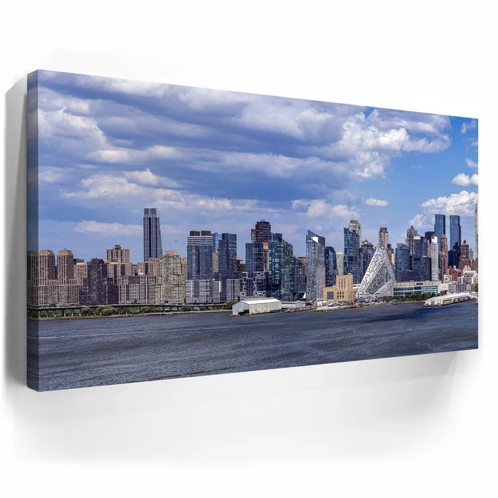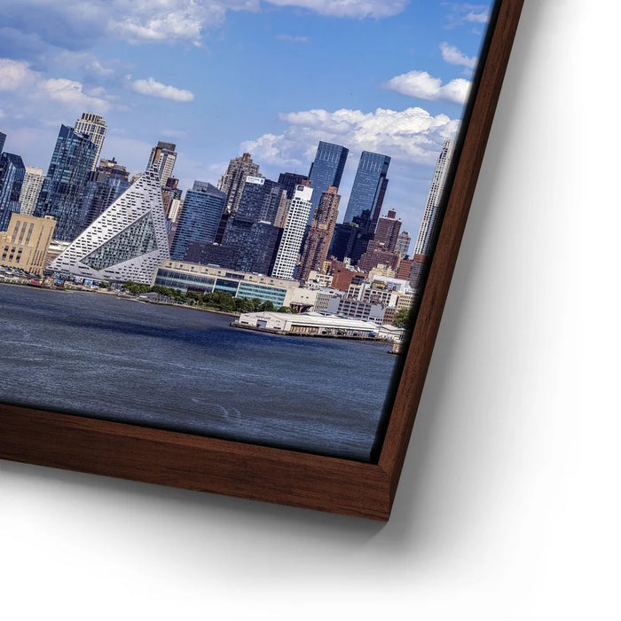 “Famous Midtown Manhattan Skyline View In Daylight - 1 Of 3” by Barbarossa presents a crisp and vivid panorama of New York City’s west side under a bright blue sky. Distinctive modern architecture, including the pyramid-shaped VIA 57 West, stands out among the skyline, reflecting the city’s innovative spirit.