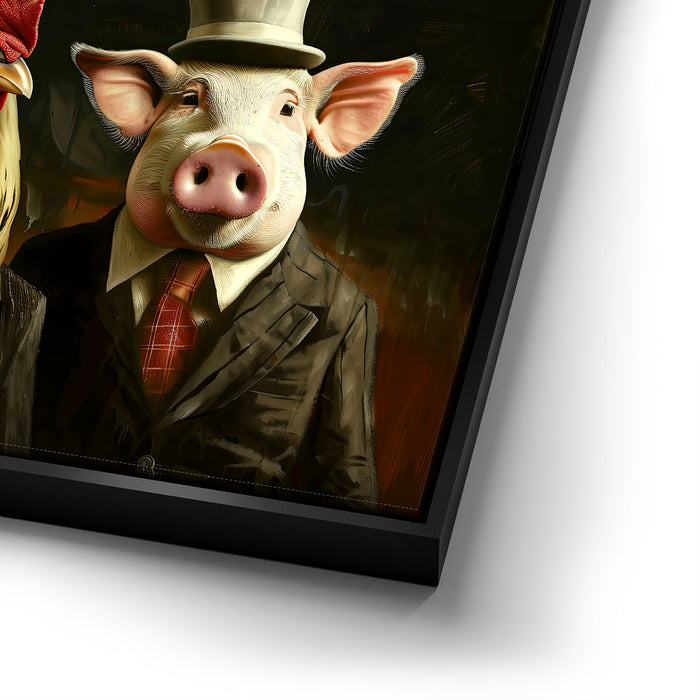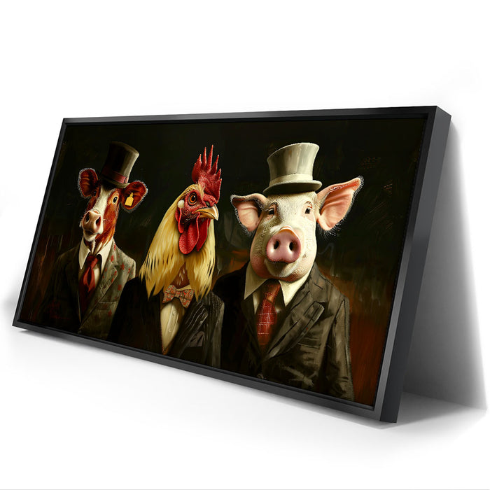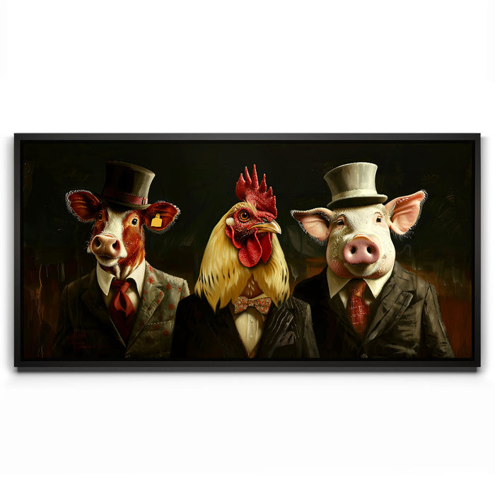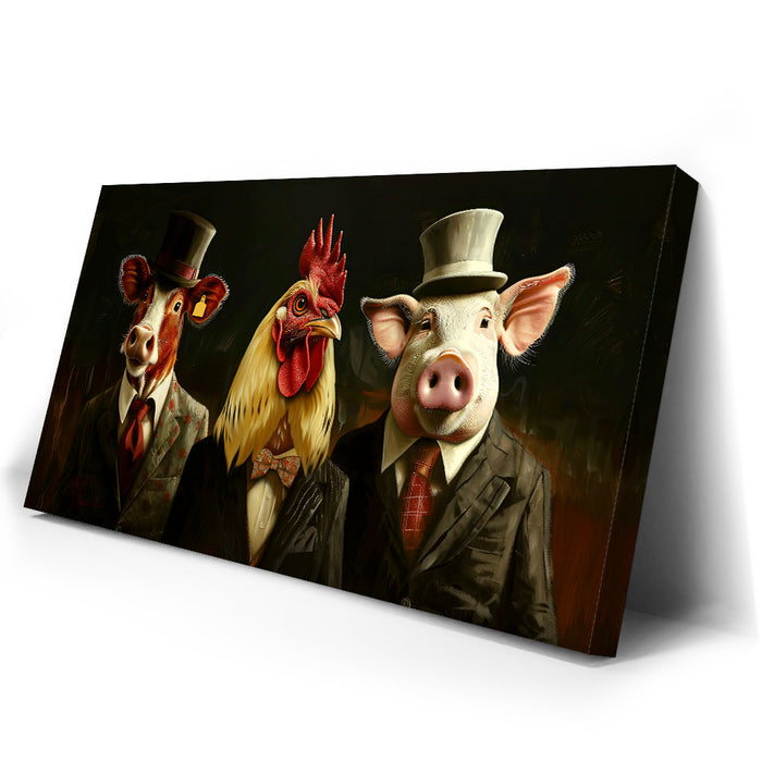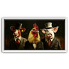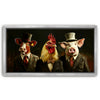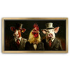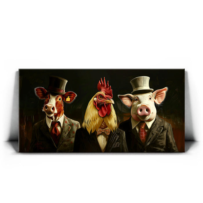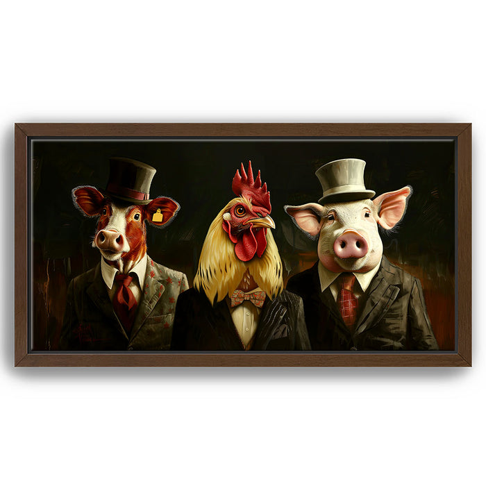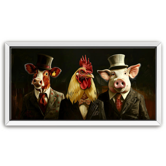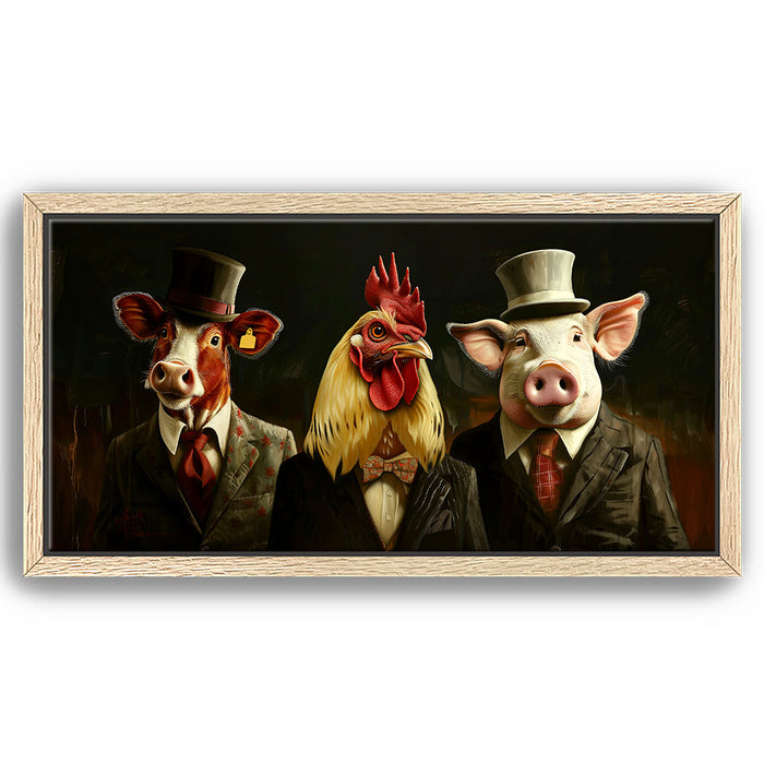 "Farmyard Formal" by Kandise King is a whimsical and satirical depiction of farm animals dressed in dapper attire, blending humor and sophistication. The cow, rooster, and pig don top hats and tailored suits, exuding an air of aristocracy, yet their barnyard origins make the piece irresistibly quirky. The muted background contrasts beautifully with the vibrant details of their attire and expressions, adding depth and intrigue.
