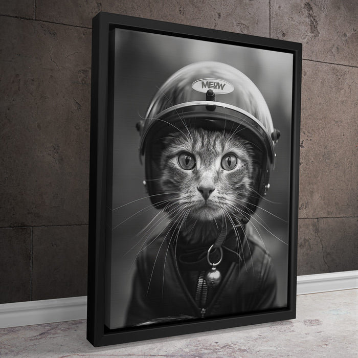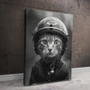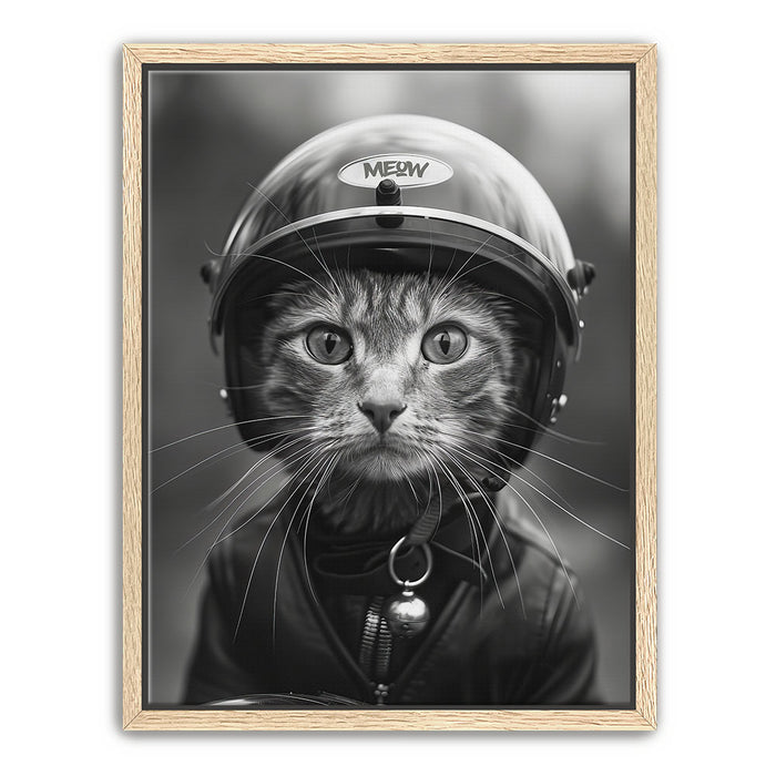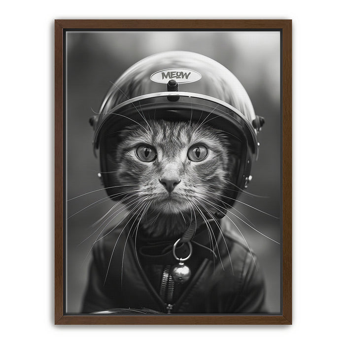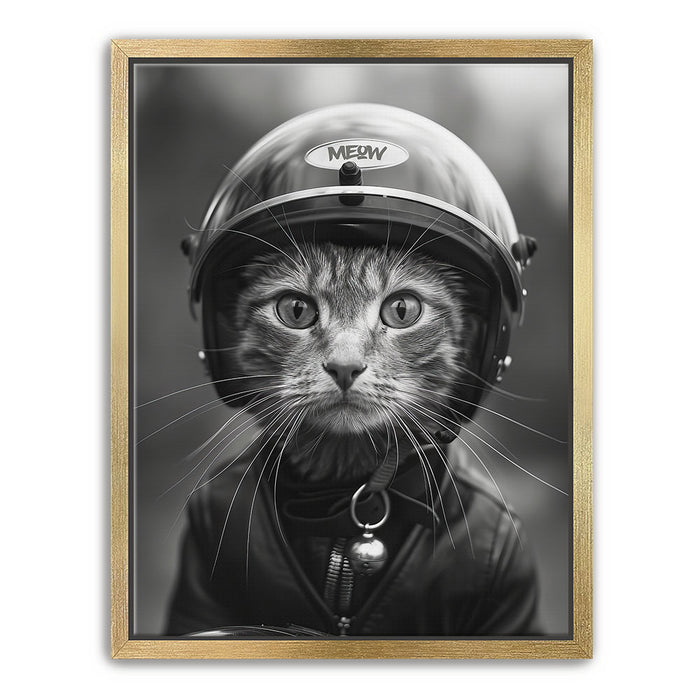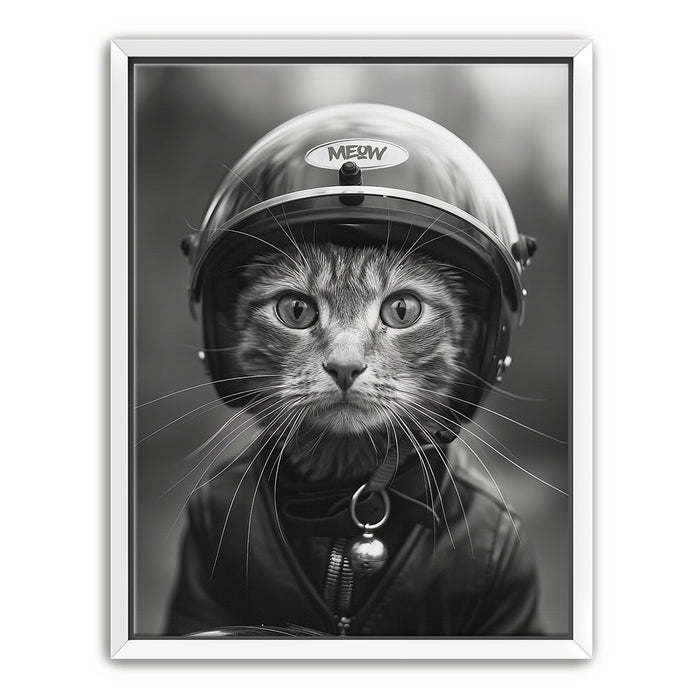 "Fast and Furry-ous," captured by artist Arend Pryor, presents a charming and humorous black-and-white portrait of a cat wearing a motorcycle helmet. The detailed fur texture and intense gaze of the cat contrast sharply with the sleek, shiny helmet, creating a memorable and striking image.