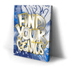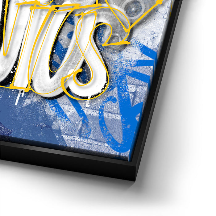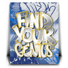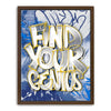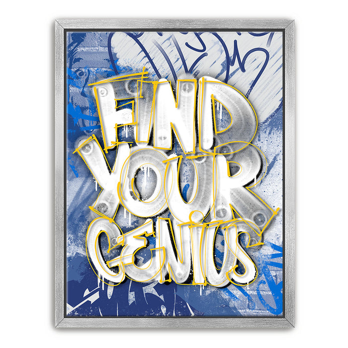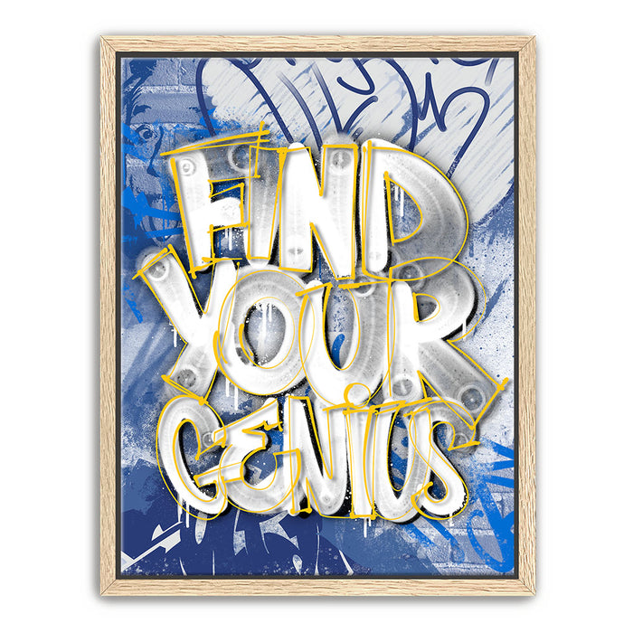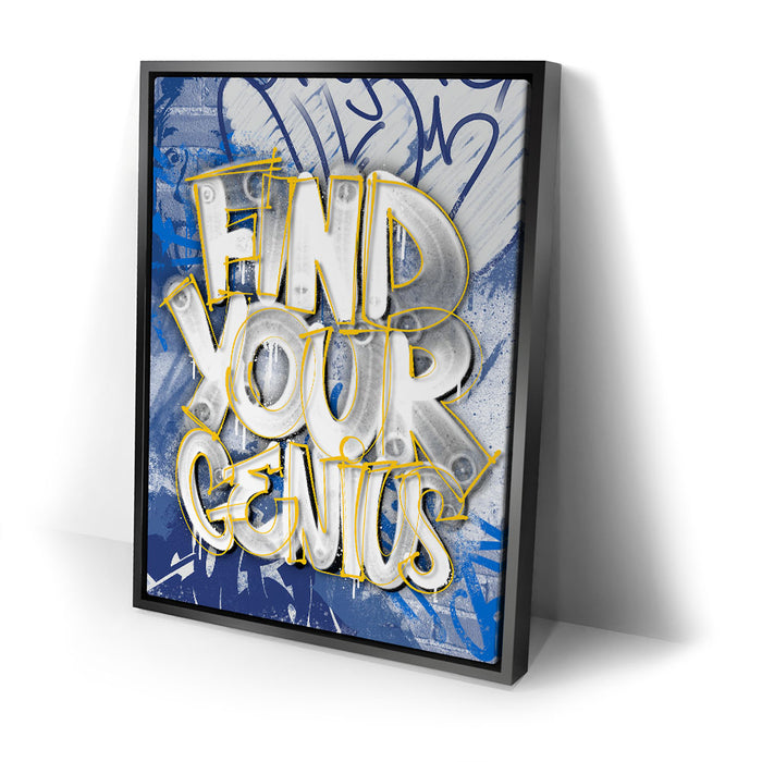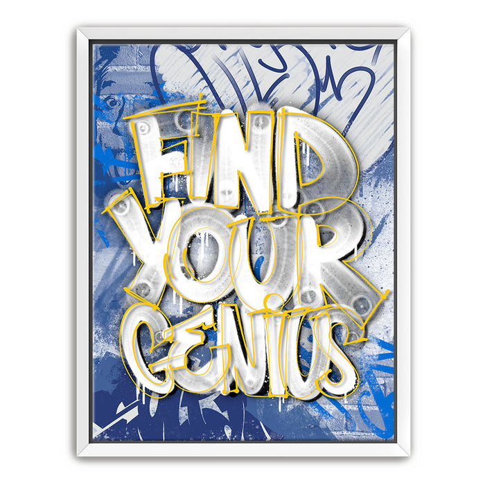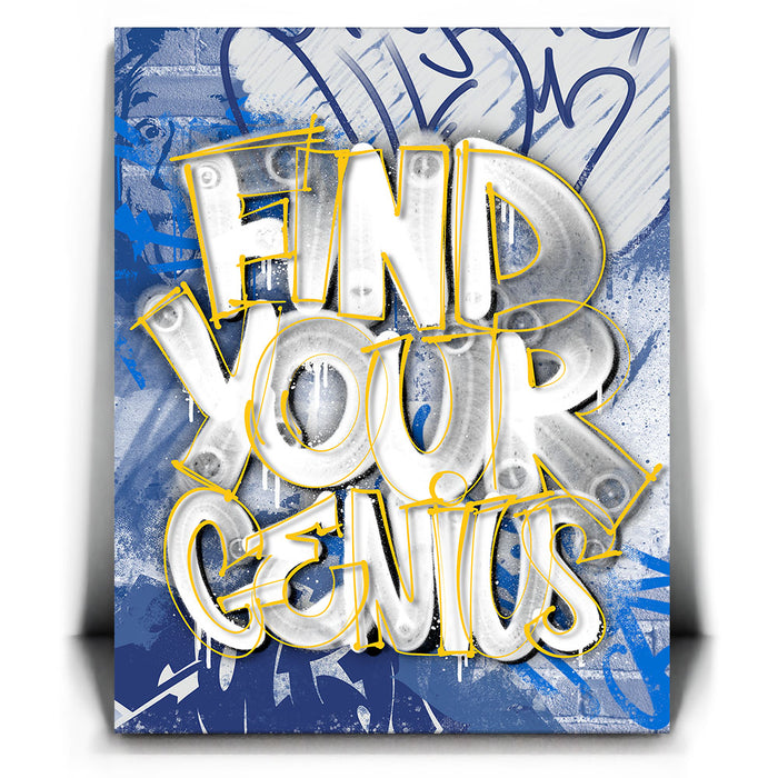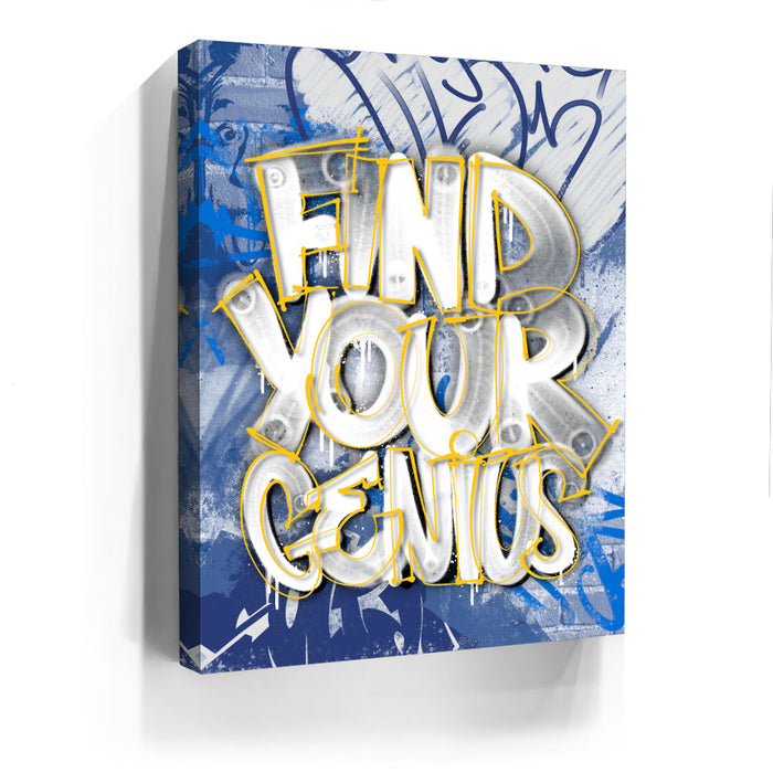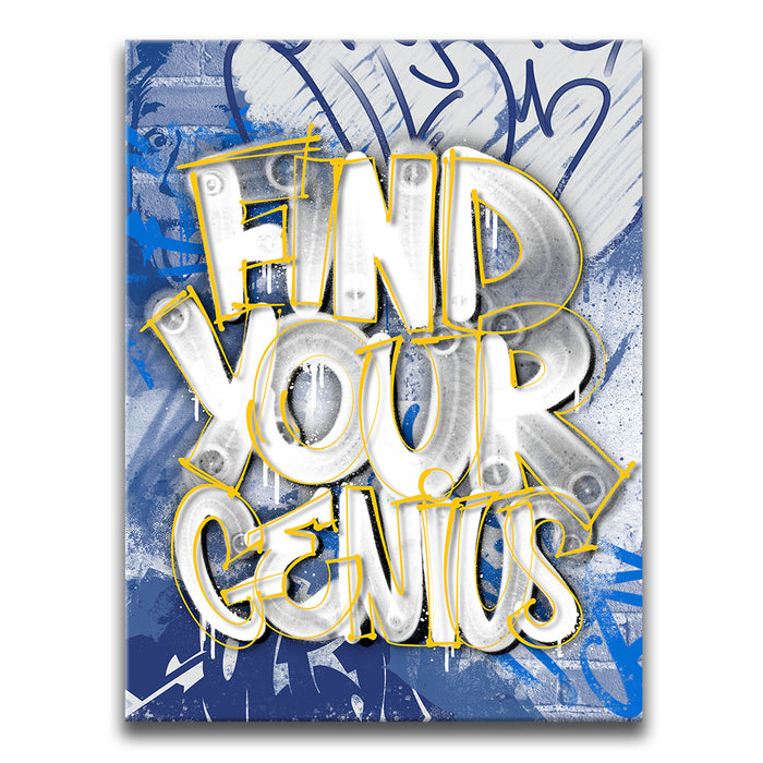 "Find Your Genius - Graffiti" is a striking urban art piece that uses bold typography and vibrant color accents to convey an inspiring message. The artwork combines street art aesthetics with motivational text, encouraging viewers to tap into their creativity and embrace their unique abilities. The layered design and dynamic spray-painted elements make it an eye-catching addition to modern interiors or creative spaces.