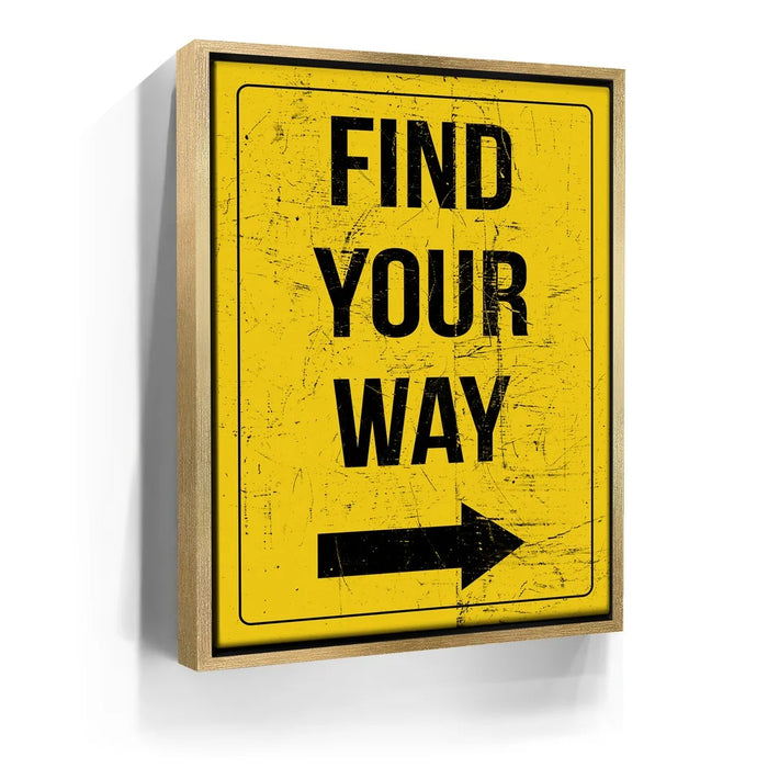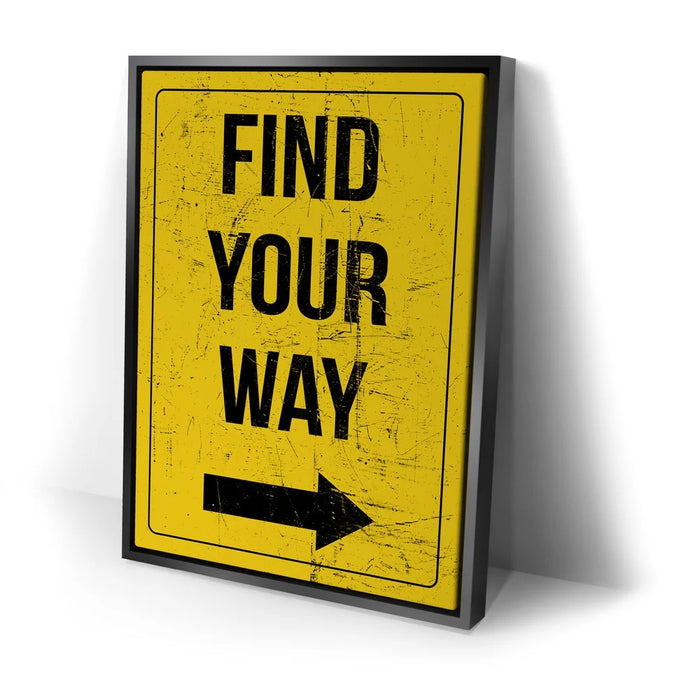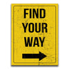 “Find Your Way Sign – Yellow” radiates confidence and momentum, transforming the look of a worn street sign into a message of determination. The bold black lettering and directional arrow pop against the distressed yellow background—a universal color of caution, energy, and forward motion.