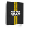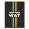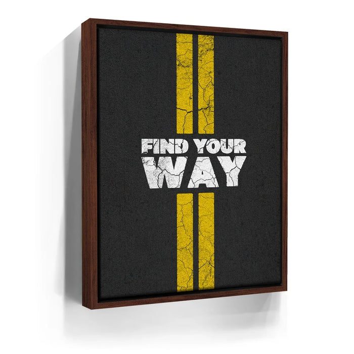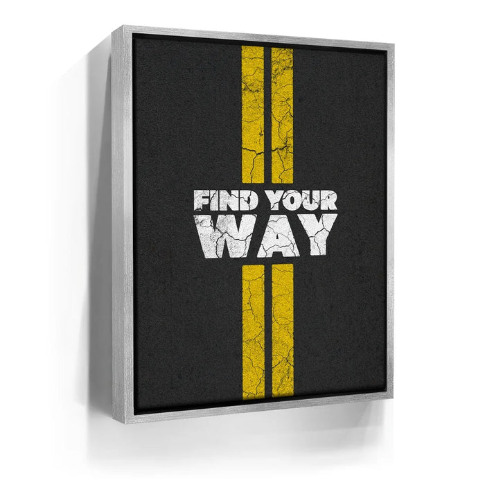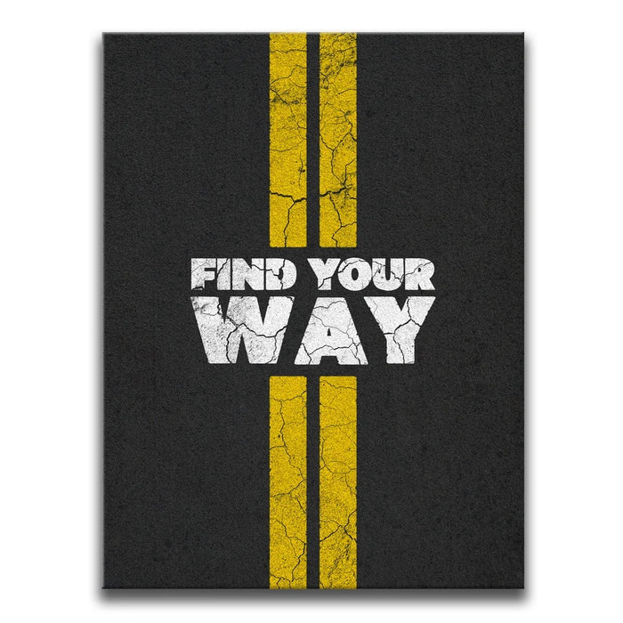 “Find Your Way – Street” turns a stretch of asphalt into a metaphor for persistence and direction. The cracked yellow road lines slice through the darkness, leading the eye forward, while the bold, weathered white text stands as both a challenge and encouragement. Every texture and fracture in the design speaks of the miles traveled, the detours taken, and the strength found in continuing on.