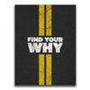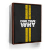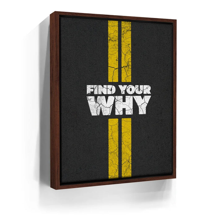 “Find Your Why – Street” turns the cracked surface of a worn asphalt road into a powerful symbol of purpose and perseverance. The double yellow lines slice through the center like a path forward, while the distressed white lettering grounds the message in raw determination.