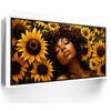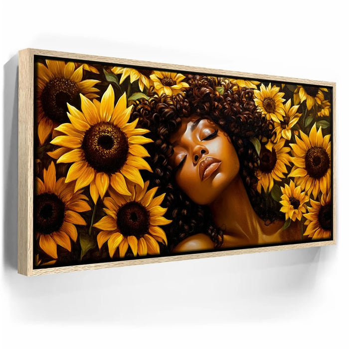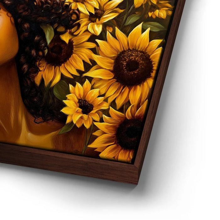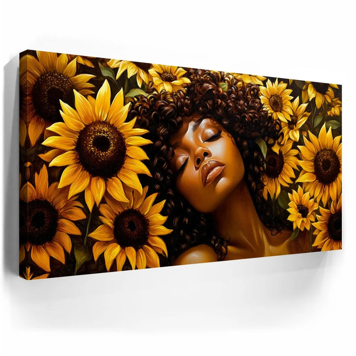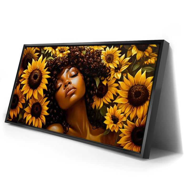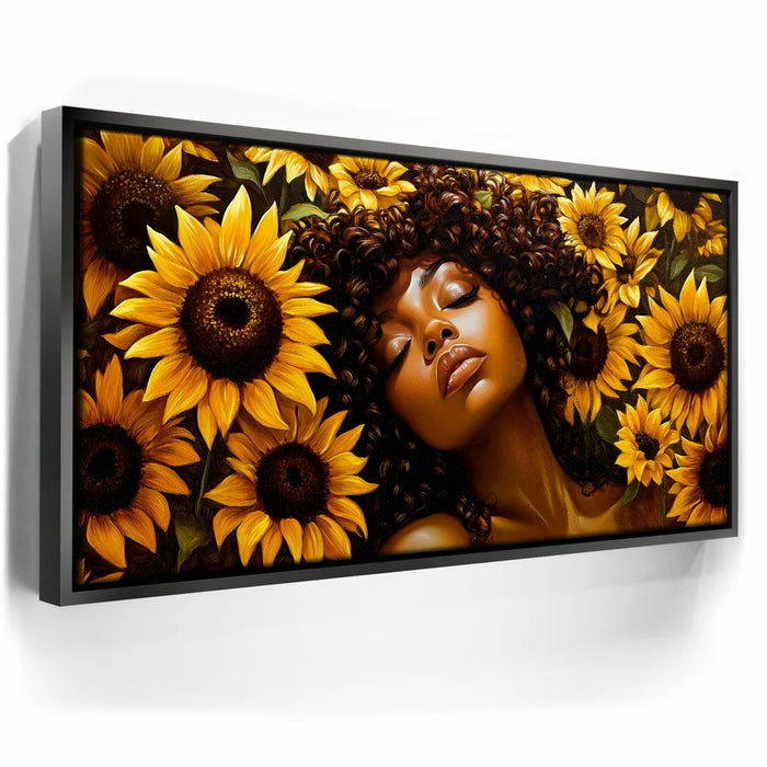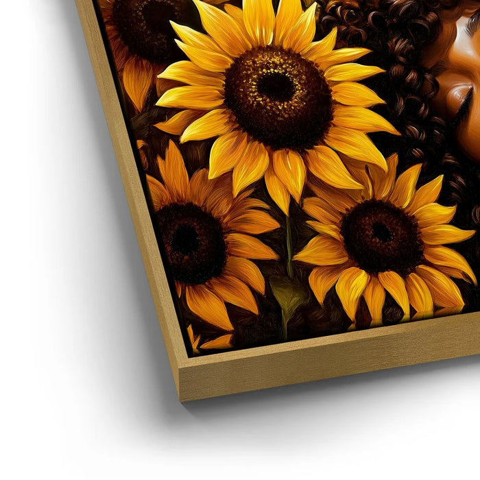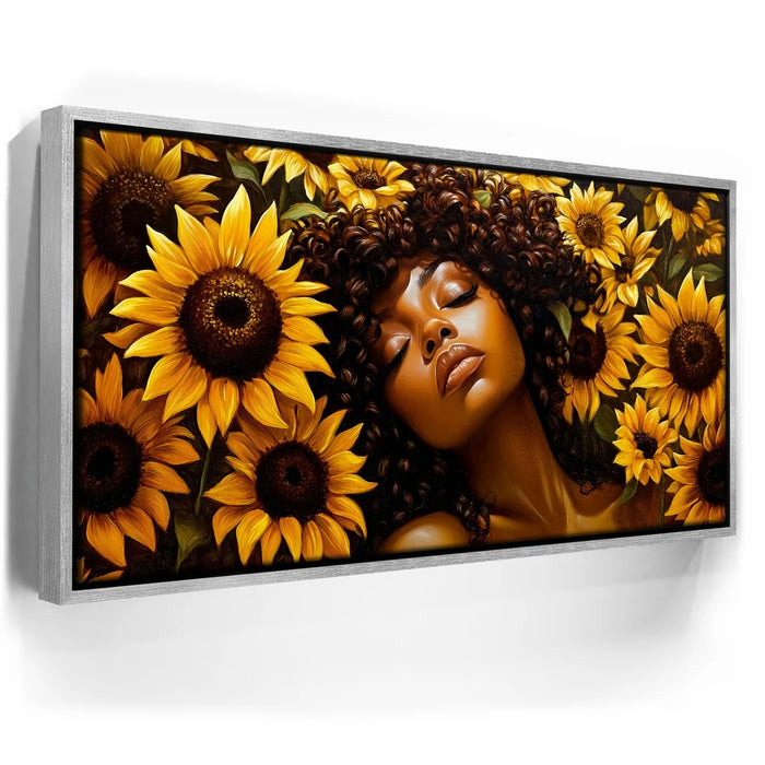 “Fleur D’or” by Kandise King is a radiant celebration of beauty, warmth, and softness. The woman rests peacefully among a field of golden sunflowers, her curls blending naturally with the blooms around her. Her serene expression and sunlit skin create a feeling of calm and harmony, while the rich yellows and deep browns add a glowing, inviting warmth to the scene.