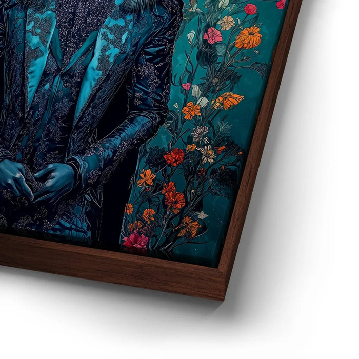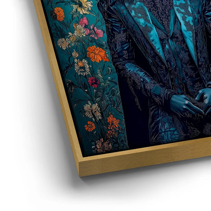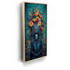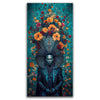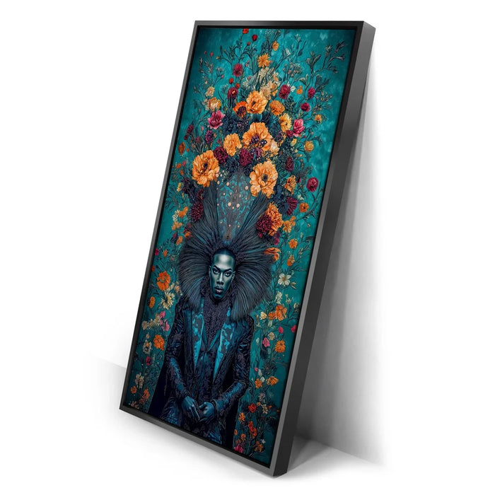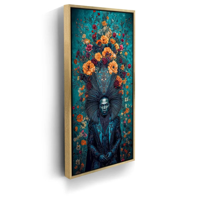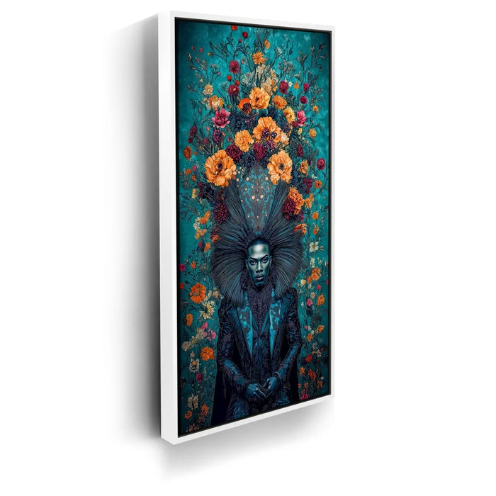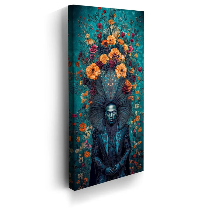 “Flora Reign Supreme” by Kandise King blends regal fantasy with lush botanical beauty, creating a portrait that feels powerful, mystical, and impossibly striking. The figure sits centered in deep teal tones, draped in ornate garments, while an extravagant crown of flowers blooms upward in a stunning cascade of oranges, golds, and reds. The radiating hair and floral halo add a sense of divinity and command, turning the subject into a sovereign of nature itself.