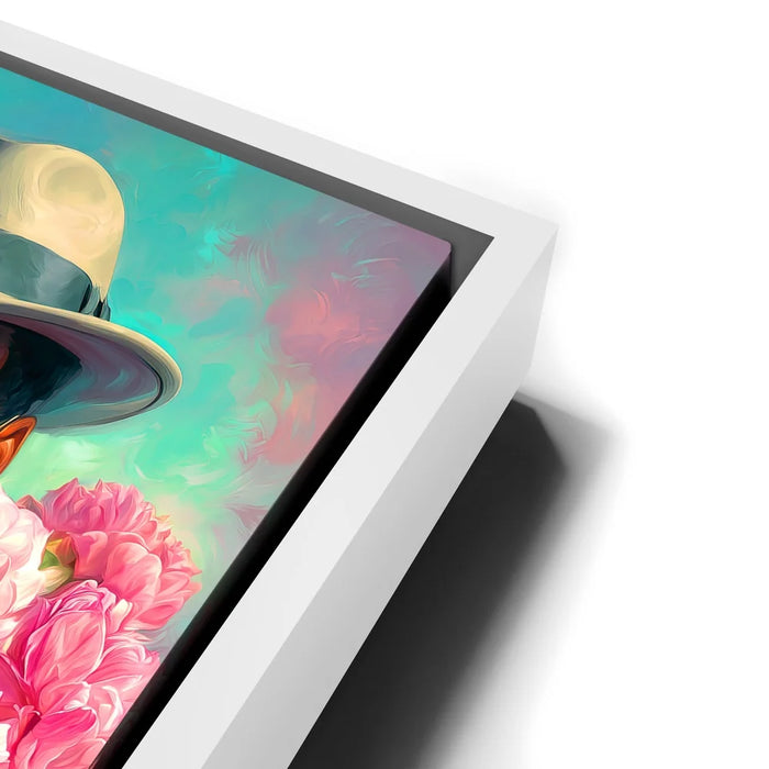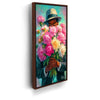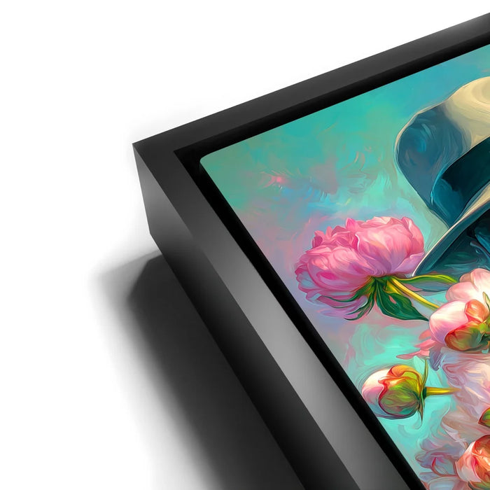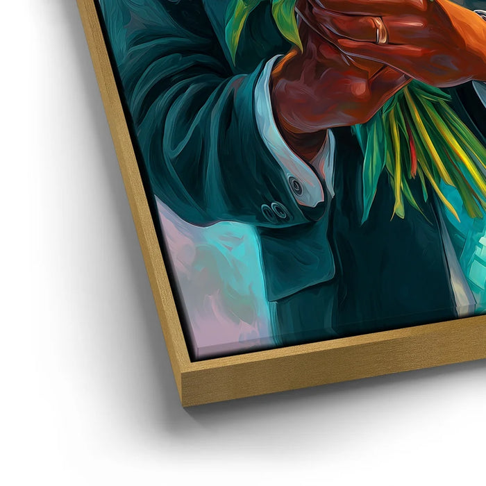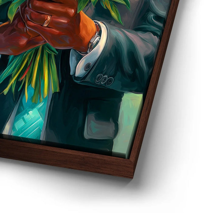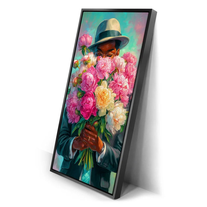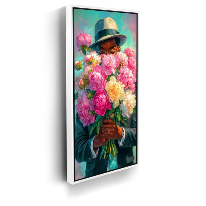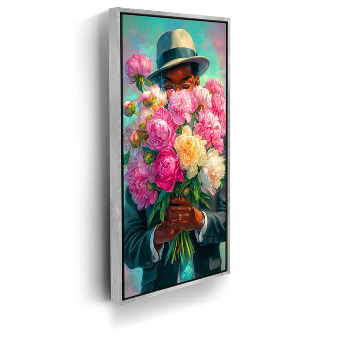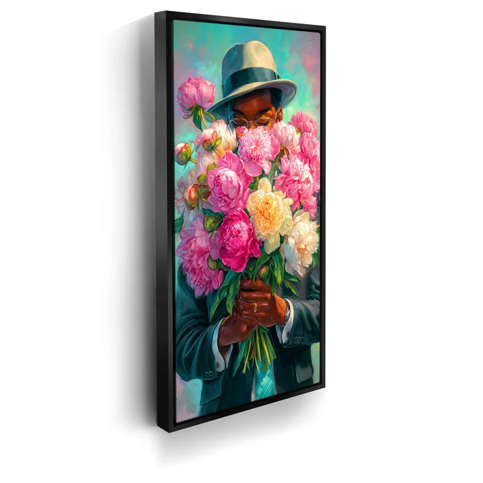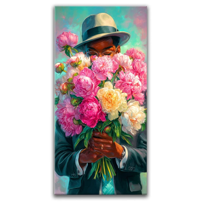 "Floral Intentions" by Kandise King is a vivid portrayal of romance and mystery. A sharply dressed figure hides behind an extravagant bouquet of peonies in full bloom, letting the flowers speak where words might fall short. The mix of soft pinks, creams, and vibrant greens symbolizes love, admiration, and heartfelt gestures, while the hidden face adds an element of intrigue—leaving the viewer to imagine the story behind the gift.