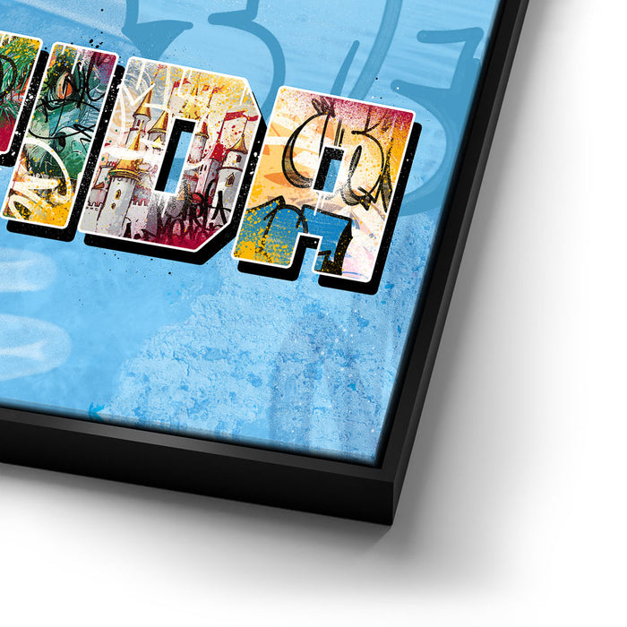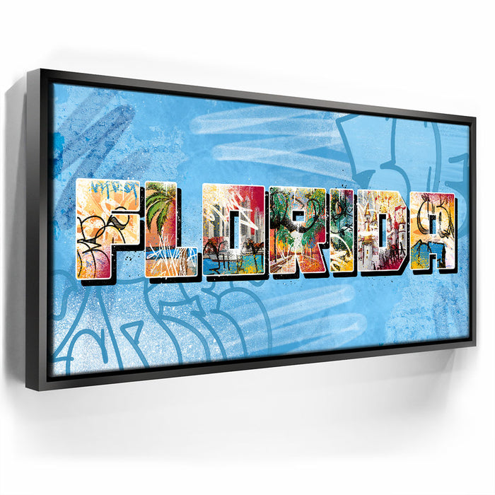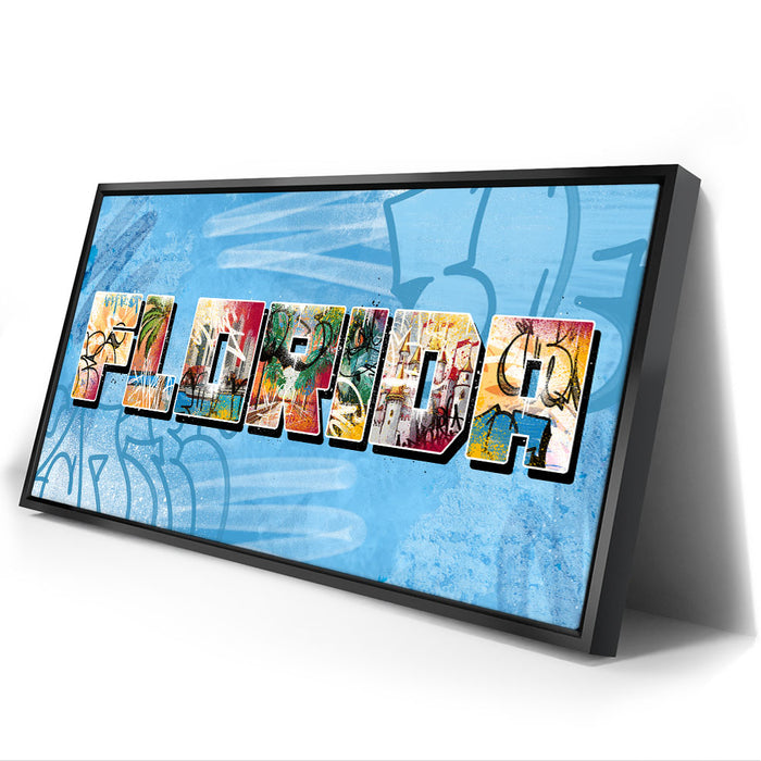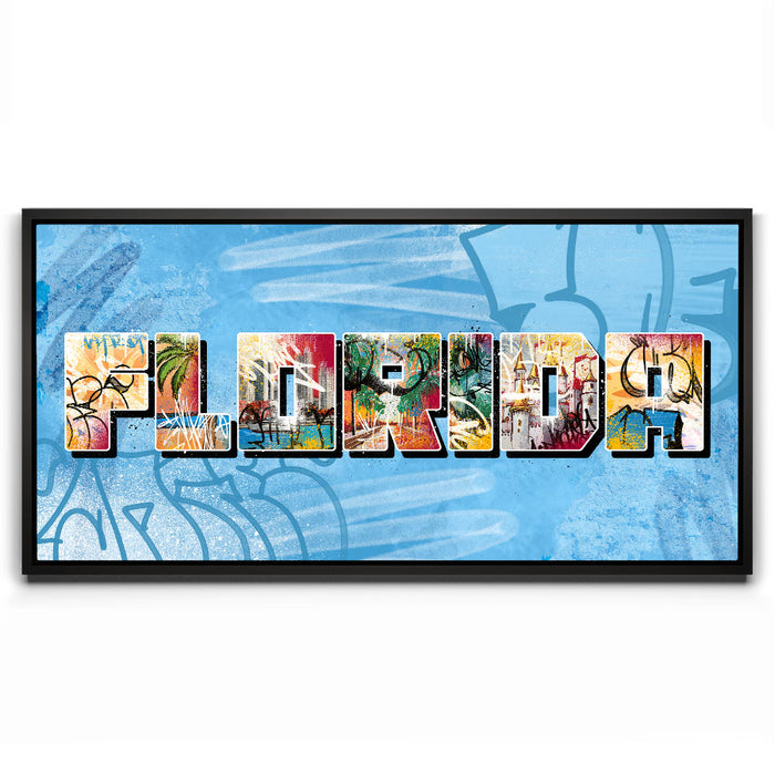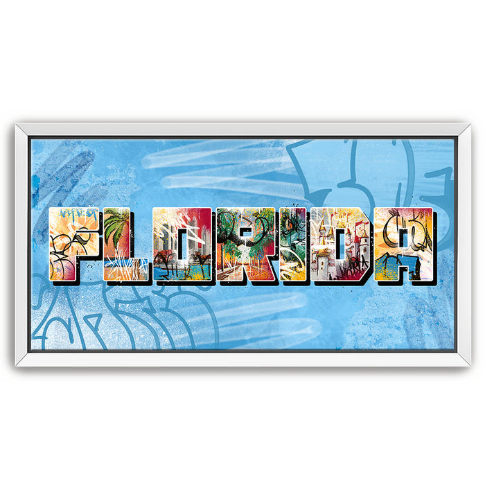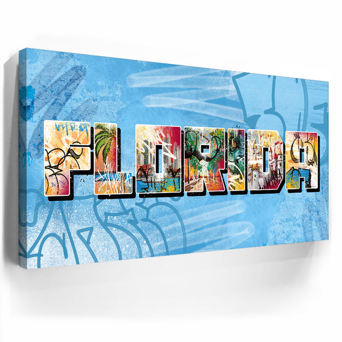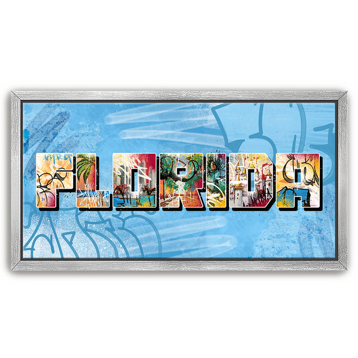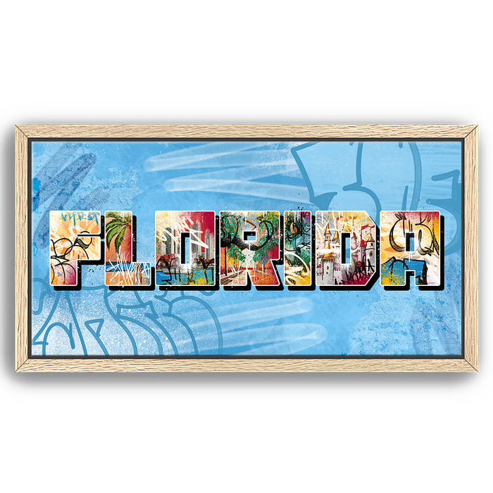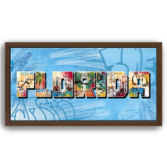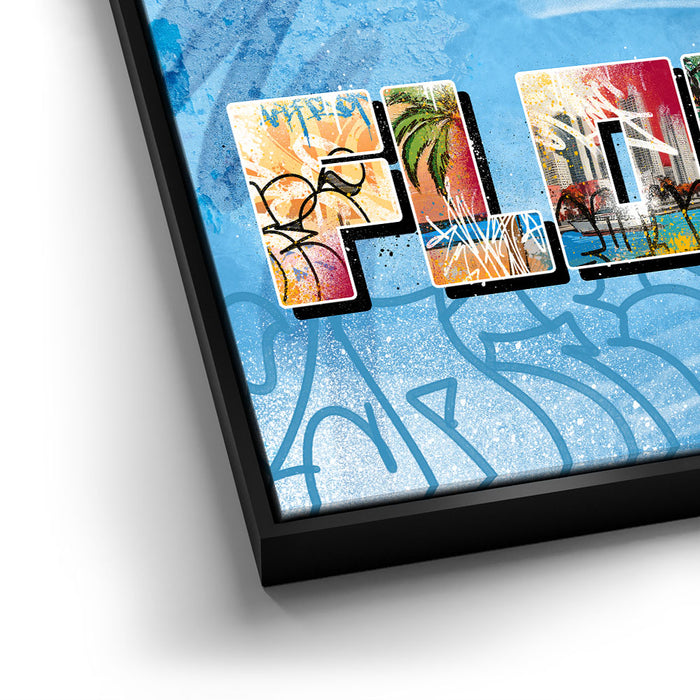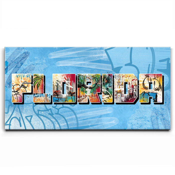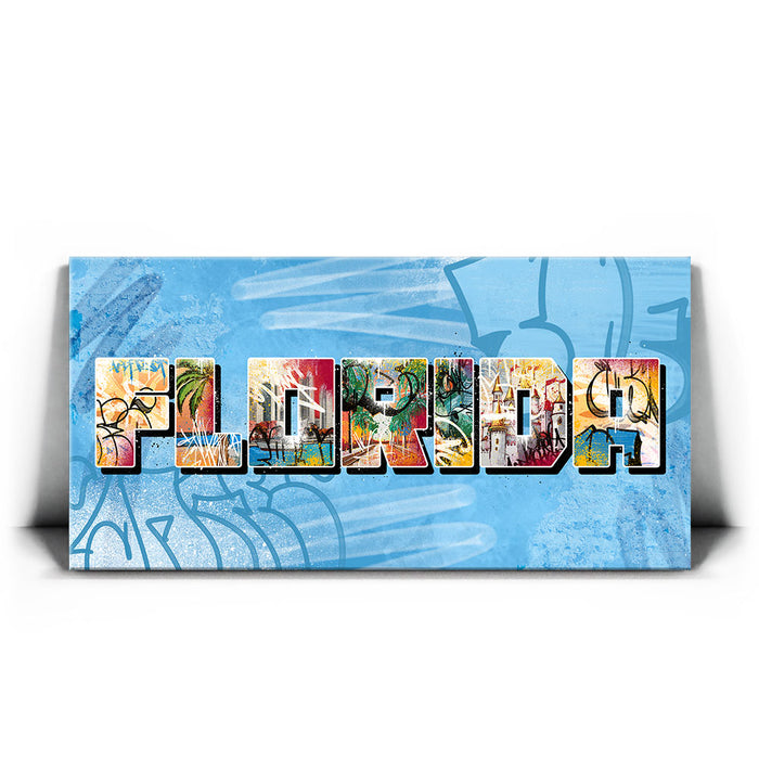This vibrant piece titled "Florida Sign - Graffiti" blends the energetic style of street art with a playful take on the Sunshine State. The typography is bold and eye-catching, featuring graffiti elements that give it a unique and contemporary flair. With palm trees, bright colors, and urban motifs, this artwork captures the essence of Florida’s dynamic spirit.