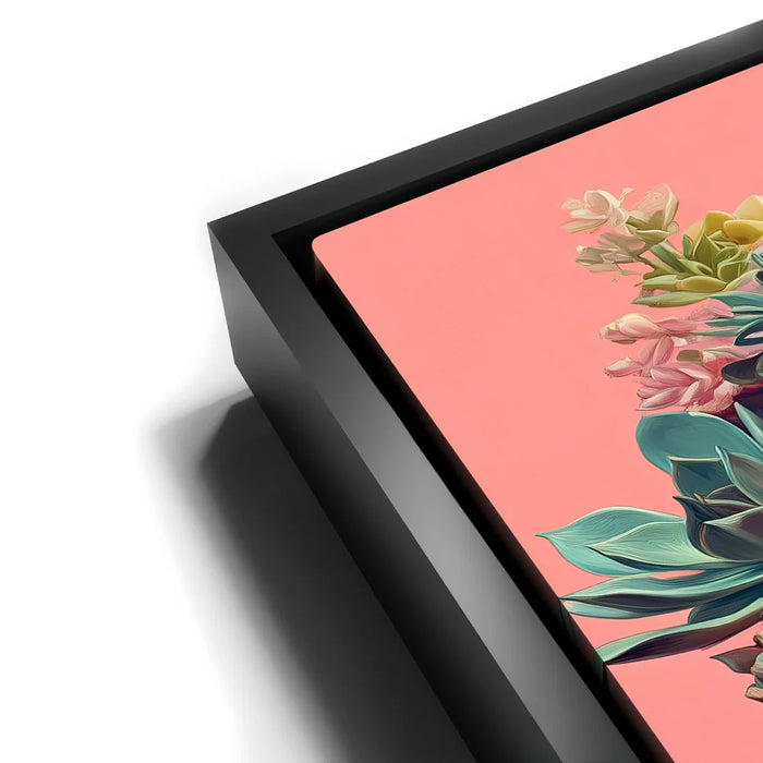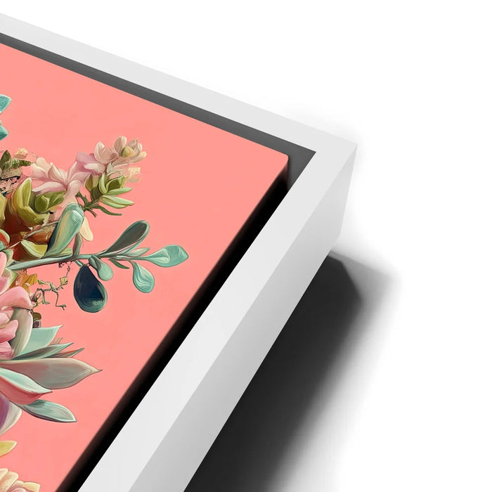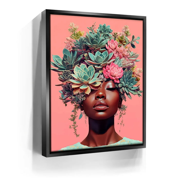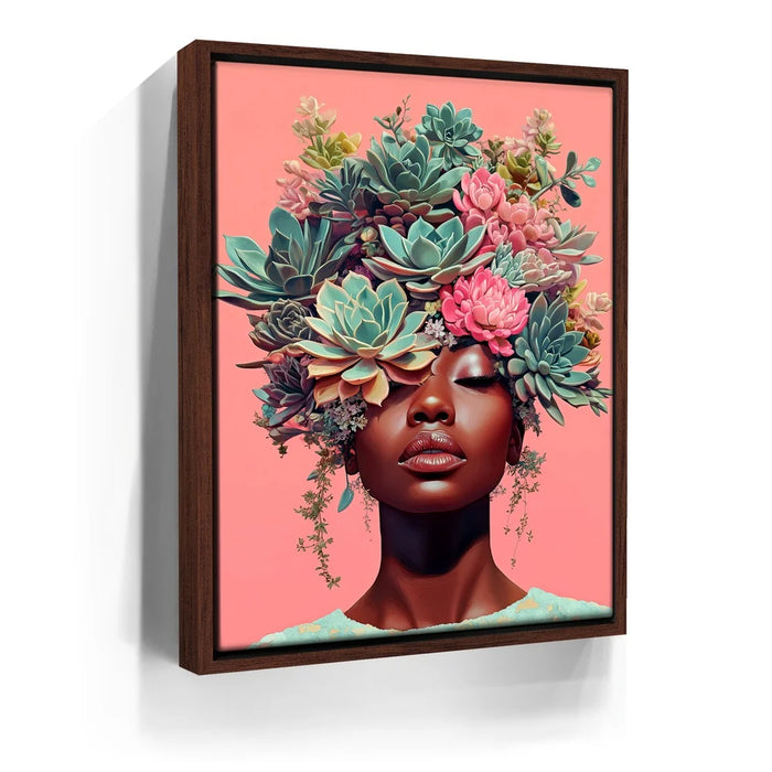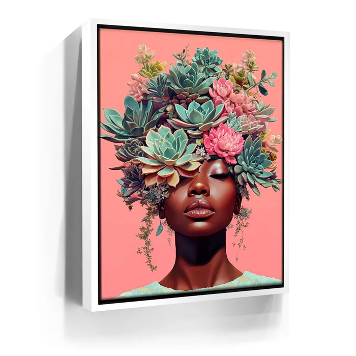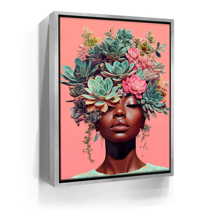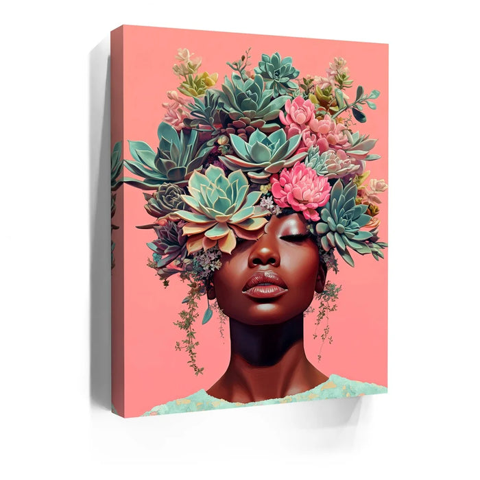 "Flourish And Bloom" by Kandise King is a radiant celebration of beauty, growth, and self-expression. The portrait features a serene woman adorned with a crown of lush succulents and vibrant blossoms, symbolizing resilience and the natural cycles of renewal. Against a soft pink backdrop, the artwork blends elegance with bold vibrancy, making it both calming and empowering.