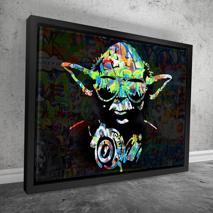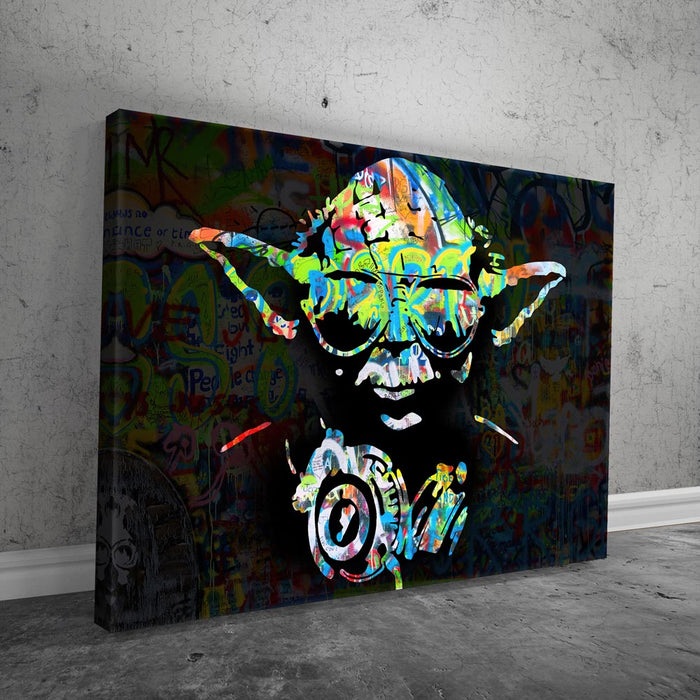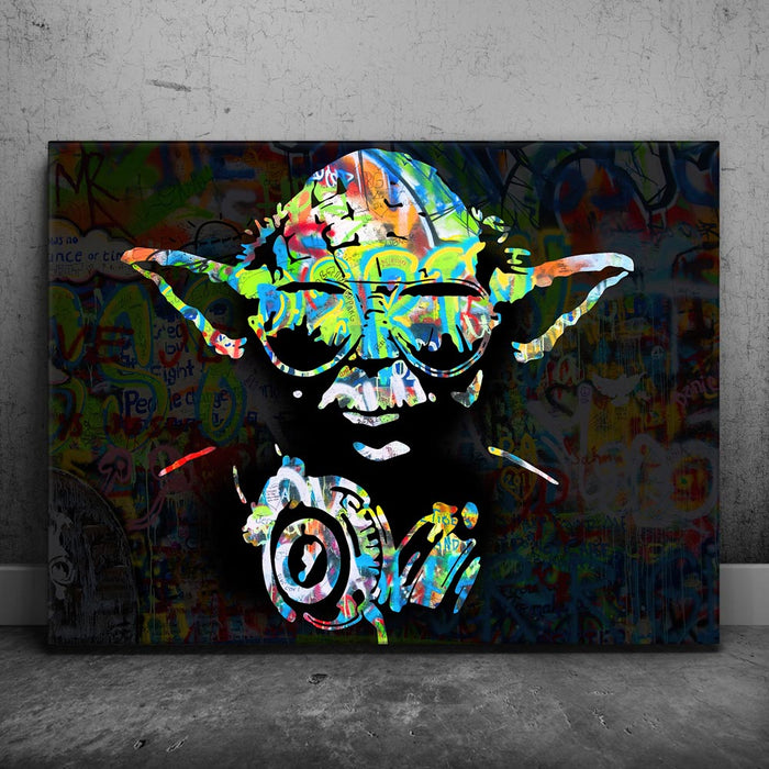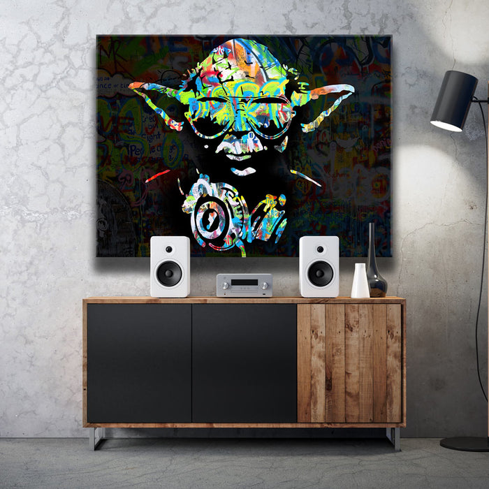 "Force DJ - Graffiti" by Stephen Chambers is a captivating fusion of pop art and graffiti that celebrates the vibrant world of music and the iconic Star Wars universe. This striking artwork features Yoda as a DJ, blending bold colors like orange, green, and blue against a dramatic black backdrop. With its unique portrayal of a beloved character, this piece is a must-have for fans of both Star Wars and music.