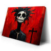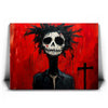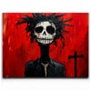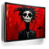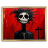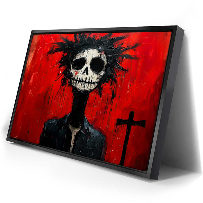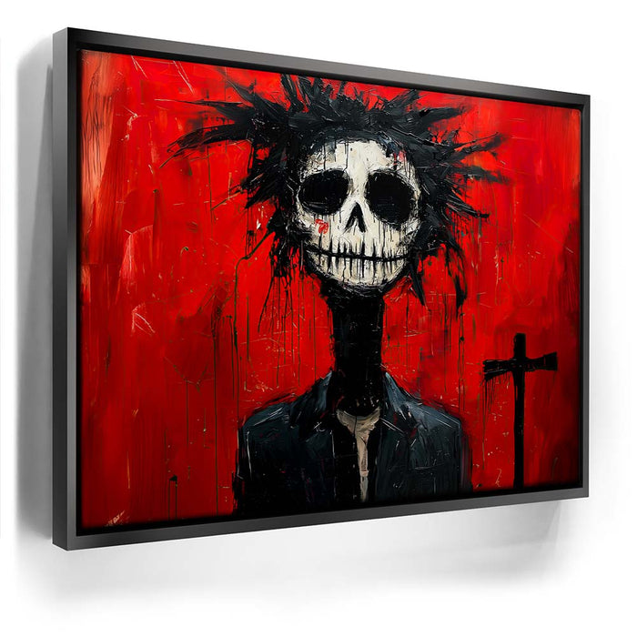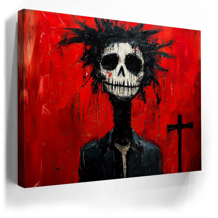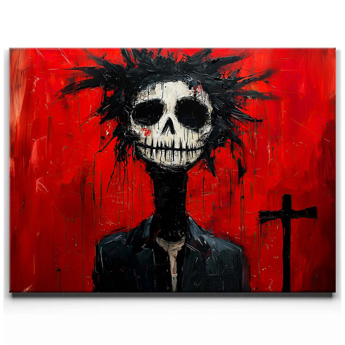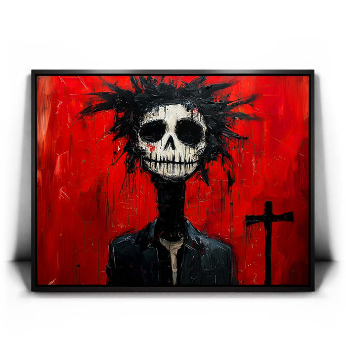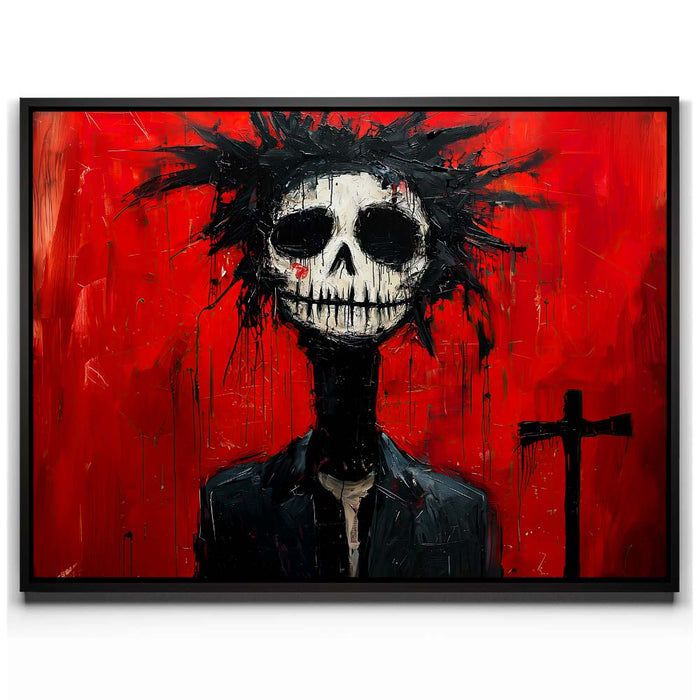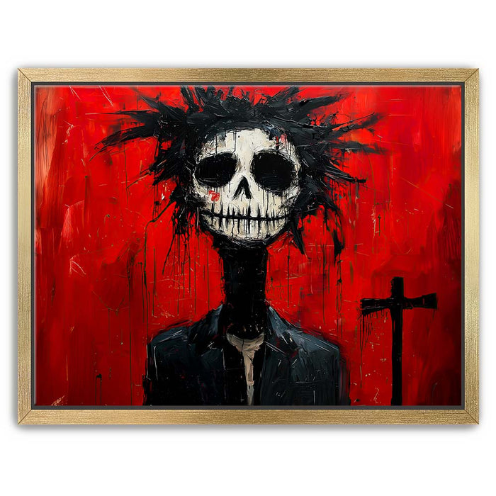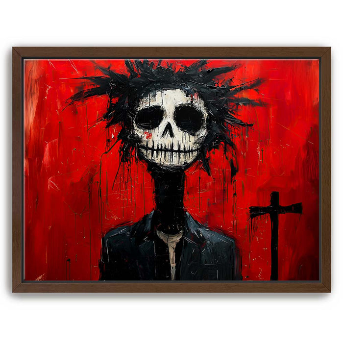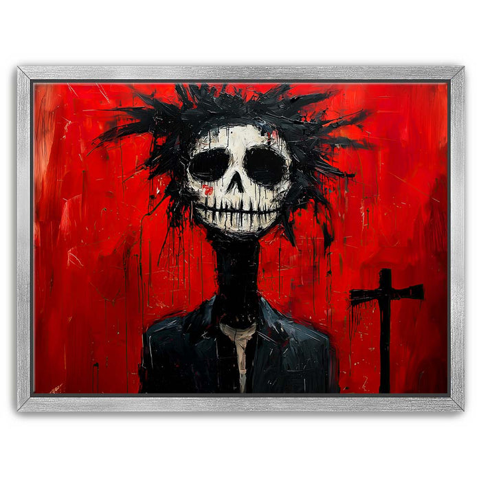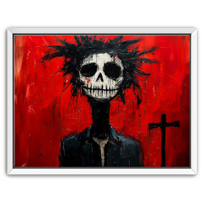 "Fractured Mind" by Kandise King is a hauntingly expressive piece that delves into the complexities of the human psyche. Featuring a skeletal figure with wild, erratic hair against a bold red background, this artwork evokes a raw sense of chaos and emotional turmoil. The dark brushstrokes and dripping textures intensify the unsettling atmosphere, making it a striking exploration of identity and mental disarray.