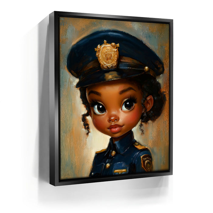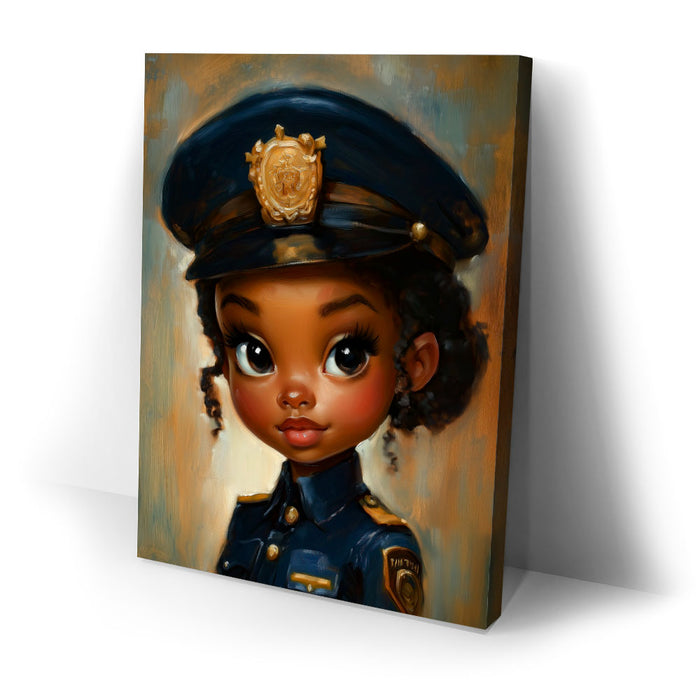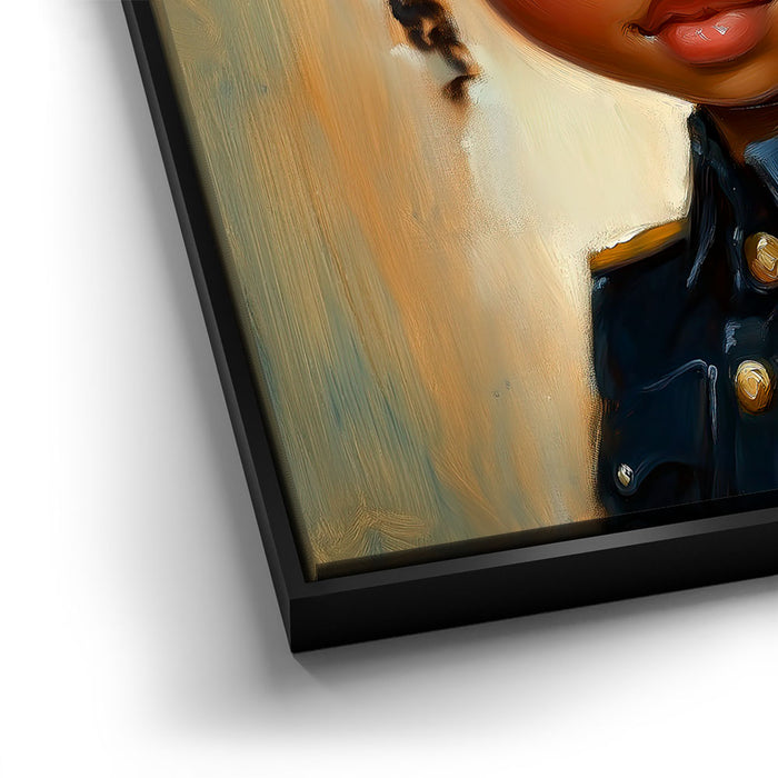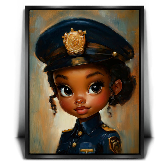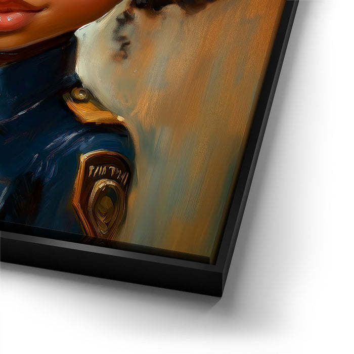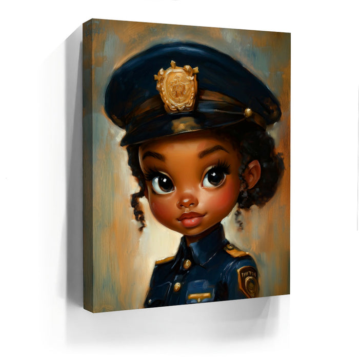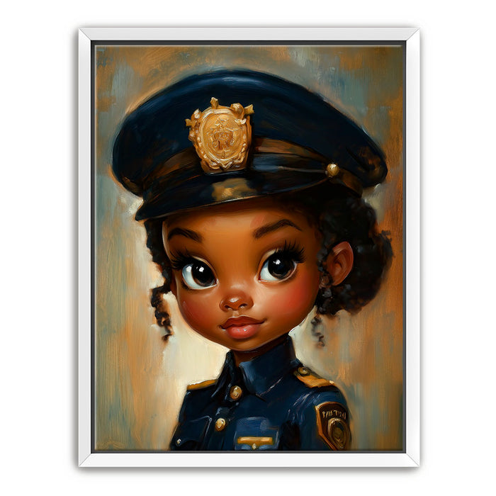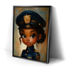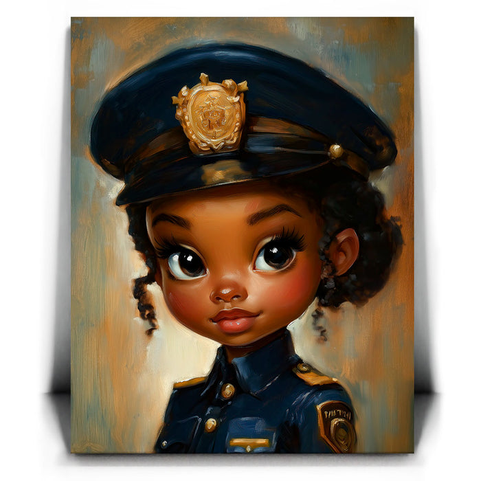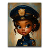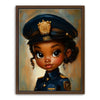 "Future of Justice" by Kandise King is a heartwarming and empowering portrait of a young child wearing a detailed police uniform. With large, expressive eyes and a confident yet endearing expression, the piece symbolizes hope, integrity, and the promise of a brighter future. The warm, textured background complements the subject, adding a touch of timeless charm to the artwork.