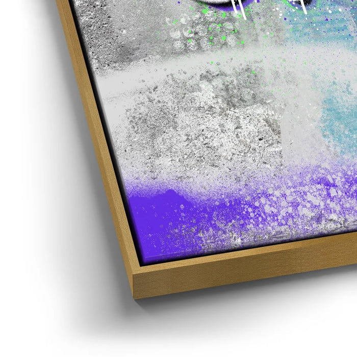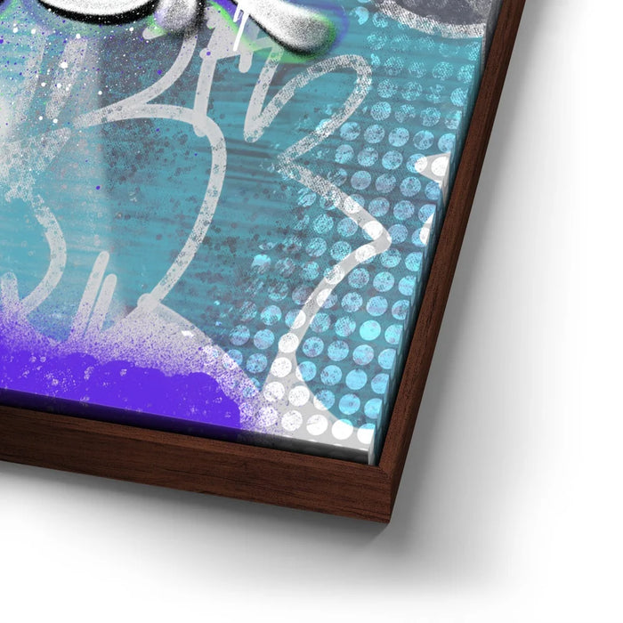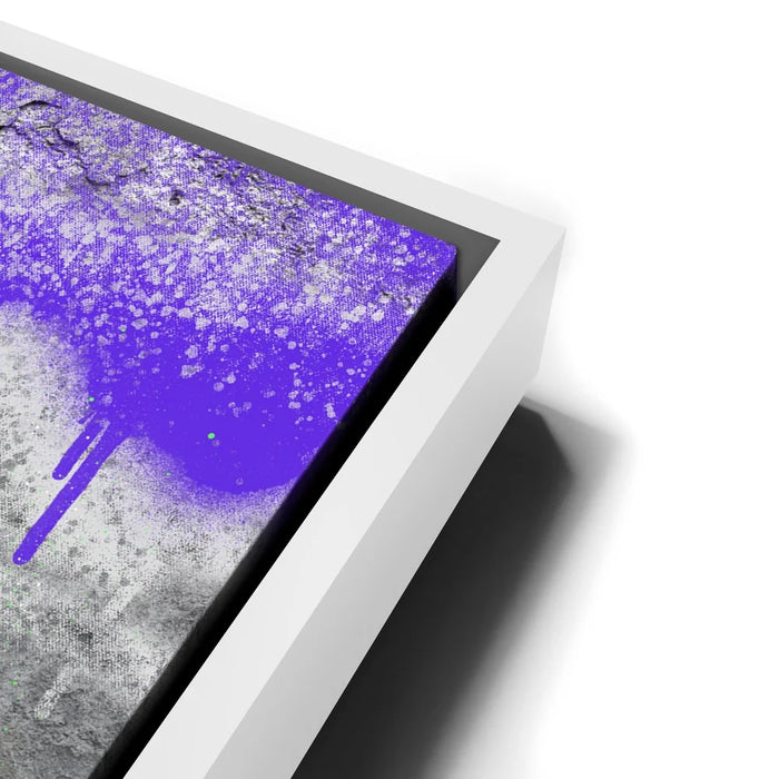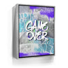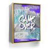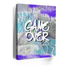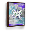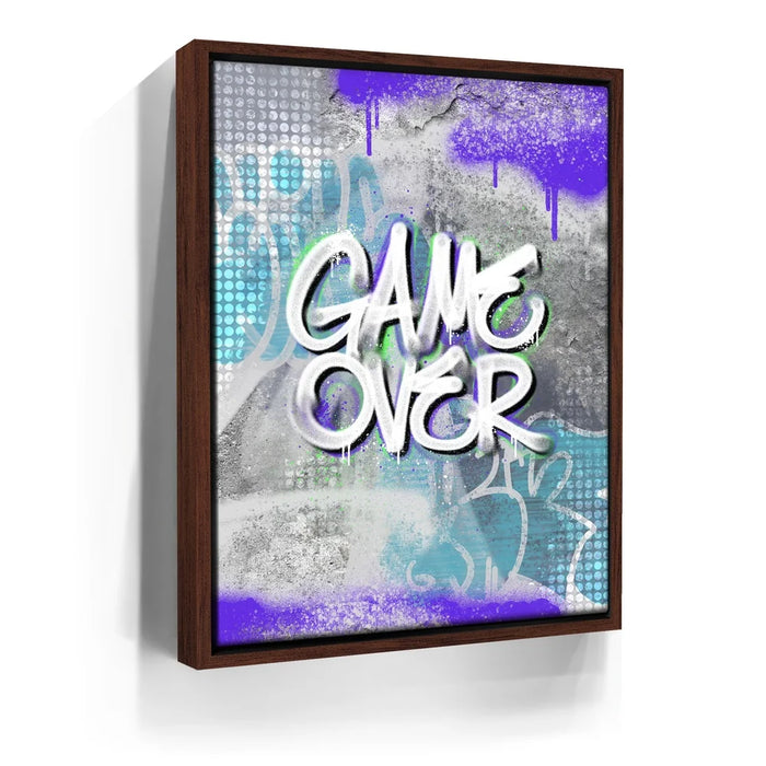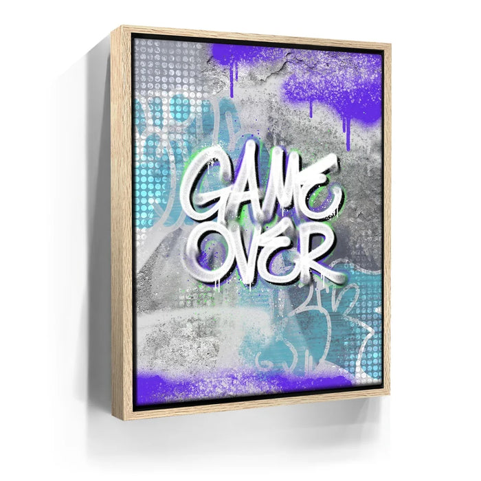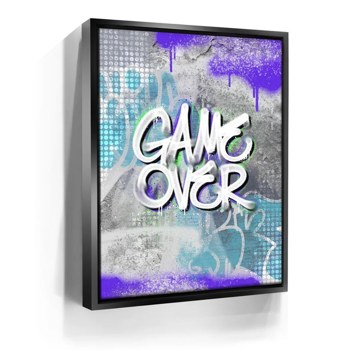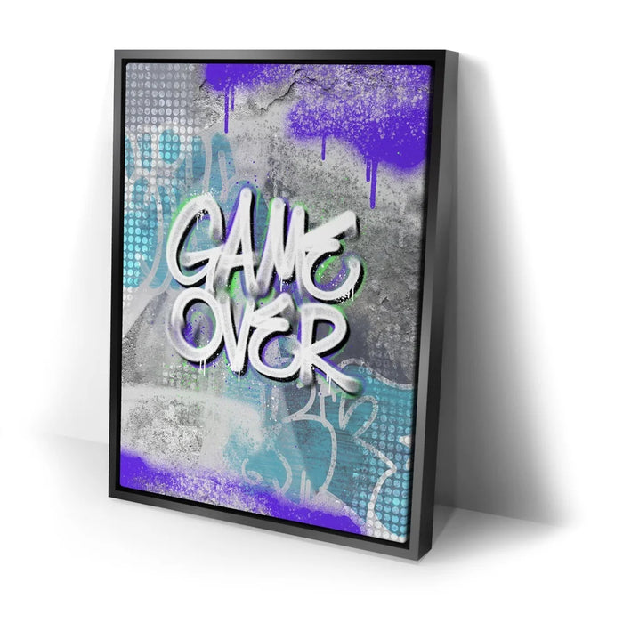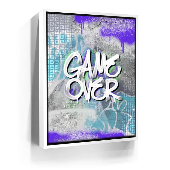 “Game Over – Blue & Purple” explodes with color and street-smart attitude, blending graffiti-style lettering with bold urban textures. The cracked concrete backdrop and dripping spray paint give it the edge of a back-alley mural, while the neon pops of blue, purple, and green infuse it with high-energy contrast.