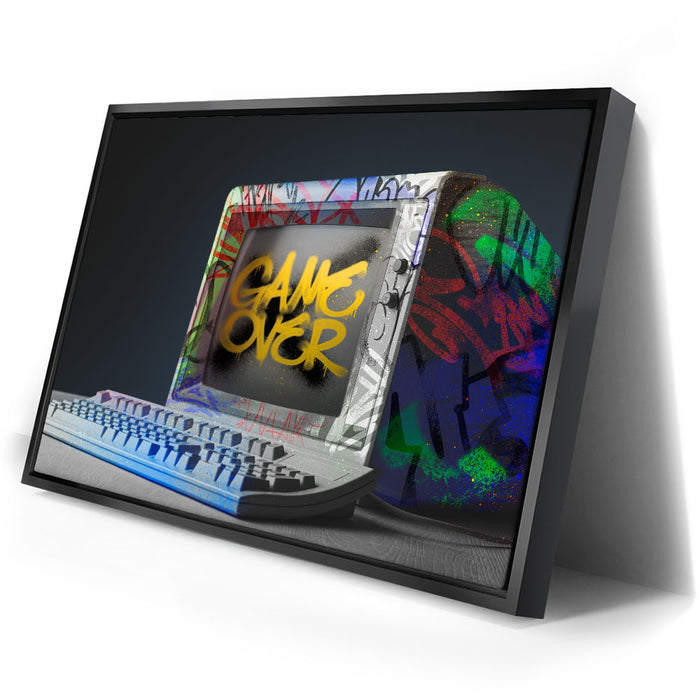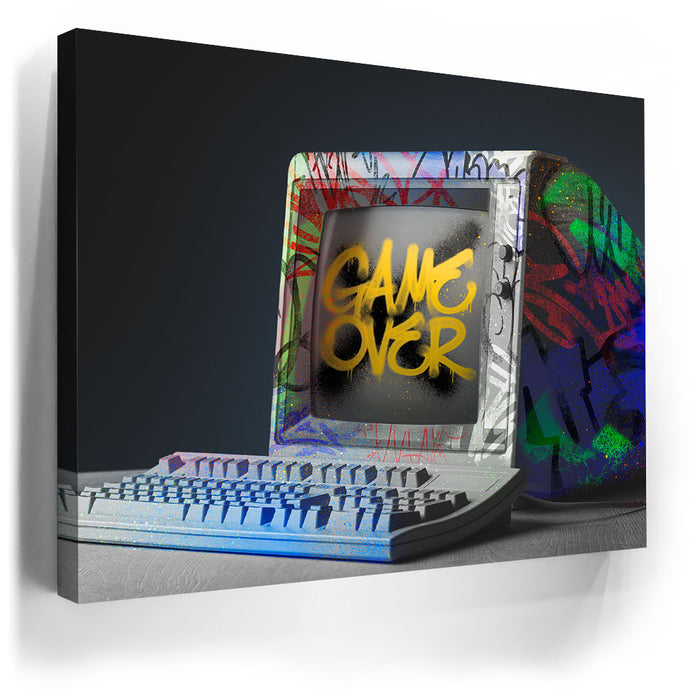“Game Over – PC” is a nostalgic-meets-street-art tribute to retro tech and gaming culture. Featuring an old-school desktop monitor tagged in vibrant graffiti and the words “GAME OVER” sprayed boldly across the screen, this piece merges digital rebellion with urban edge.