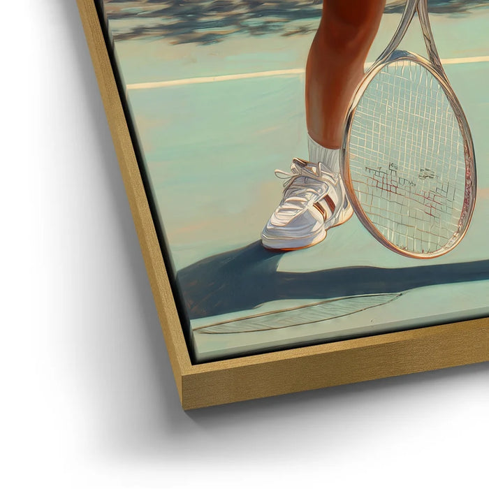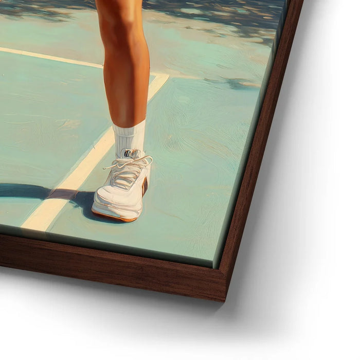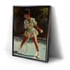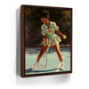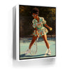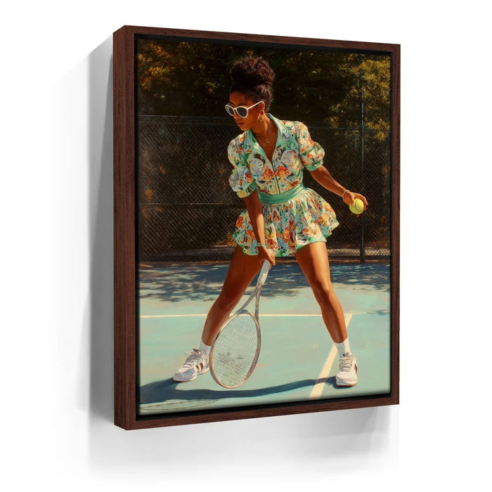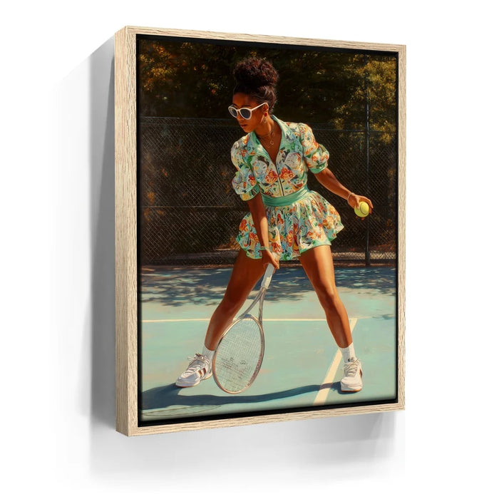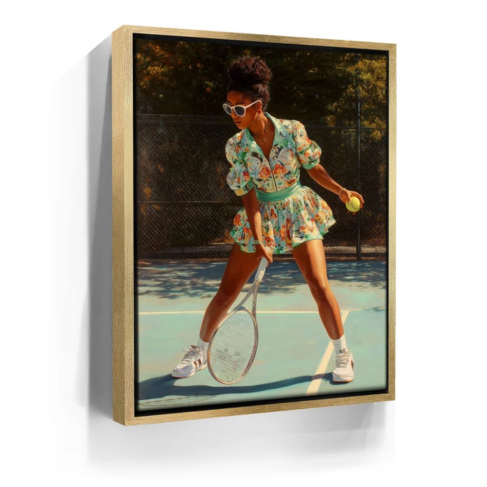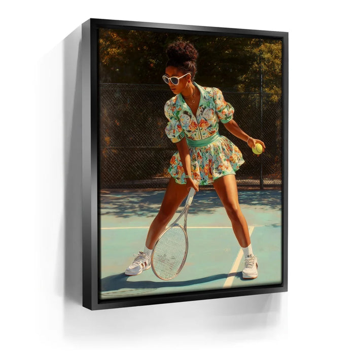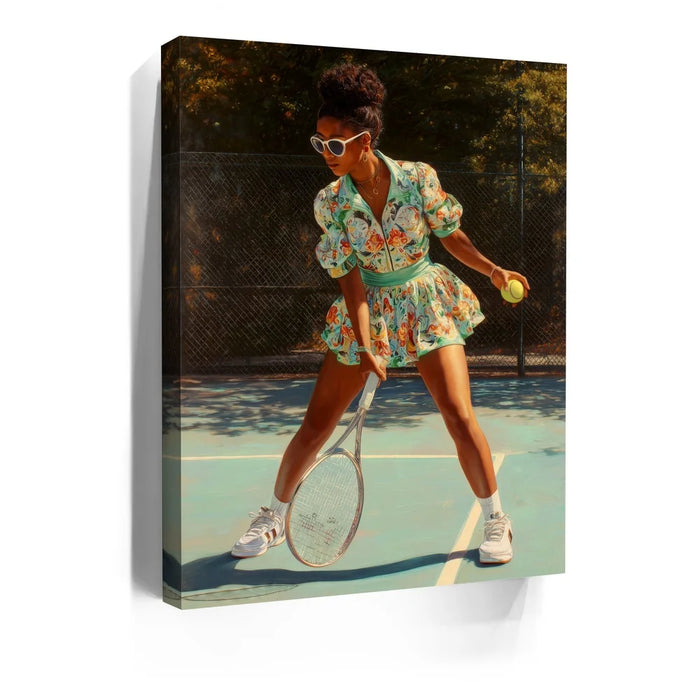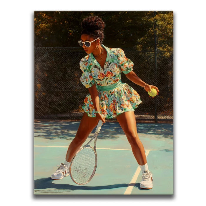 “Garden Match” by Kandise King blends sport, style, and summertime ease into one striking visual. This artwork captures a confident player poised on the court, dressed in a vibrant floral two-piece that turns a tennis match into a full fashion moment. The warm sunlight, soft shadows, and lush background create a scene that feels both nostalgic and effortlessly chic.