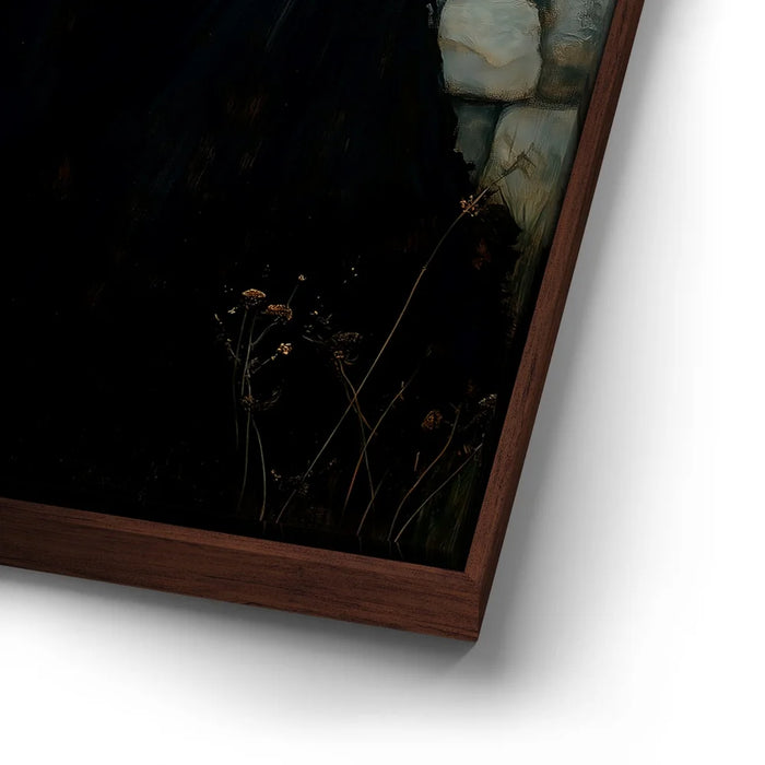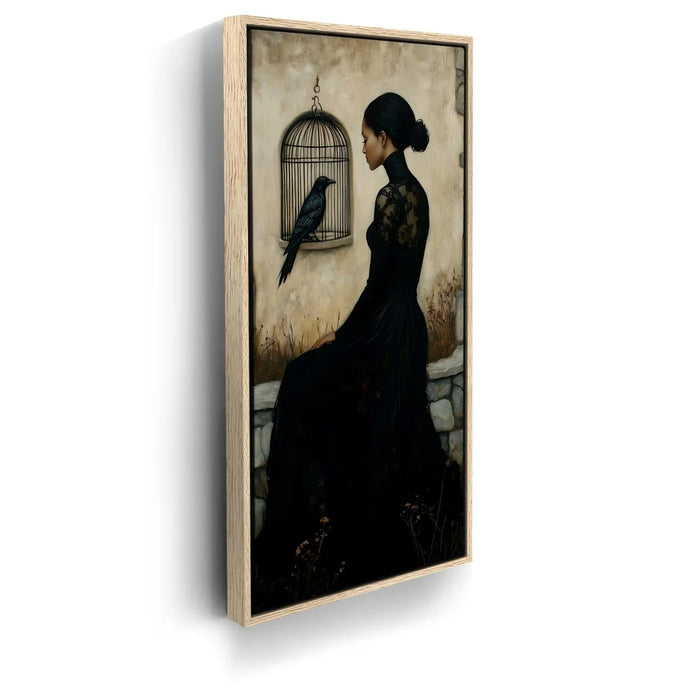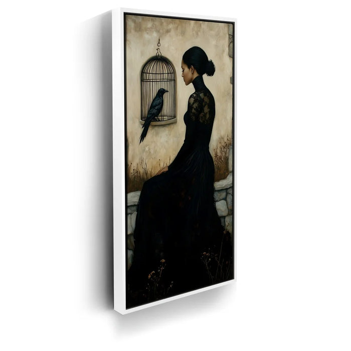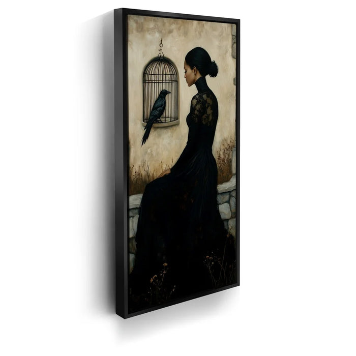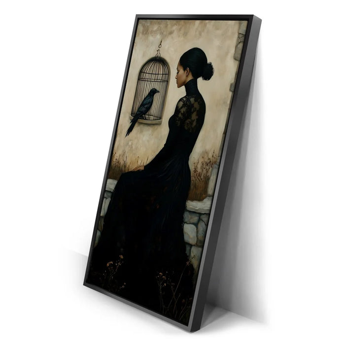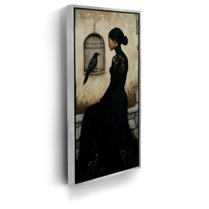 “Gaze Of The Nightbird” by Kandise King is a hauntingly beautiful exploration of mystery and silence. The artwork depicts a woman cloaked in black lace, seated in quiet contemplation before a raven perched beside its cage, creating an atmosphere of elegance tinged with shadow.