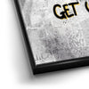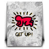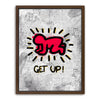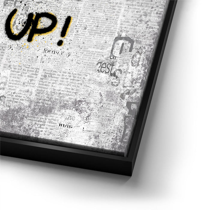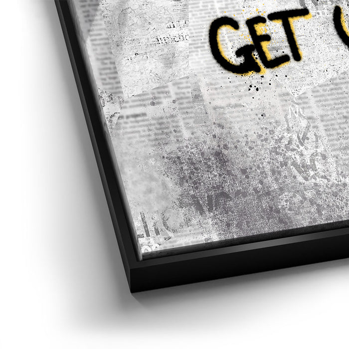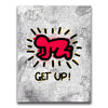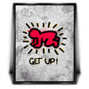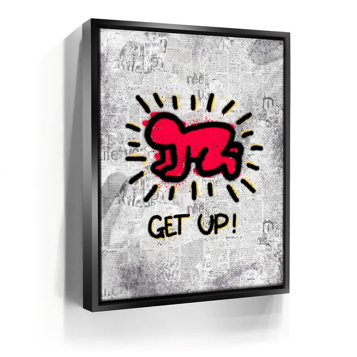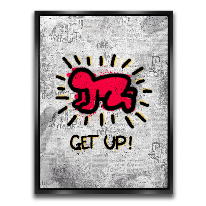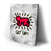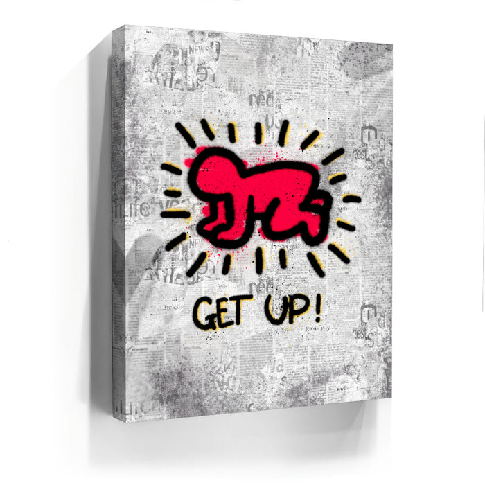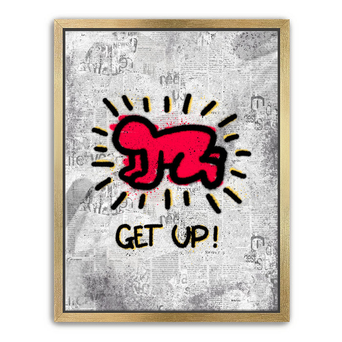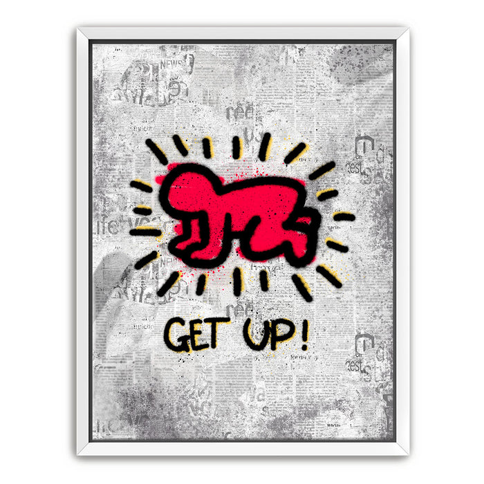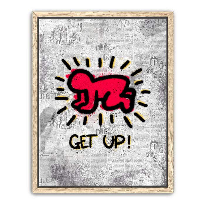 This artwork, titled "Get Up," is a powerful piece of motivational graffiti that merges typography with street art. The bold, red figure in the center is accentuated by vibrant lines and the uplifting message "Get Up!" beneath it, encouraging viewers to rise and take action. This piece is designed to inspire and energize, making it a perfect addition to any space where a boost of positivity is needed.