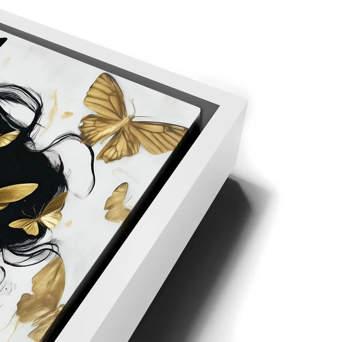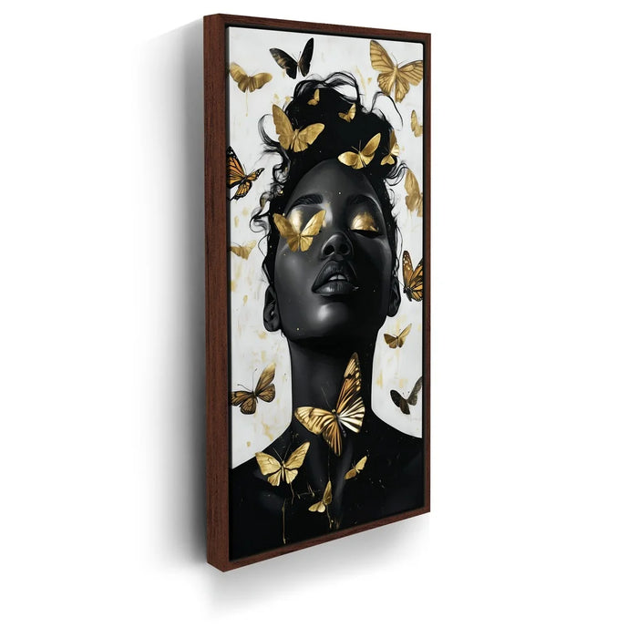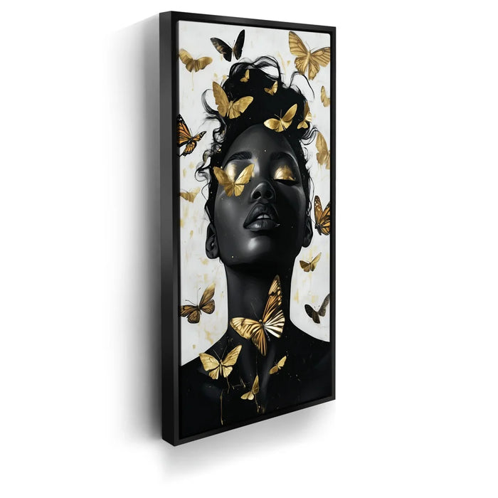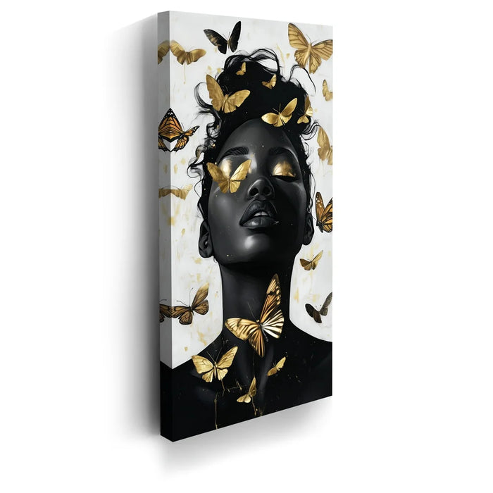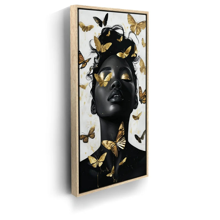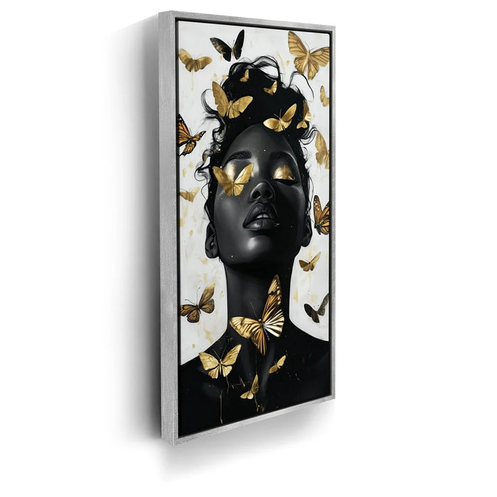 “Gilded Grace” by Kandise King is a stunning celebration of beauty, transformation, and divine strength. The artwork portrays a serene figure with eyes and skin kissed by golden light, surrounded by luminous butterflies that symbolize rebirth and freedom.