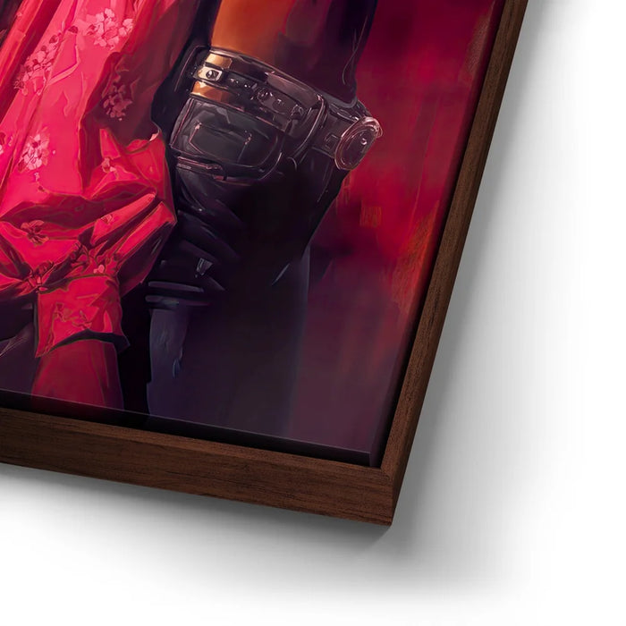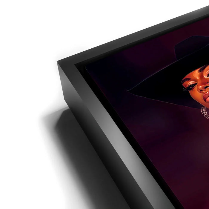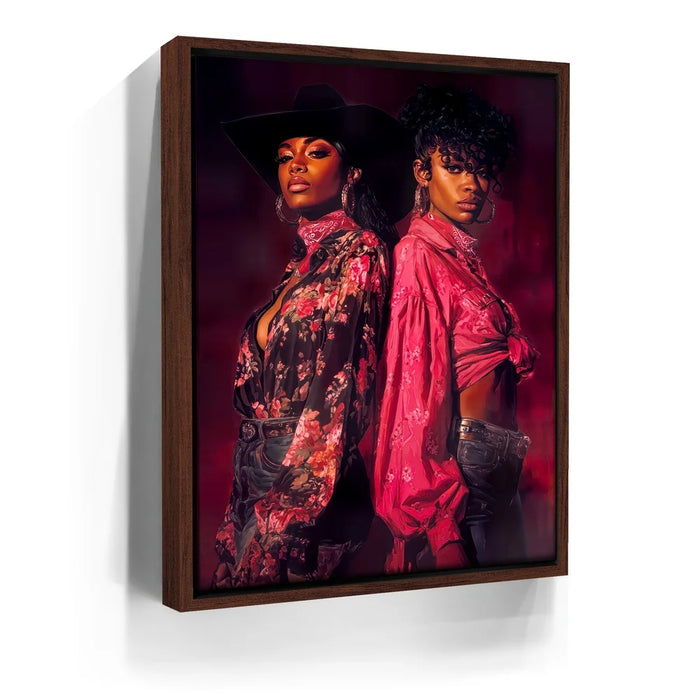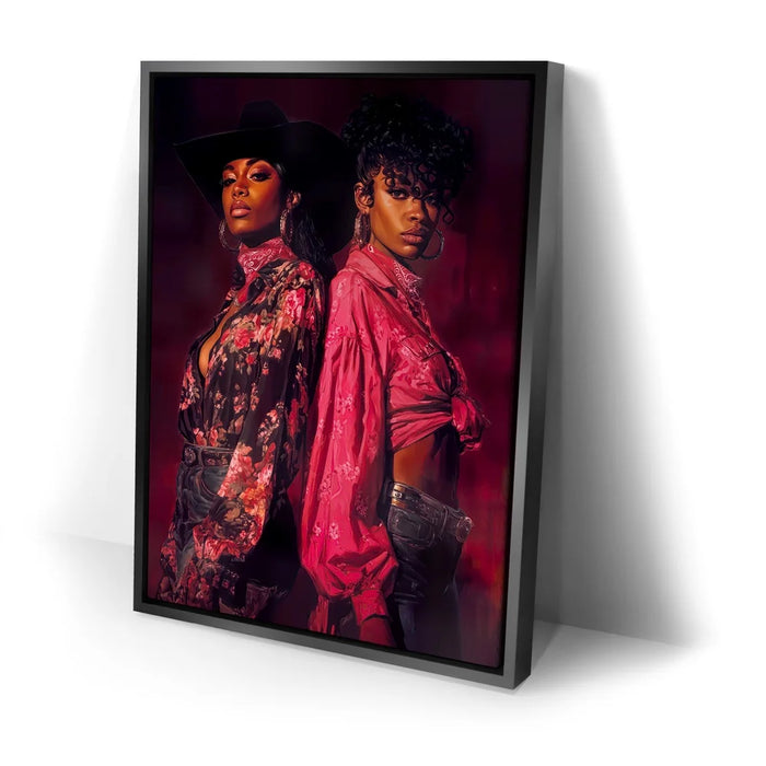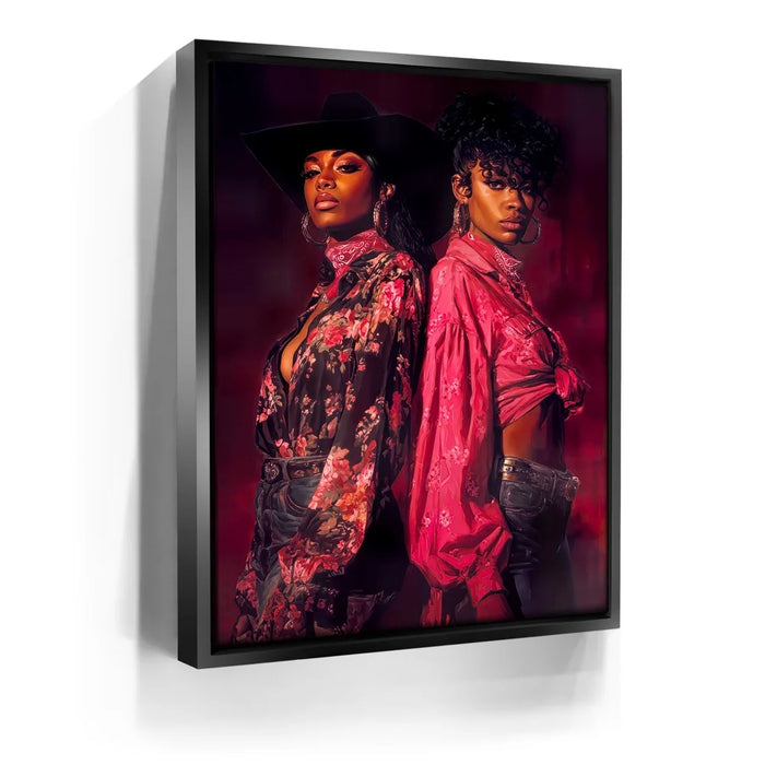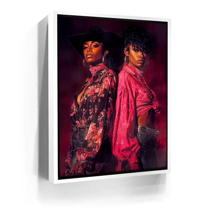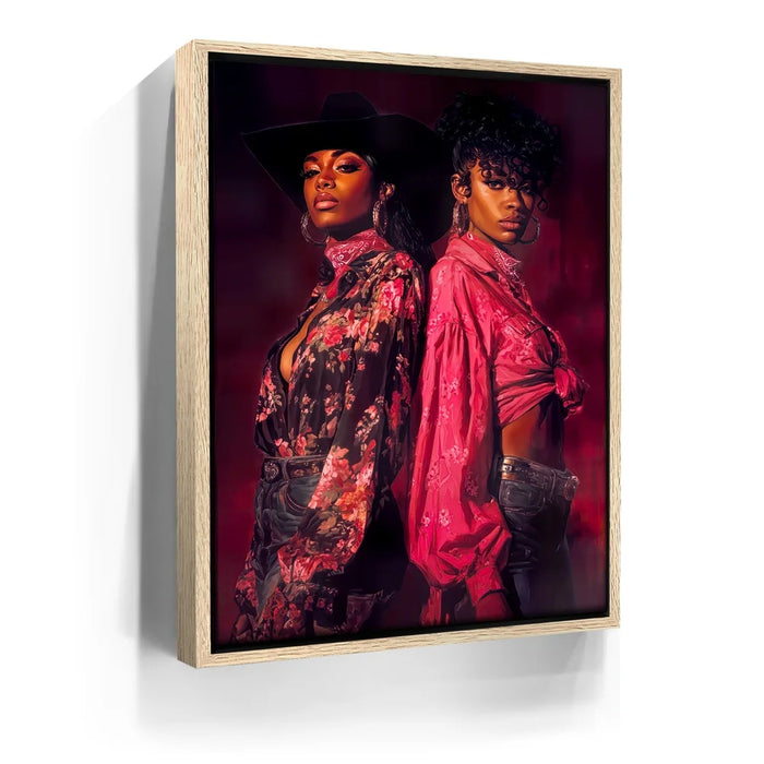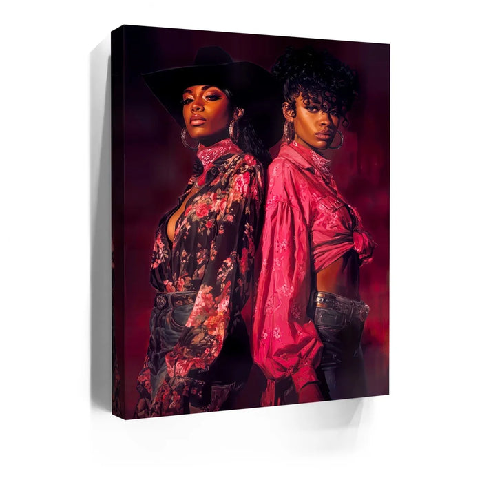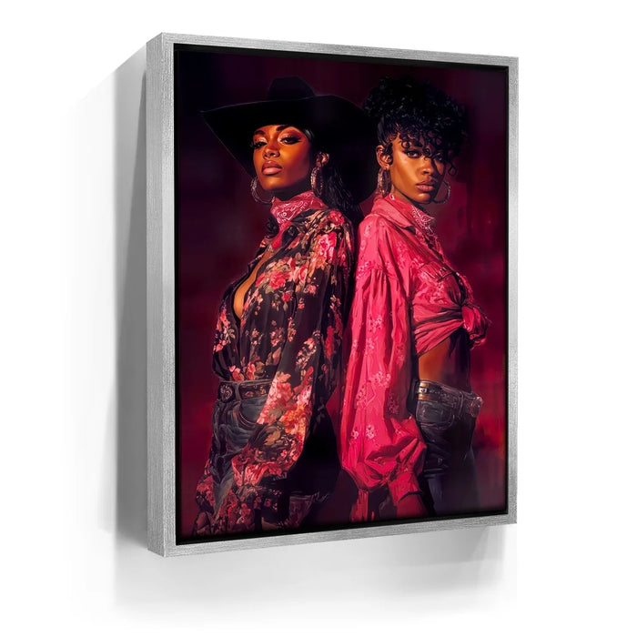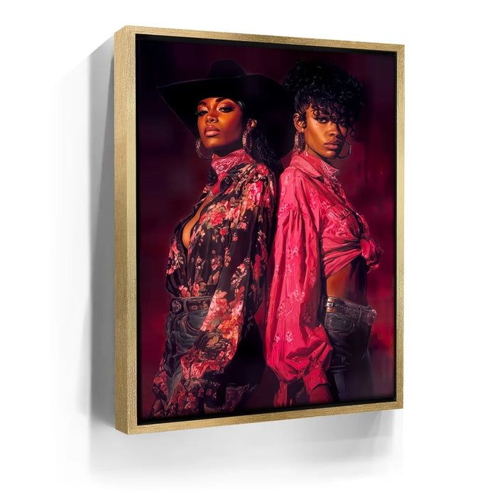 “Gloss & Gunpowder” by Kandise King is a fierce fusion of beauty, strength, and unapologetic style. This bold artwork features two women in striking Western-inspired fashion—one crowned in a wide-brim hat, the other in a knotted blouse—standing back to back with undeniable confidence.