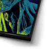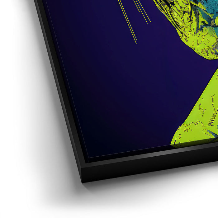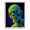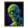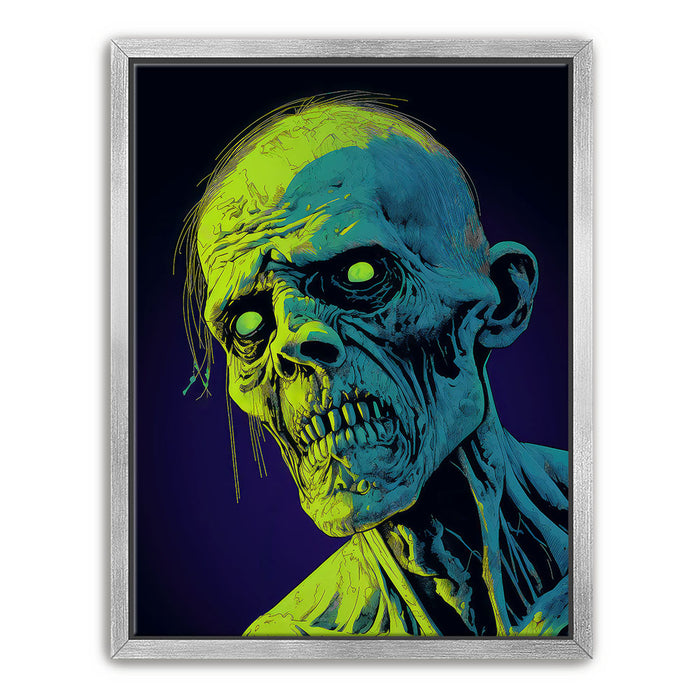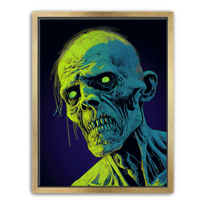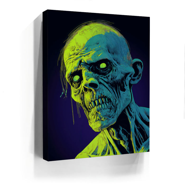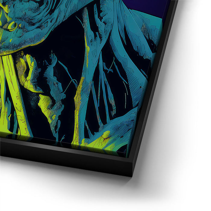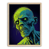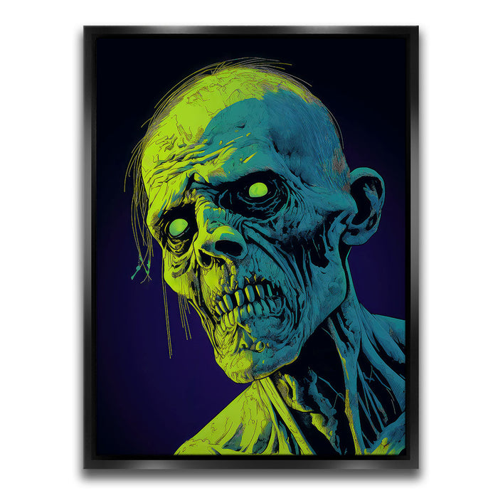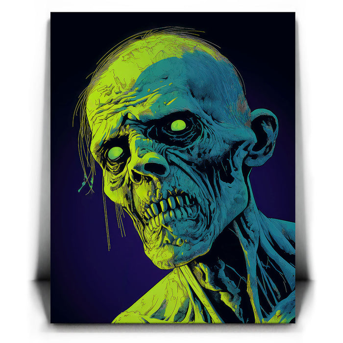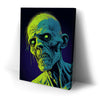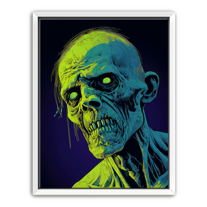 "Glowing Ghoul's Haunting Gaze" by MidJourney.Man brings the macabre to life with vivid neon hues that enhance the eerie stare of a ghoulish figure. The sharp, skeletal features and glowing eyes create a chilling focal point, offering an intense visual experience. The piece stands out for its striking use of color, with glowing green and blue tones against a deep purple background, adding an otherworldly effect.