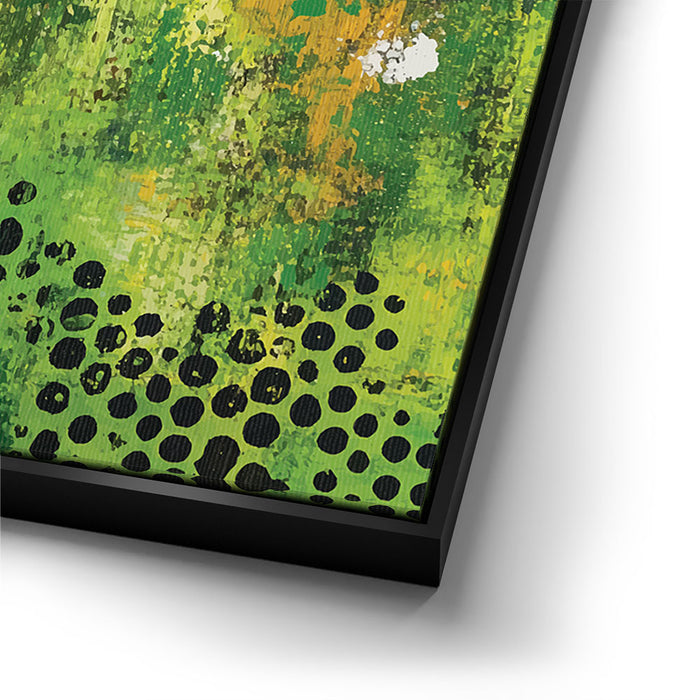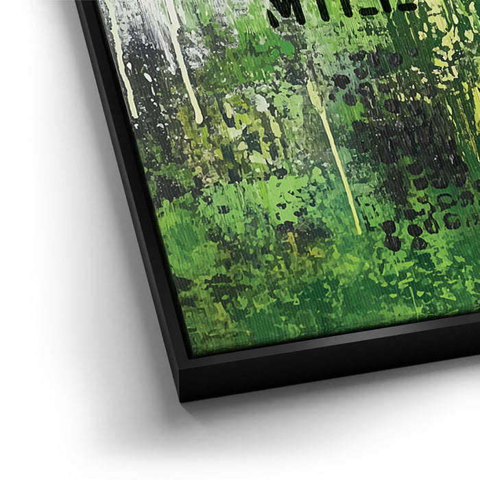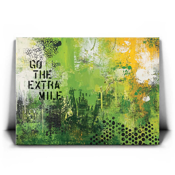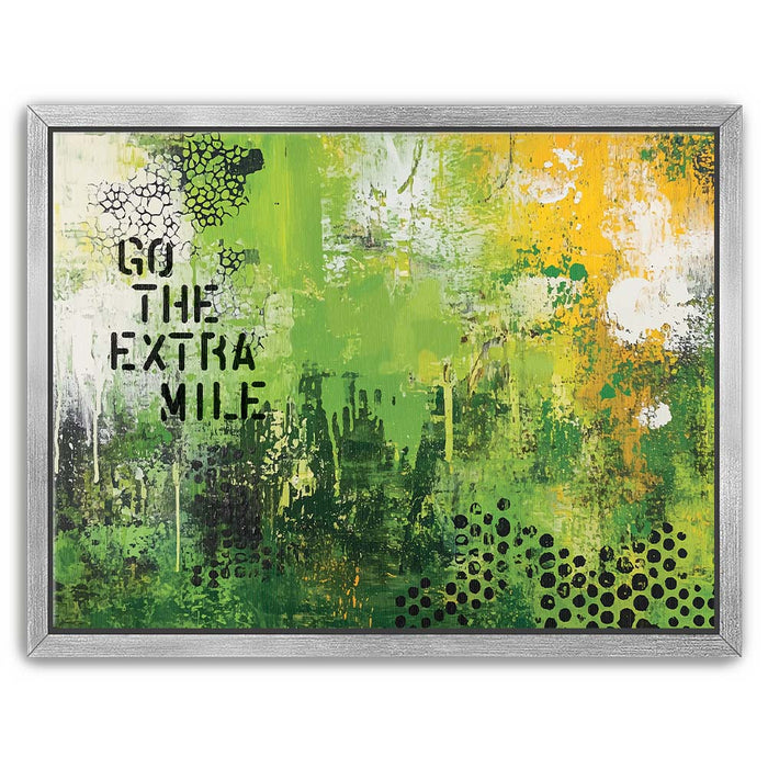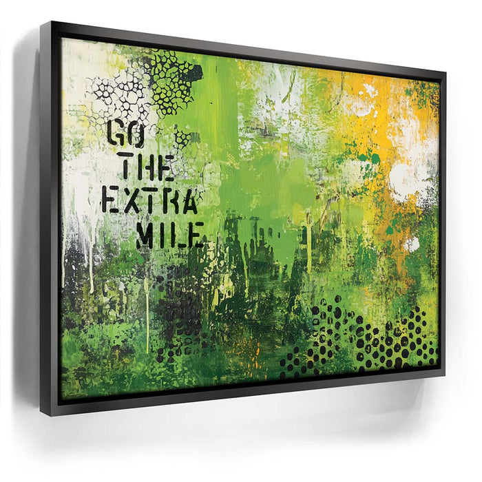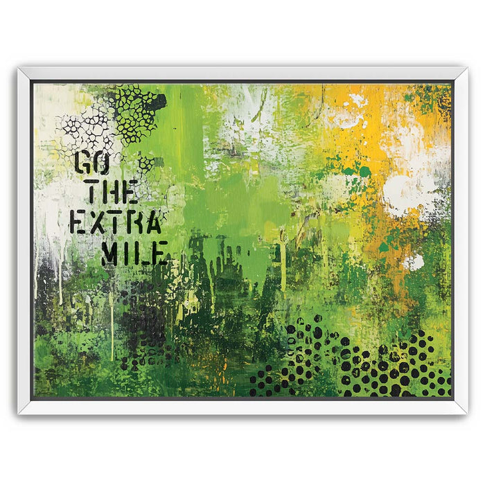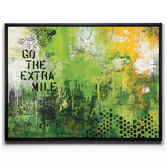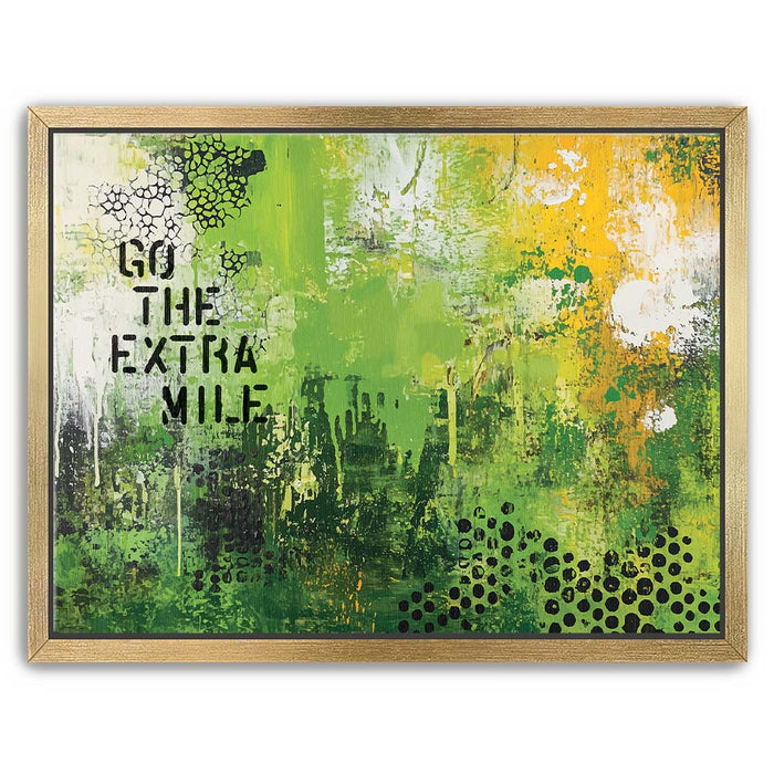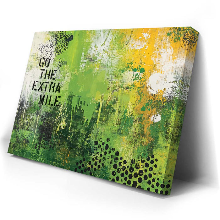 "Go The Extra Mile" is a vibrant abstract artwork that exudes energy and determination through its dynamic green and yellow palette. The bold typography embedded within the textured layers inspires perseverance and ambition, making it a motivational centerpiece for any setting. The interplay of shapes and patterns adds depth, symbolizing growth and the journey of going beyond limits.