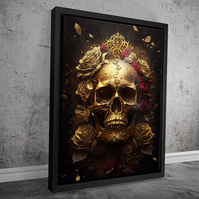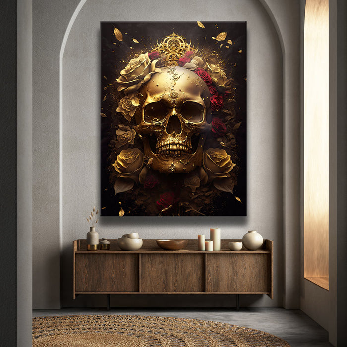 Created by the talented artist Midjourney.man this piece is perfect for those who appreciate bold and symbolic artwork. "Gold Skull Red Roses" serves as a reminder of the fragility of life while celebrating the richness of our experiences, making it an eye-catching focal point for any room.