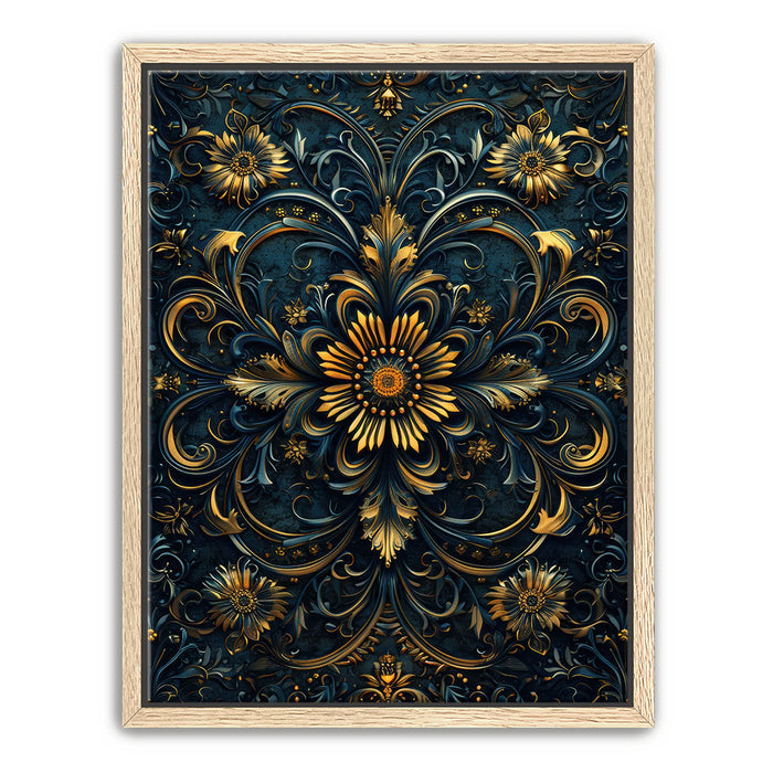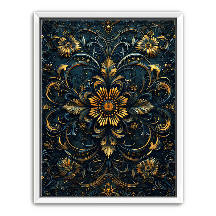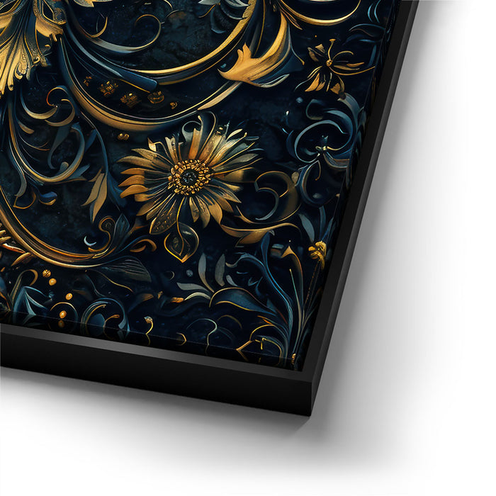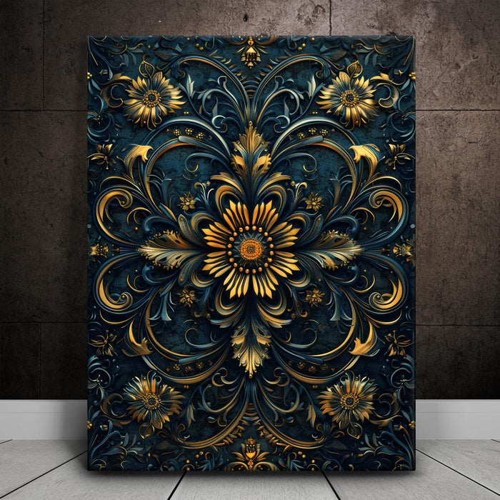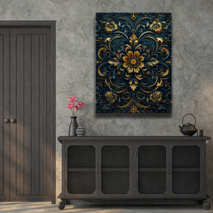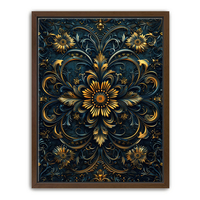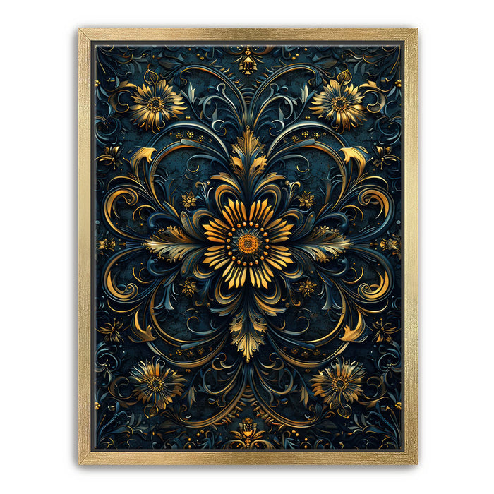 "Golden Bloom" by Arend Pryor is an intricate and elegant piece that merges floral design with a regal color palette. The artwork features golden flowers and swirling leaves set against a dark, rich background, creating a mesmerizing, ornate pattern. The interplay between the detailed golden elements and deep blue tones evokes a sense of luxury and sophistication.