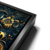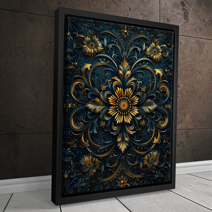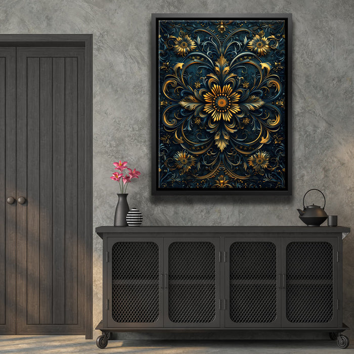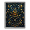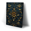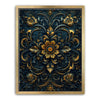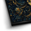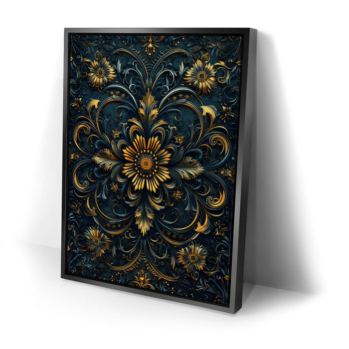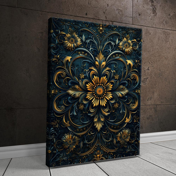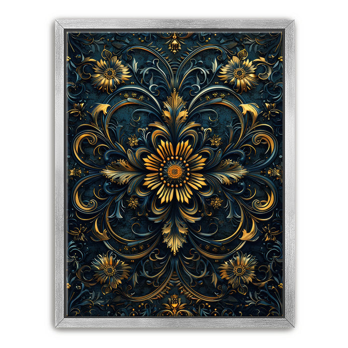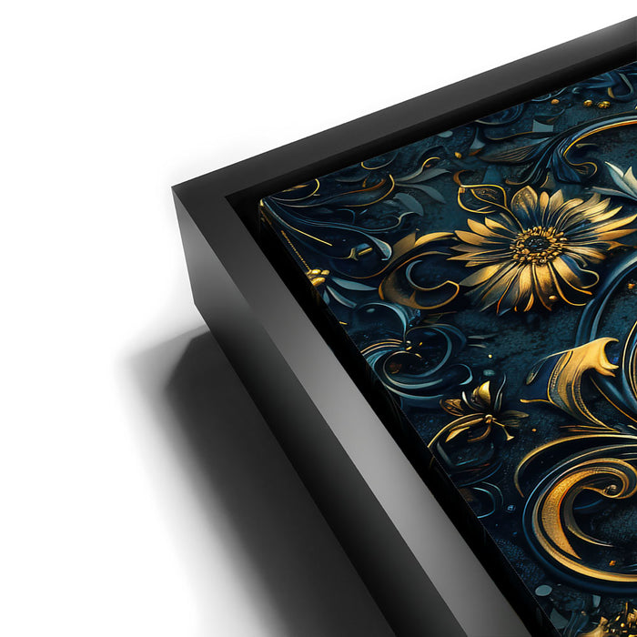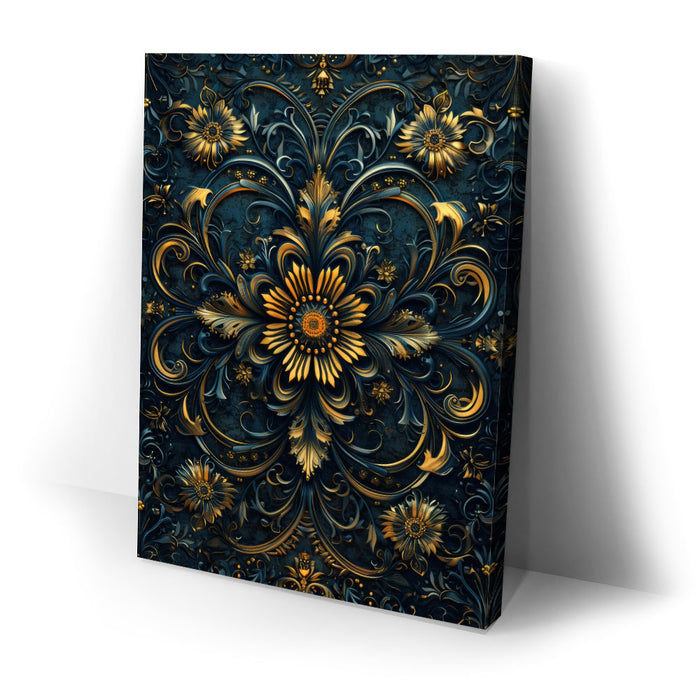 "Golden Bloom" by Arend Pryor is an intricate and elegant piece that merges floral design with a regal color palette. The artwork features golden flowers and swirling leaves set against a dark, rich background, creating a mesmerizing, ornate pattern. The interplay between the detailed golden elements and deep blue tones evokes a sense of luxury and sophistication.