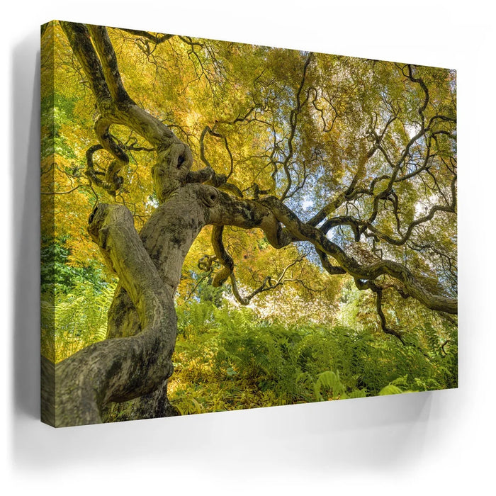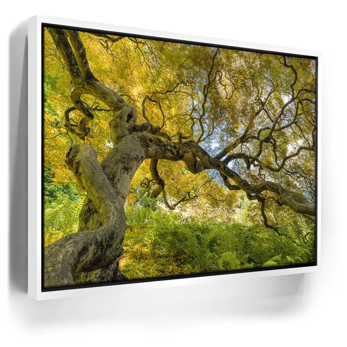 "Golden Canopy" by Barbarossa captures the awe-inspiring view beneath an ancient tree as sunlight filters through leaves of gold and amber. The twisted branches stretch outward like veins of life, creating a natural cathedral of light and shadow.
