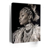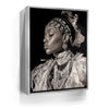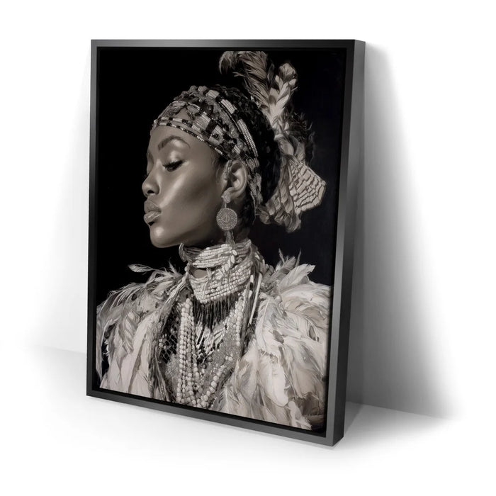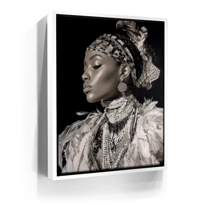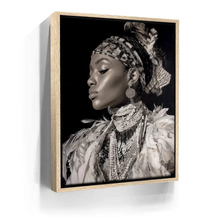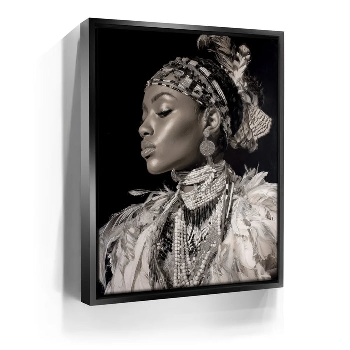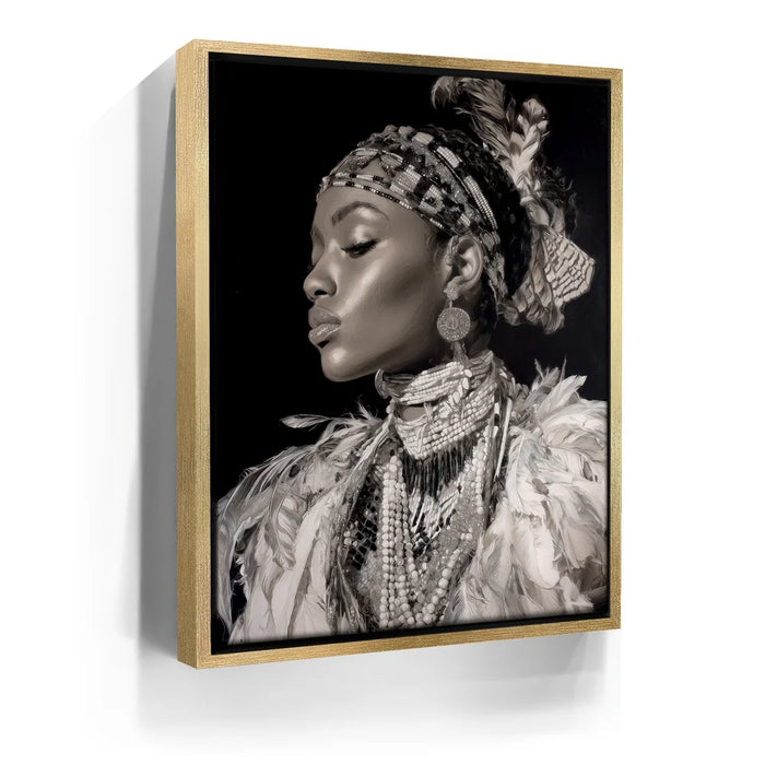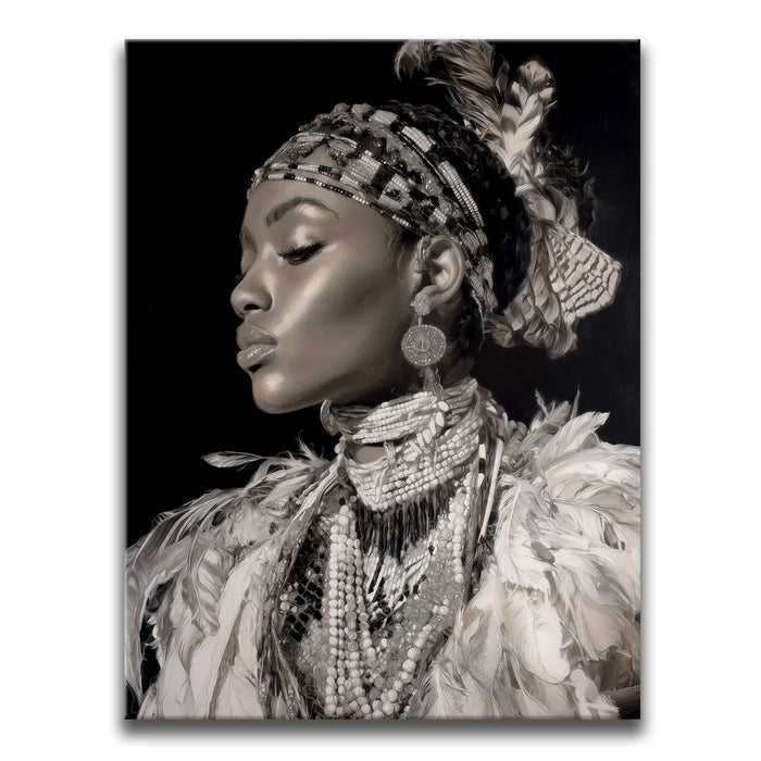 “Grace of Shadows” by Kandise King blends regal beauty with dramatic contrast as the subject emerges from deep monochrome lighting. Beaded adornments, feathers, and textured fabrics create an air of cultural richness, while her poised expression adds a sense of strength and quiet authority. The shadows sculpt her form, giving the portrait a timeless, museum-quality presence.