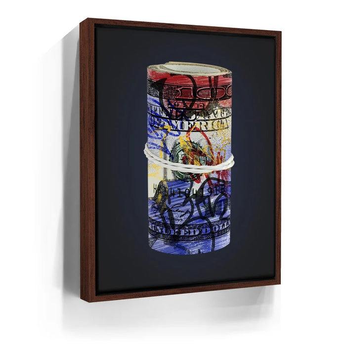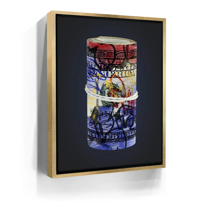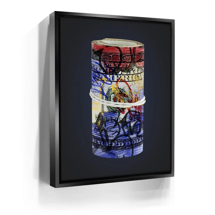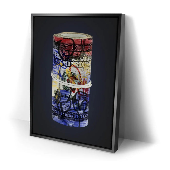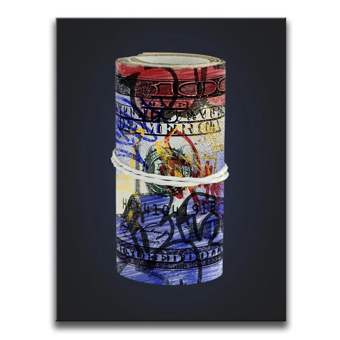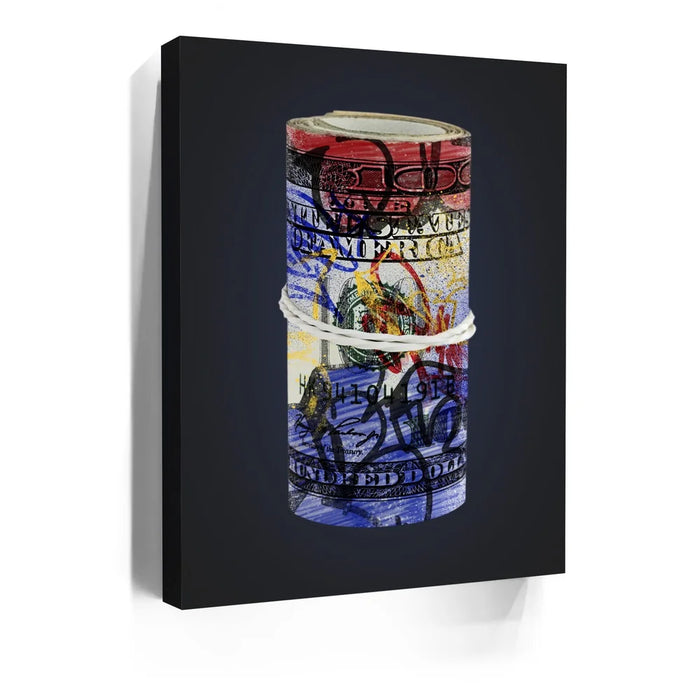 Graffiti Money Roll merges the raw pulse of street art with the universal symbol of ambition and hustle. A tightly wound roll of cash is splashed with layers of graffiti, blending rebellion, success, and creativity in one bold statement. The vibrant reds, blues, and yellows pop against the dark background, creating a powerful visual metaphor for the grind — where art meets aspiration. This striking piece embodies urban energy, making it a perfect reflection of modern hustle culture and self-made determination.