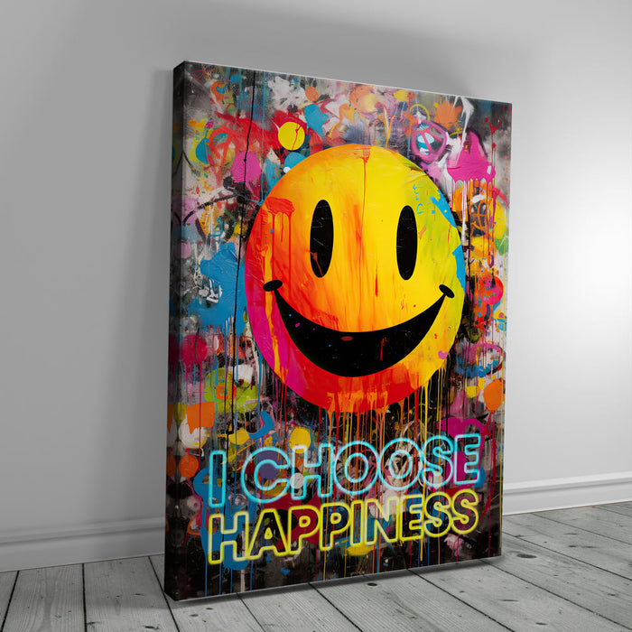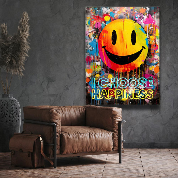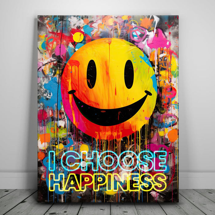 "Graffiti Smiley - I Choose Happiness" is a vibrant celebration of positivity and street art, featuring a colorful smiley face surrounded by playful paint splatters. This bold and uplifting piece combines urban graffiti style with an inspiring message, making it a perfect addition to modern or eclectic spaces.
