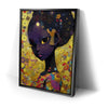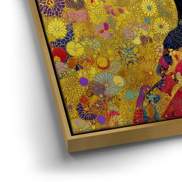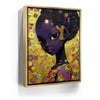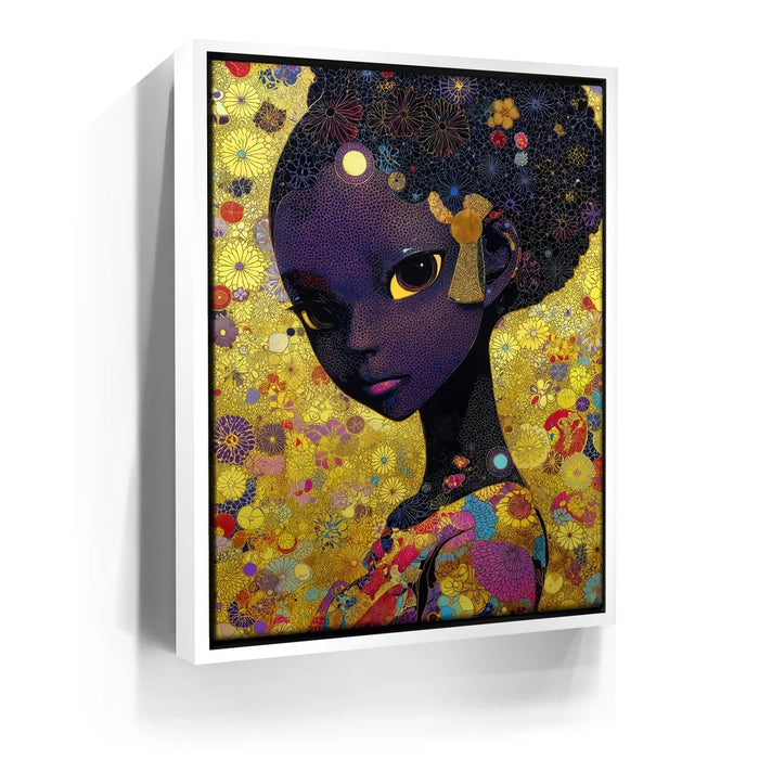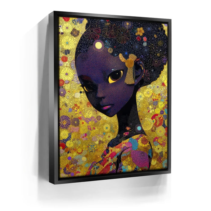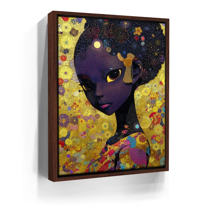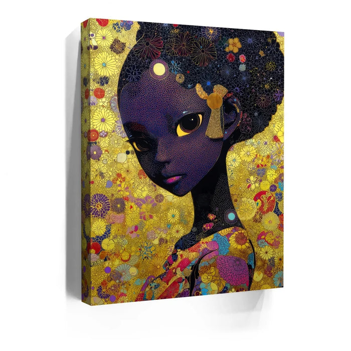 “Galactic Rosechild” by Kandise King is a luminous fusion of fantasy, culture, and celestial wonder. The piece radiates with golden blooms and cosmic geometry, framing a young Black girl whose gaze feels ancient and infinite. Her deep violet skin glows against a field of stardust florals, symbolizing both earthly beauty and otherworldly grace.