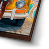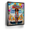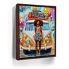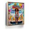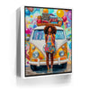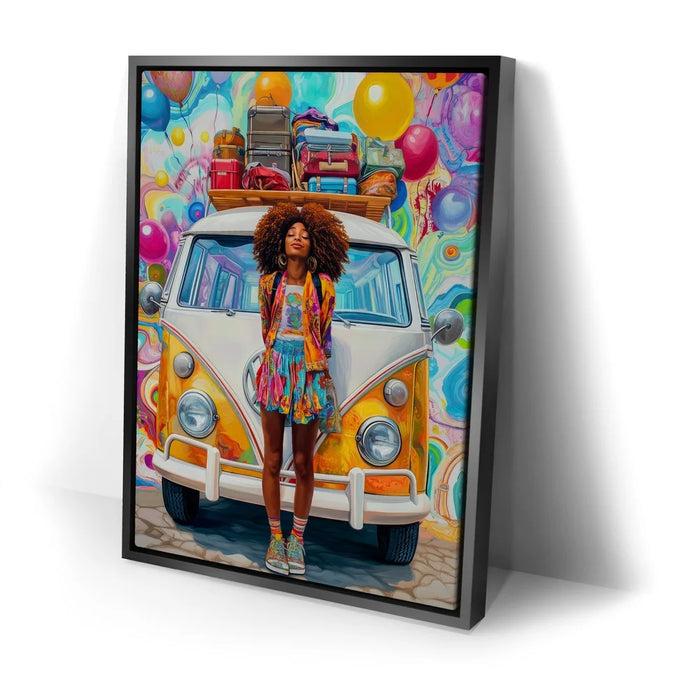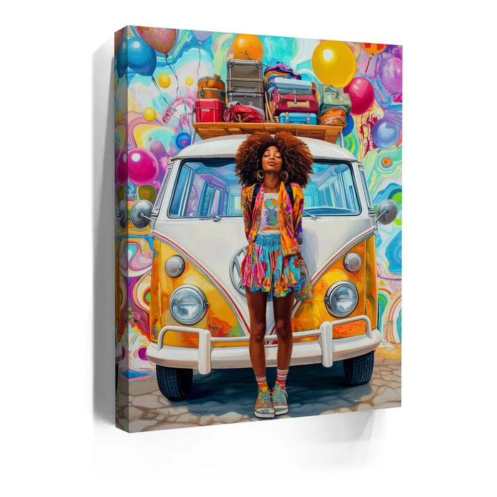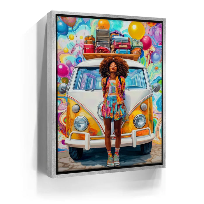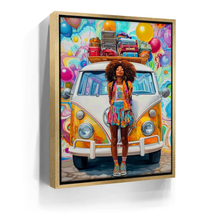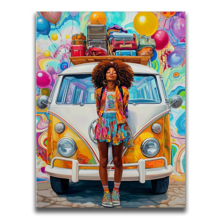 “Groovy Departure” by Kandise King radiates pure joy and youthful freedom as a stylish traveler stands proudly in front of a retro van stacked with luggage. The swirling background and bold patterns add movement and vibrancy, turning the moment into a celebration of adventure and individuality. Her carefree stance captures the spirit of going wherever life leads.