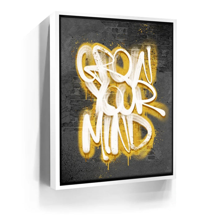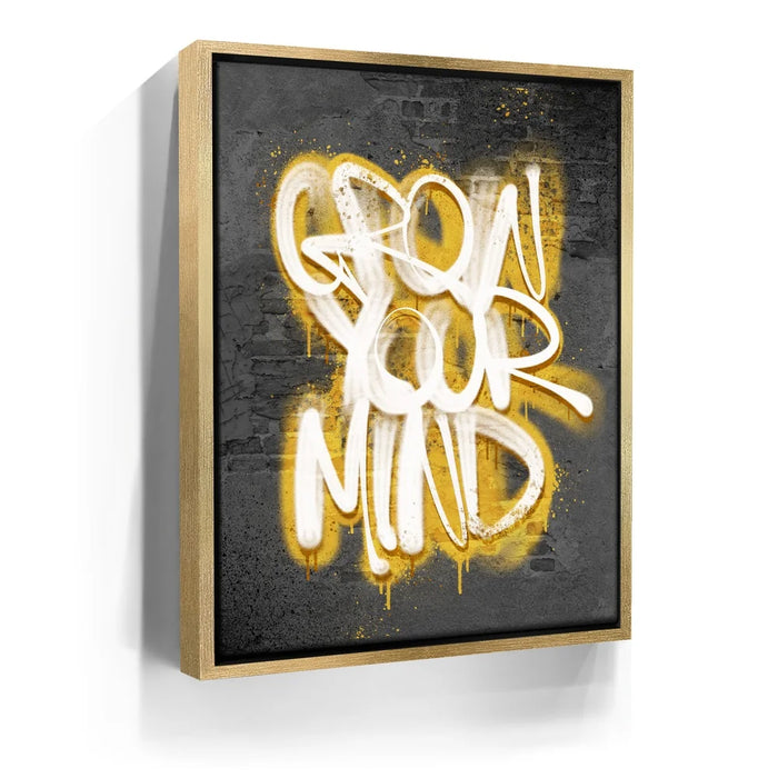 Grow Your Mind - Graffiti Gold radiates confidence and creativity, blending raw street art energy with motivational flair. The striking gold spray-paint lettering pops against a rugged concrete background, symbolizing wisdom, success, and growth. This bold urban artwork brings inspiration and edge to any modern space — perfect for offices, studios, or anyone chasing excellence.