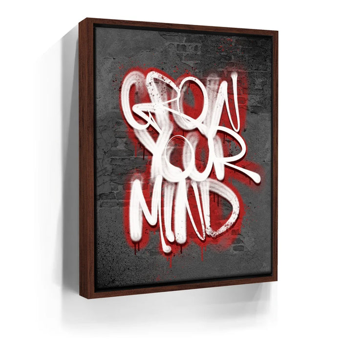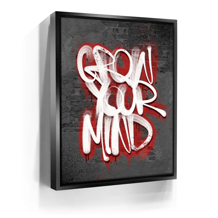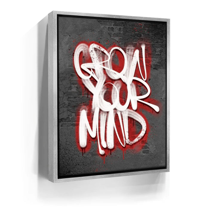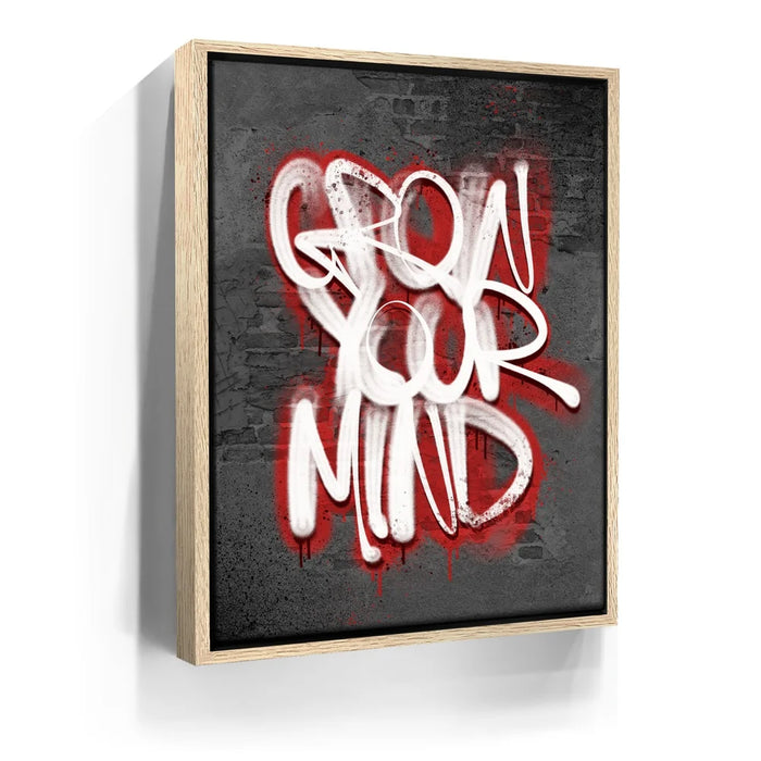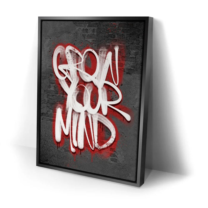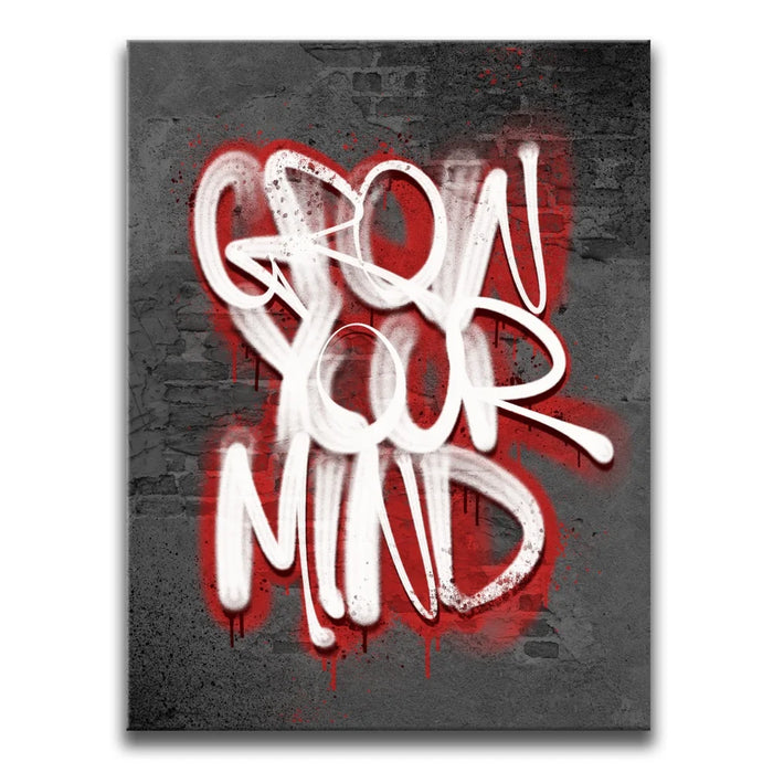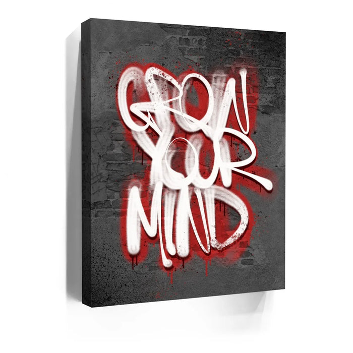 Grow Your Mind - Graffiti Red bursts with urban attitude and raw inspiration. Featuring bold, spray-painted typography layered over a textured concrete wall, this street art piece commands attention with its red and white contrast. It’s a reminder to stay curious, keep learning, and push boundaries — perfect for creative spaces, studios, or modern home offices seeking a motivational edge.
