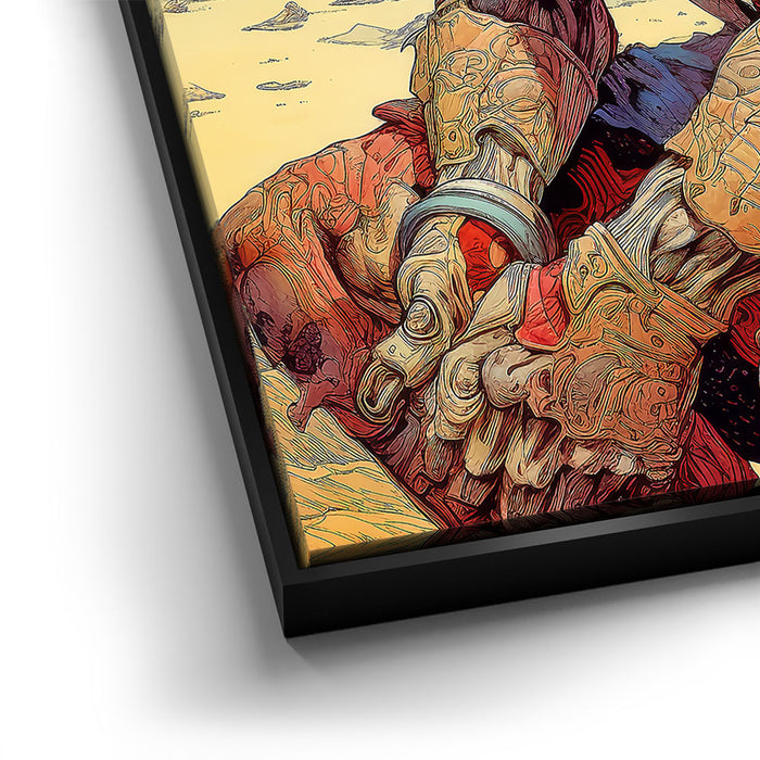 "Guardian of the Dunes" by MidJourney.Man features a dystopian, skeletal warrior clad in intricately detailed armor. The mixture of organic and mechanical elements, combined with the red and sandy tones, gives the figure an imposing yet hauntingly beautiful appearance. The art depicts the lone figure guarding a barren desert landscape, its stoic expression enhanced by the vivid textures and desolate surroundings.