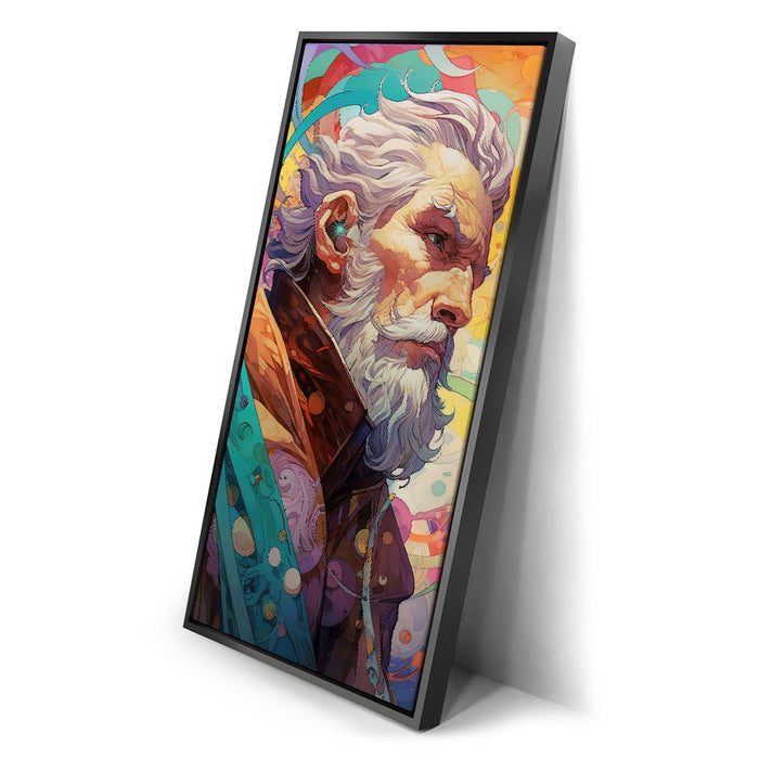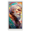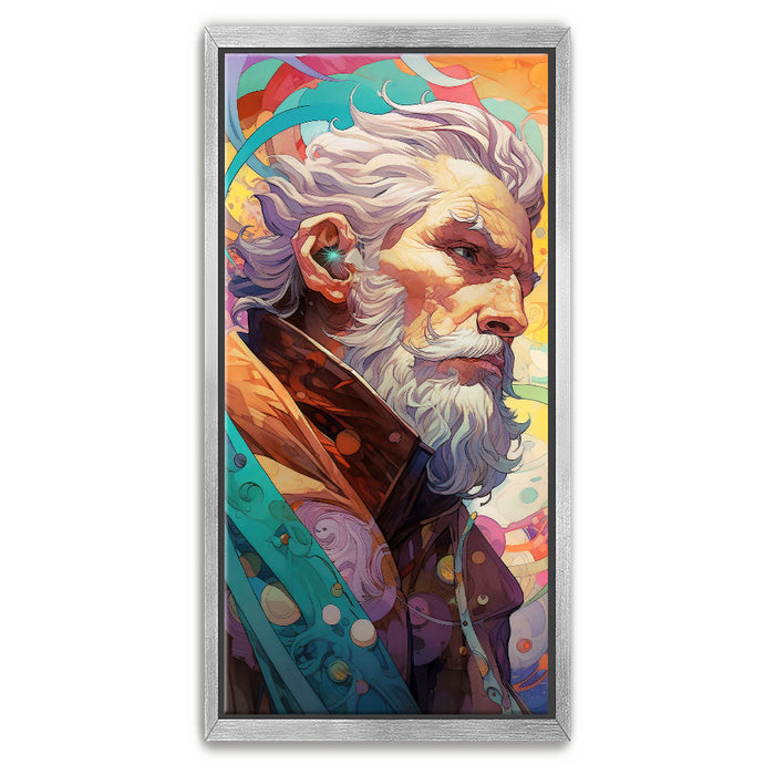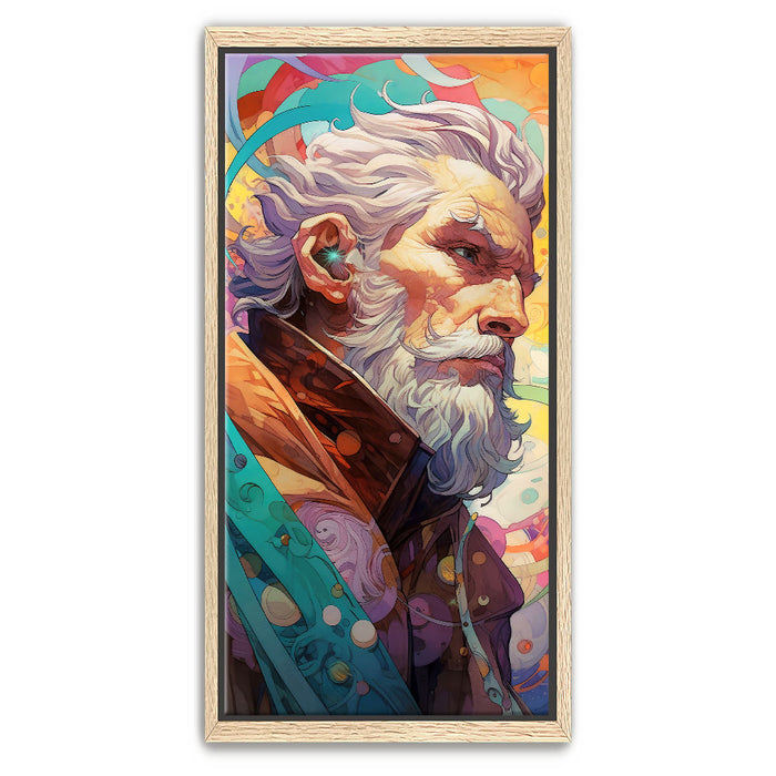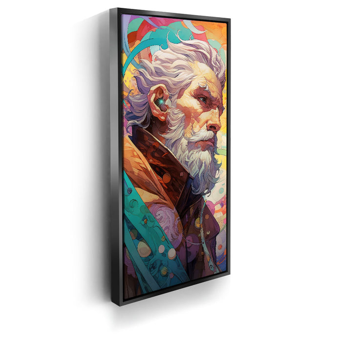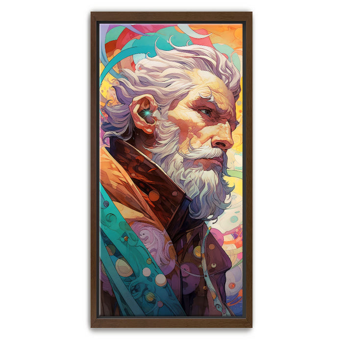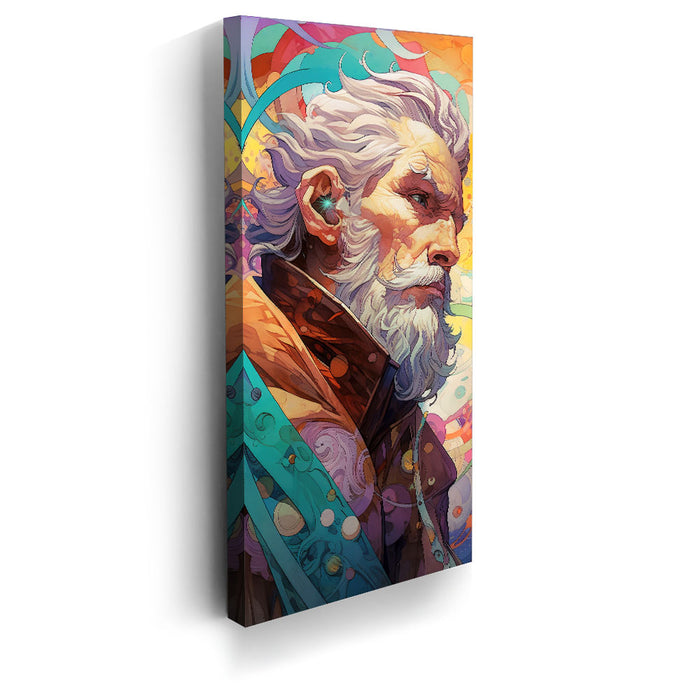 "Guardian of the Realms" by MidJourney.Man presents a distinguished, aged figure with a commanding presence, exuding wisdom and strength. The artwork features a bearded guardian enveloped in swirling, vibrant colors, blending elements of fantasy and cosmic mysticism. The rich textures and dynamic background enhance the figure's role as a protector of otherworldly realms, symbolizing knowledge, power, and vigilance.