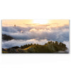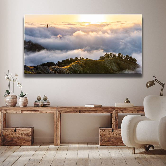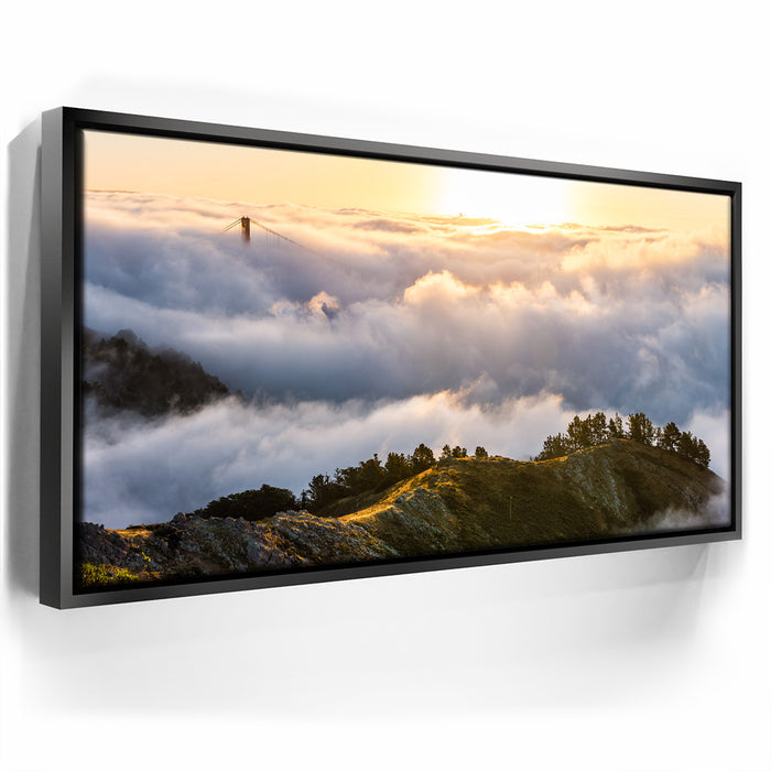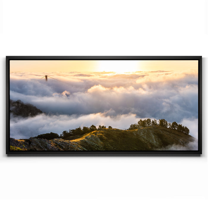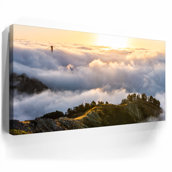 The Golden Gate Bridge and San Francisco captured under a layer of fog at sunrise.