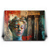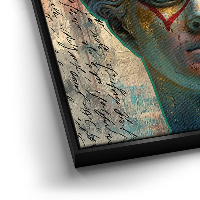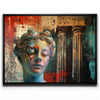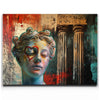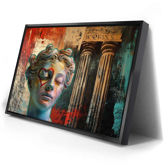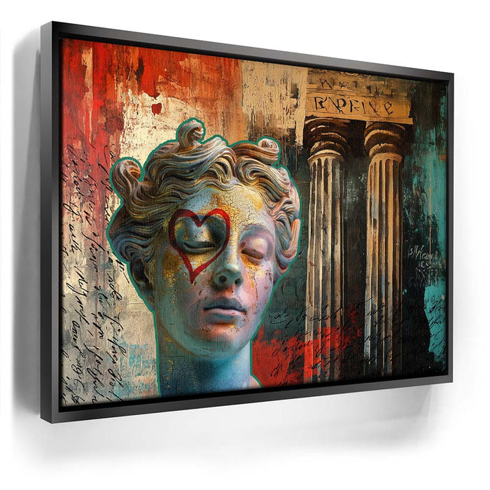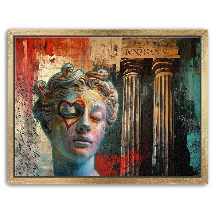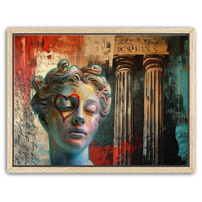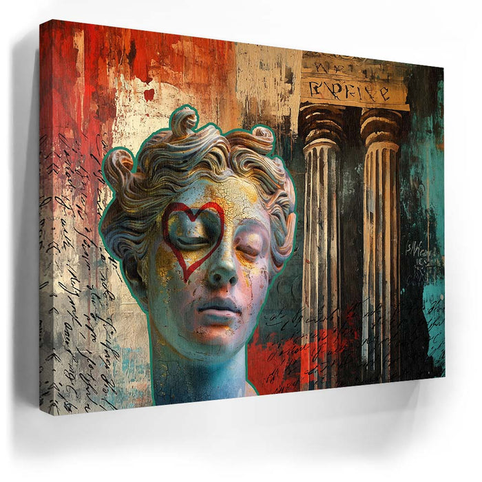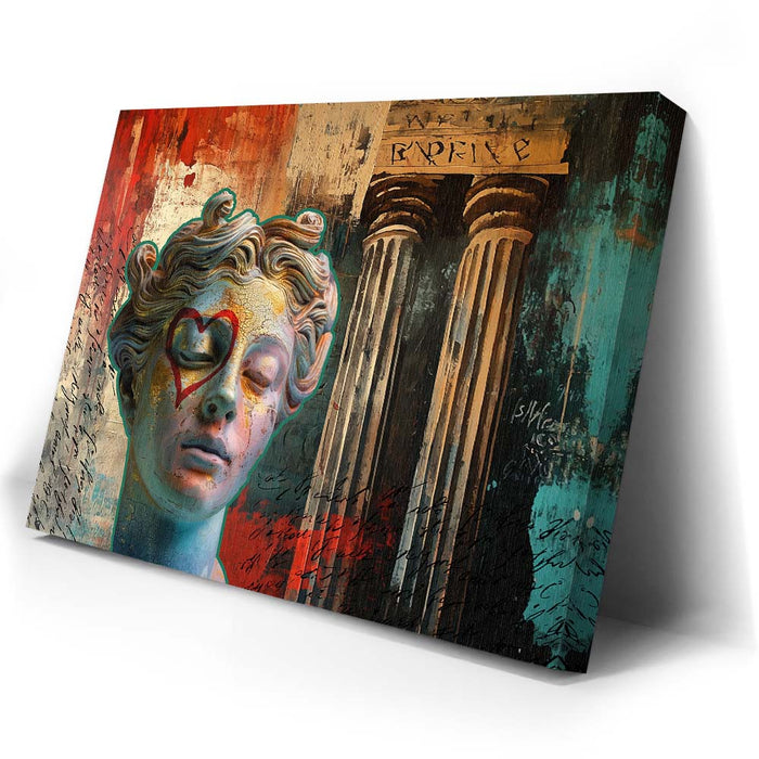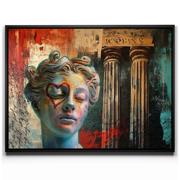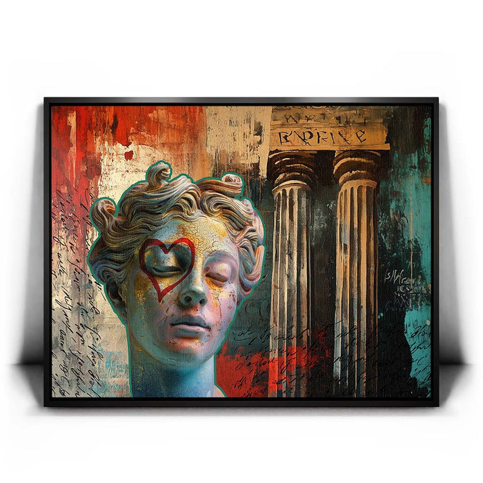 "Heart of Olympus" merges classical beauty with contemporary expression, presenting a serene, statue-like figure adorned with a vibrant heart over one eye. The weathered textures and ancient columns in the background evoke a sense of timelessness, while the graffiti-like heart infuses the piece with modern urban edge. This artwork reflects a poignant blend of love, history, and resilience, perfect for spaces that celebrate the connection between past and present.