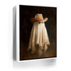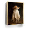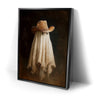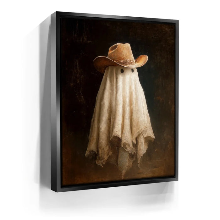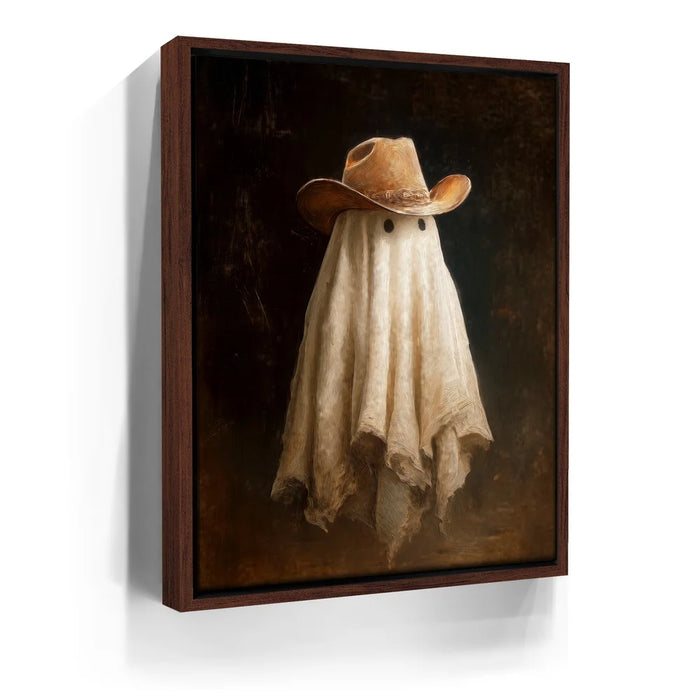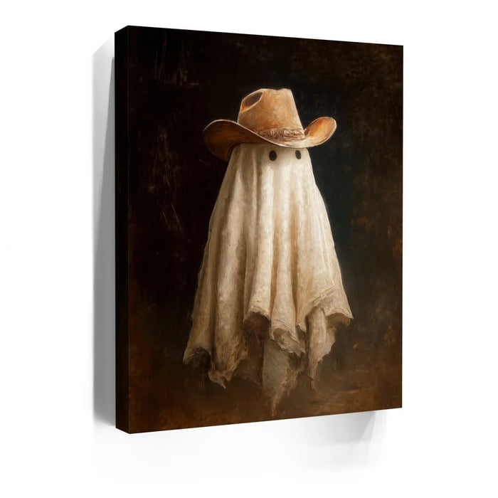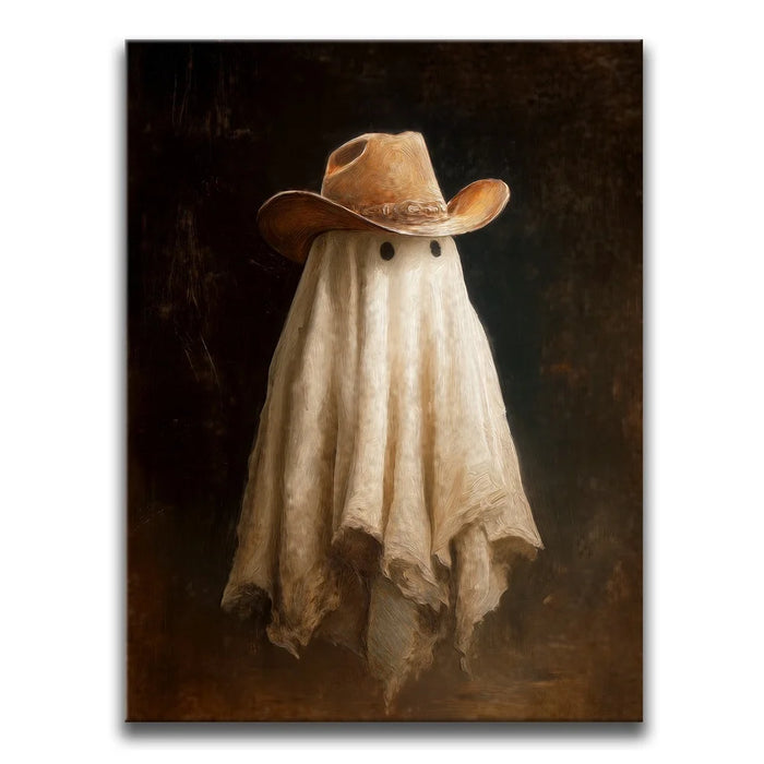 “Howdy, Haunt” by Kandise King combines Western charm with playful spookiness as a lone ghost stands upright beneath a classic cowboy hat. The weathered sheet, warm tones, and rustic details create a quirky character that feels both eerie and endearing.