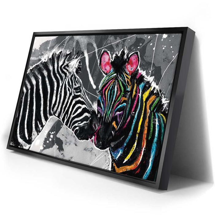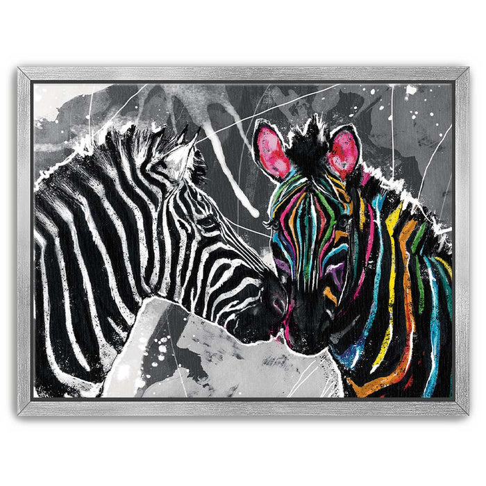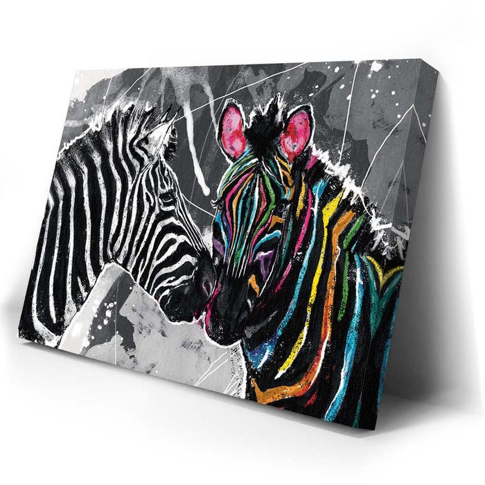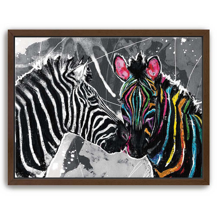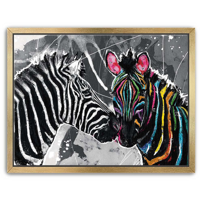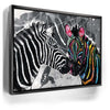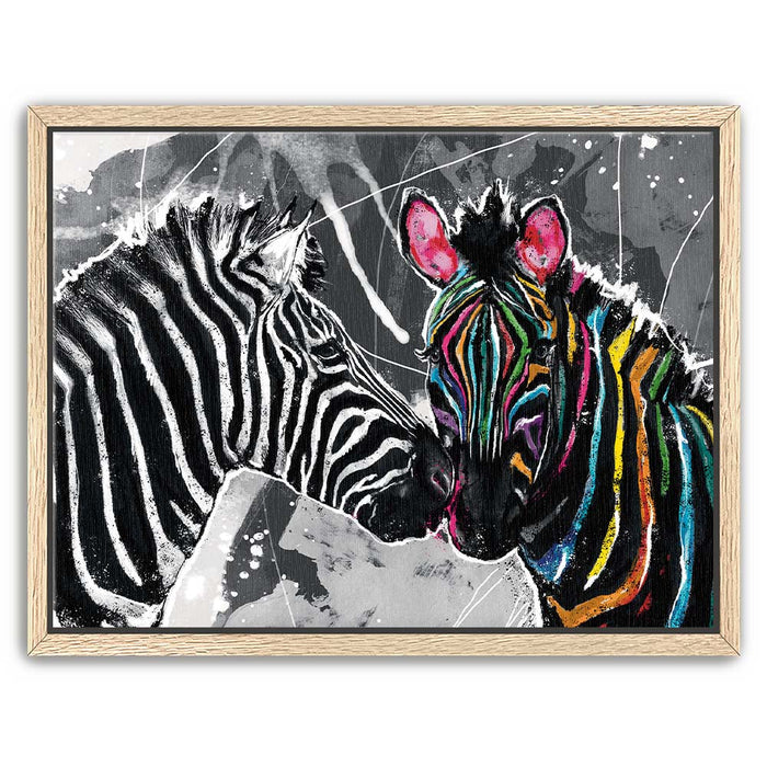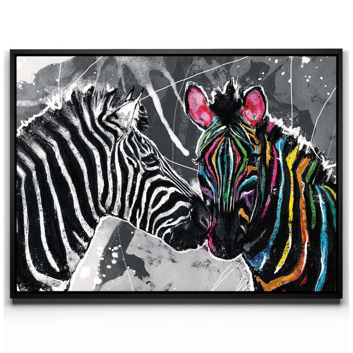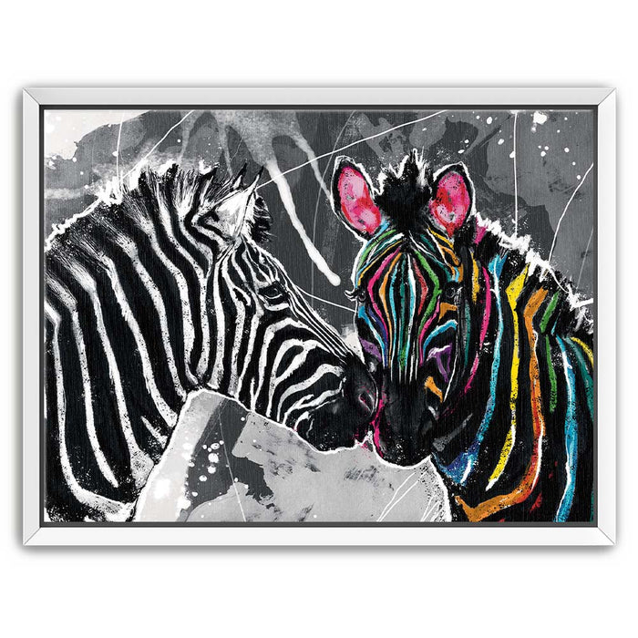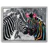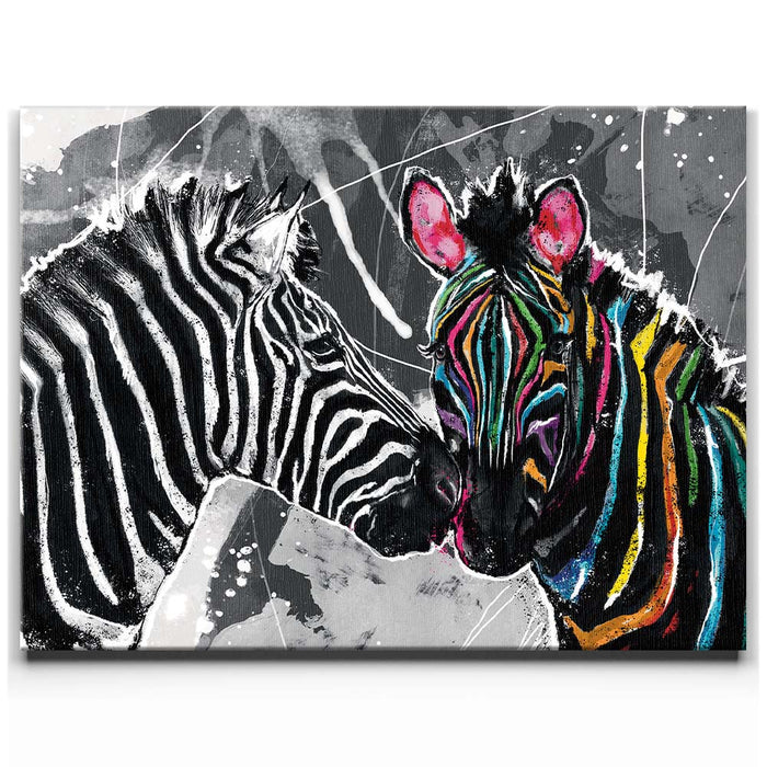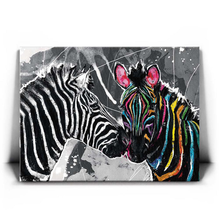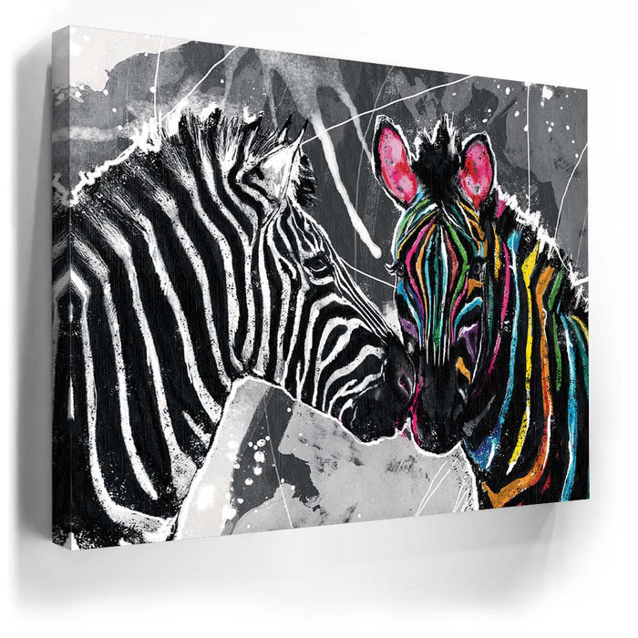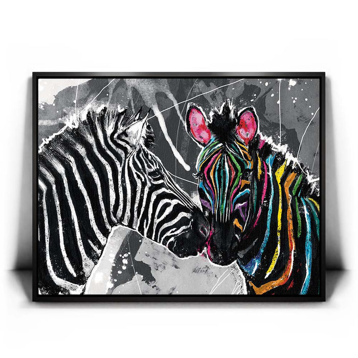 "Hues of Friendship" captures the tender connection between two zebras, one in classic black and white stripes and the other adorned with vibrant, colorful patterns. This striking contrast between the traditional and the exotic highlights the beauty and diversity of wild animals.