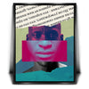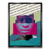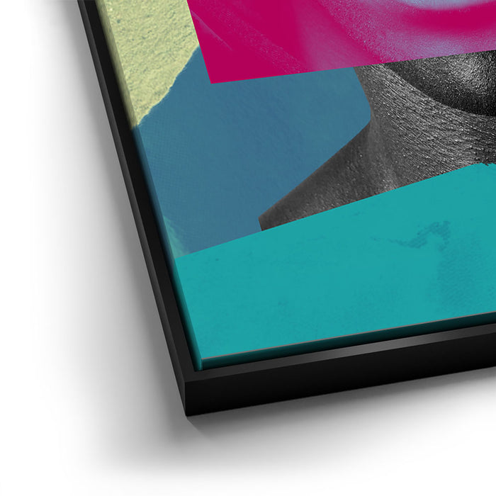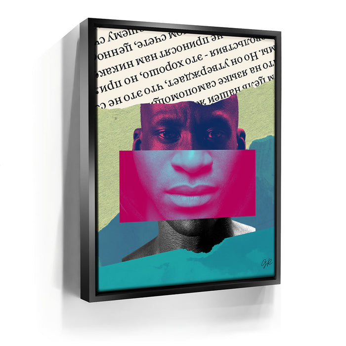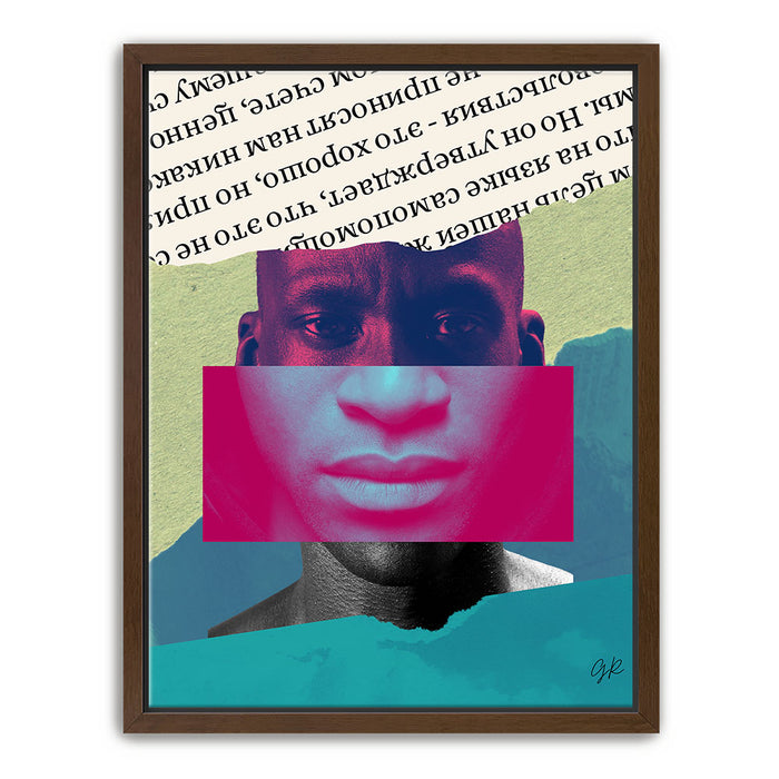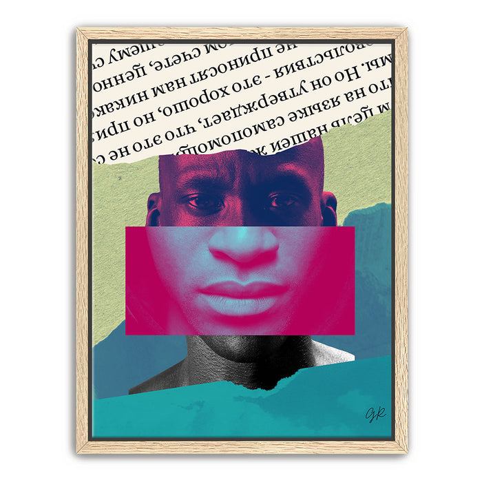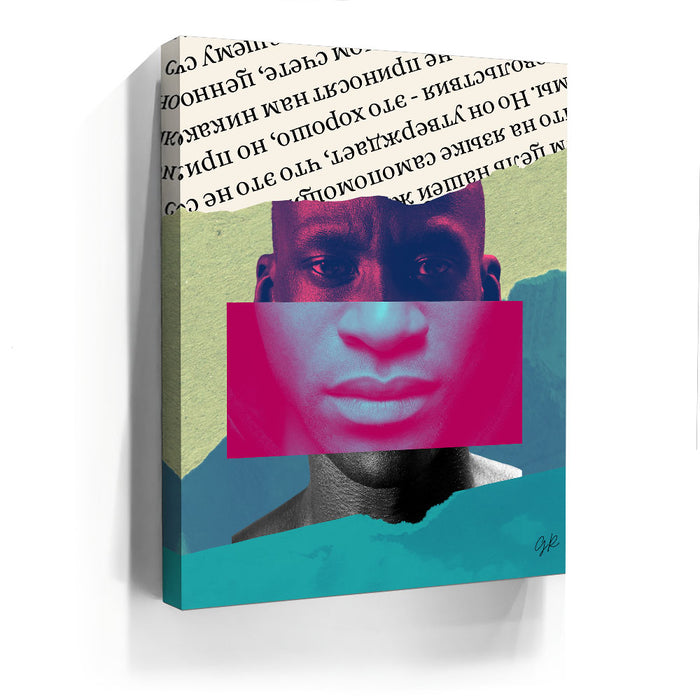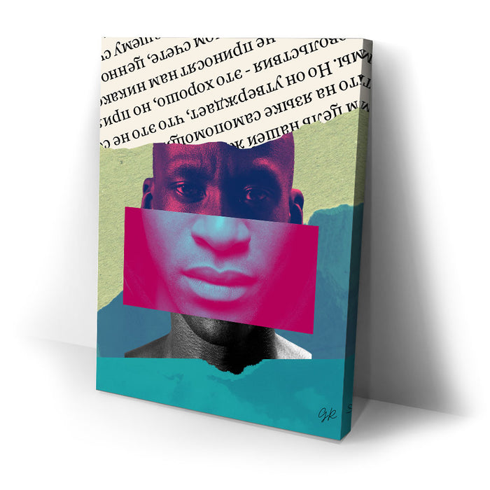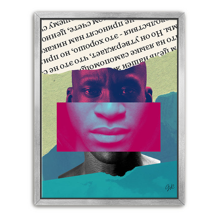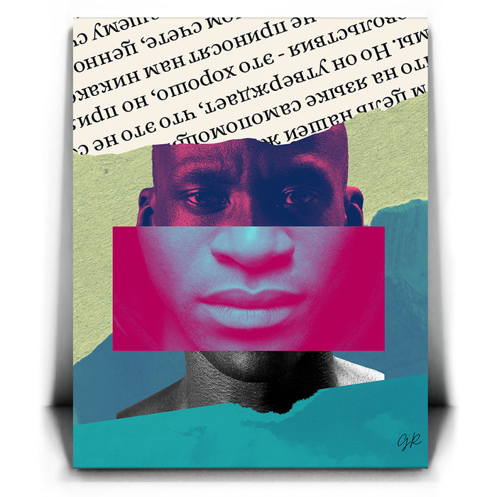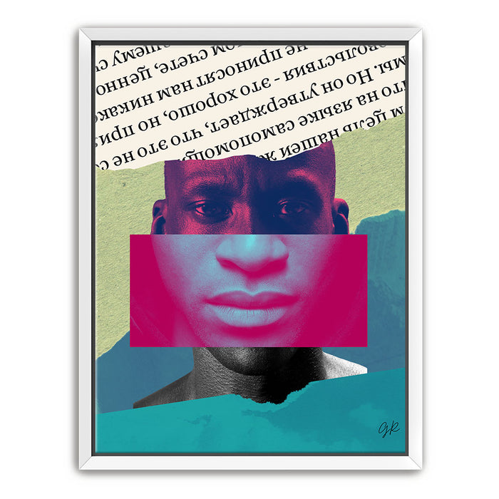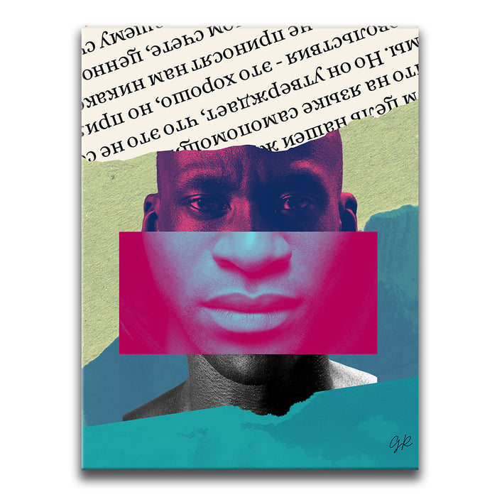 "I Express Myself In Pieces" by George Rosaly is a striking minimalist artwork that combines elements of collage and abstraction. The composition features the fragmented face of a man, with portions of the image overlaid by vibrant colors and text fragments, creating a mosaic-like effect.