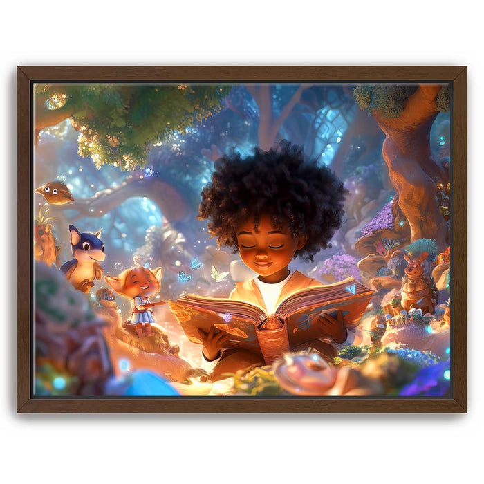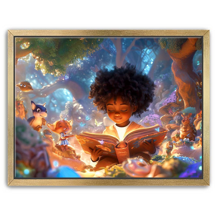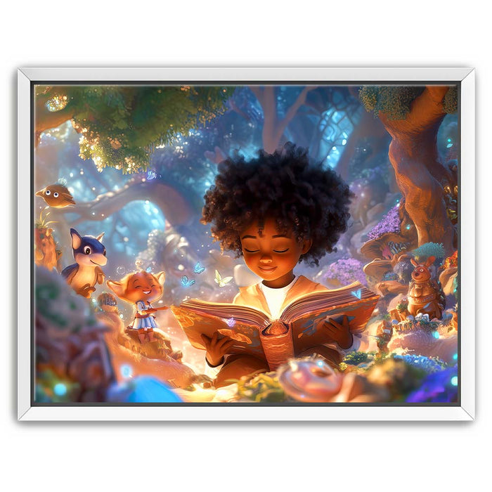 "Imagination Unfolds" by Kandise King is a delightful artwork that brings the magic of storytelling to life. Set in an enchanting forest, the piece features a young girl surrounded by whimsical woodland creatures, all captivated by the glowing pages of a book she reads. The luminous atmosphere, vibrant colors, and charming characters create a scene brimming with wonder and joy.
