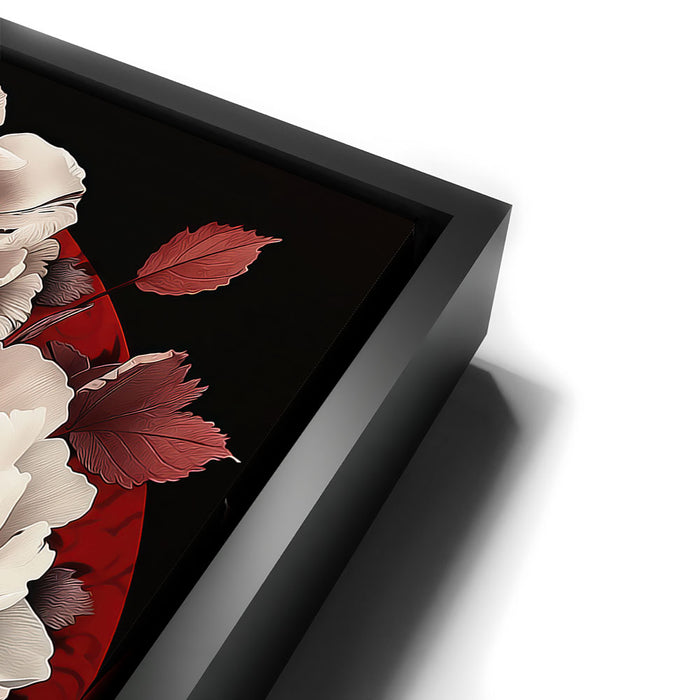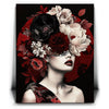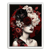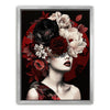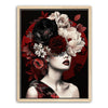 "In Her Bloom" by Stella Ygris is an exquisite portrayal of feminine strength and elegance through floral artistry. The artwork features a striking woman adorned with a vivid arrangement of bold red, black, and white blossoms, accentuated by intricate details and a mysterious mask. The dramatic contrast between her features and the floral elements creates a visual symphony that is both alluring and empowering.