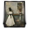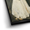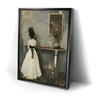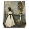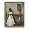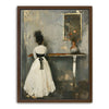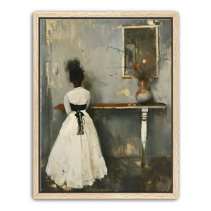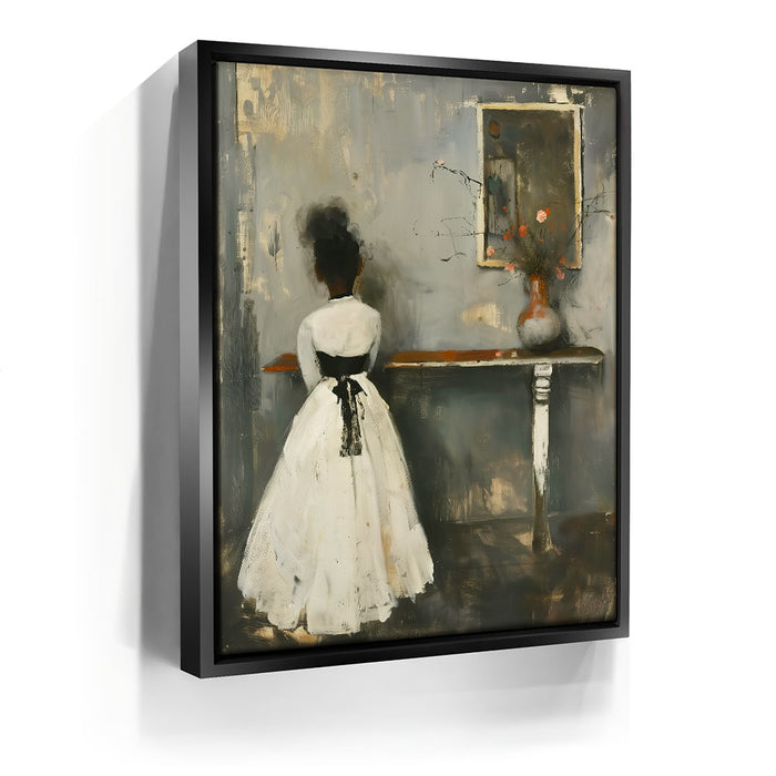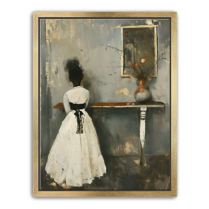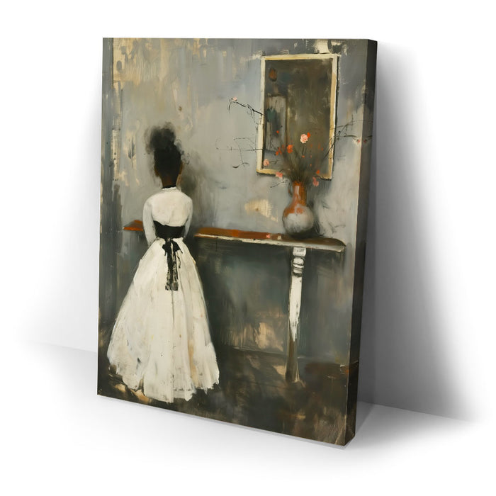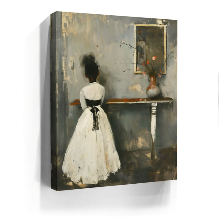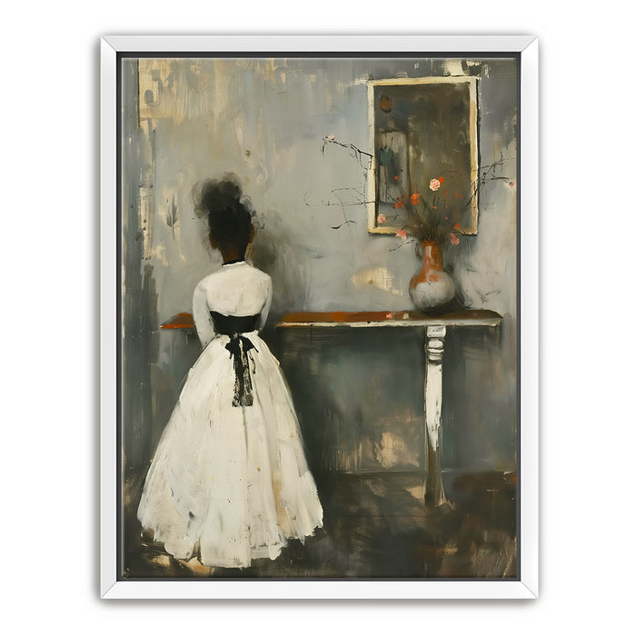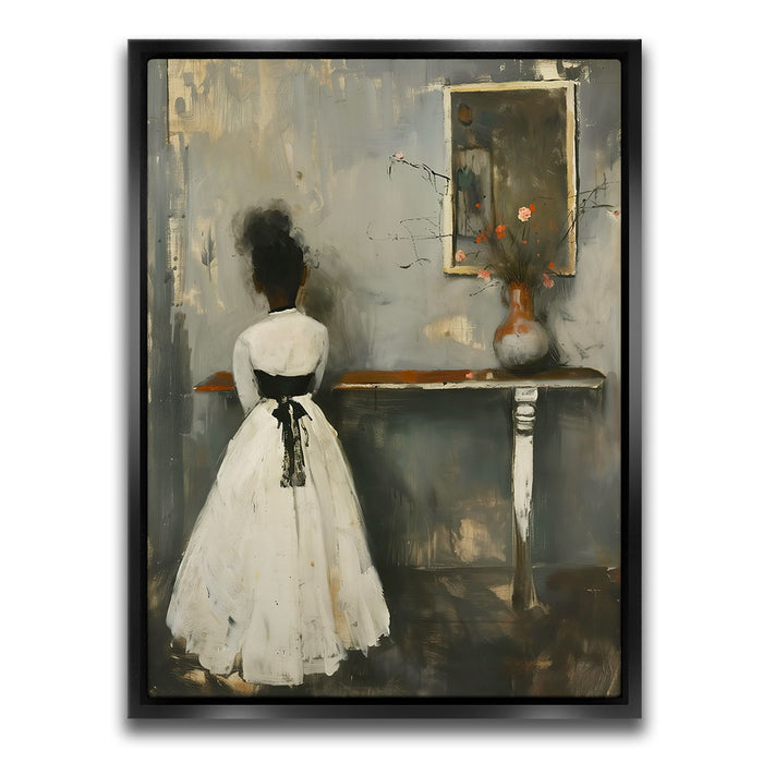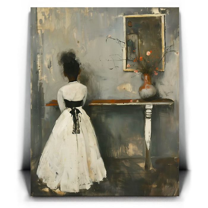 "In Quiet Contemplation" by Kandise King is a serene and introspective piece that captures a moment of solitude and reflection. Featuring a figure in a flowing white dress with a black ribbon, standing before a table adorned with a simple vase of flowers, the muted palette and soft textures evoke a sense of timeless elegance. The subtle details, including the mirrored reflection, add depth and emotion to the scene.