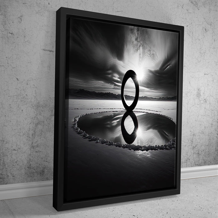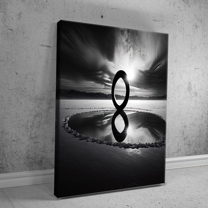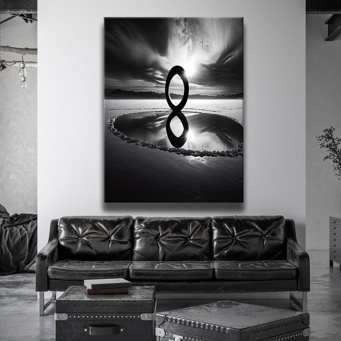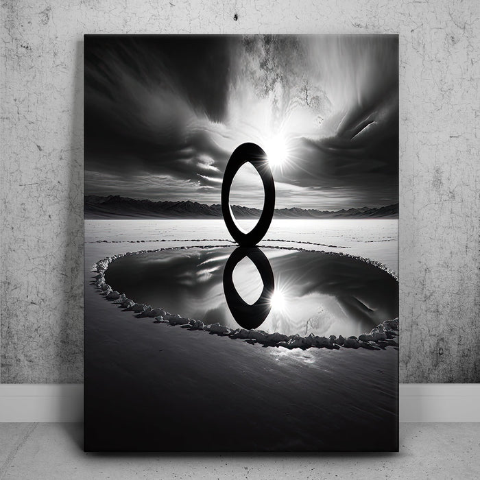 Perfect for modern interiors and fans of sci-fi and abstract art, "Infinity Monolith" adds a sophisticated and enigmatic touch to any space. Its timeless black-and-white palette makes it a versatile choice for offices, living rooms, or creative spaces seeking a bold, contemplative focal point.