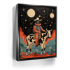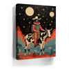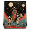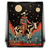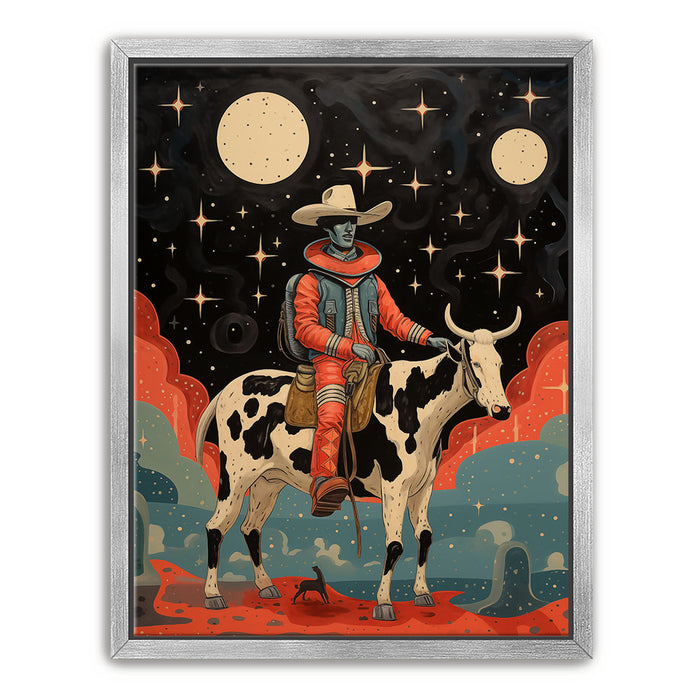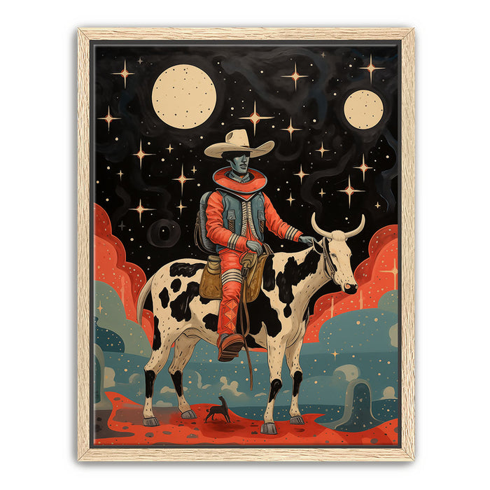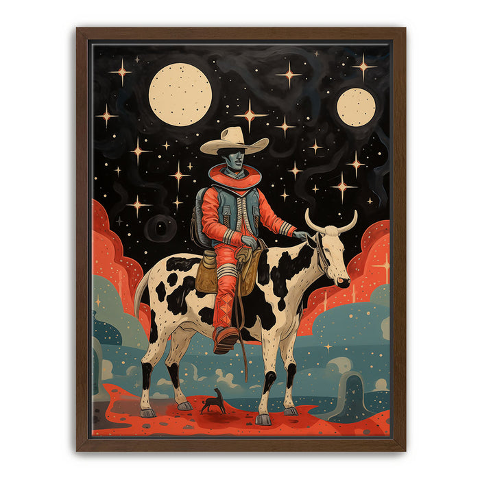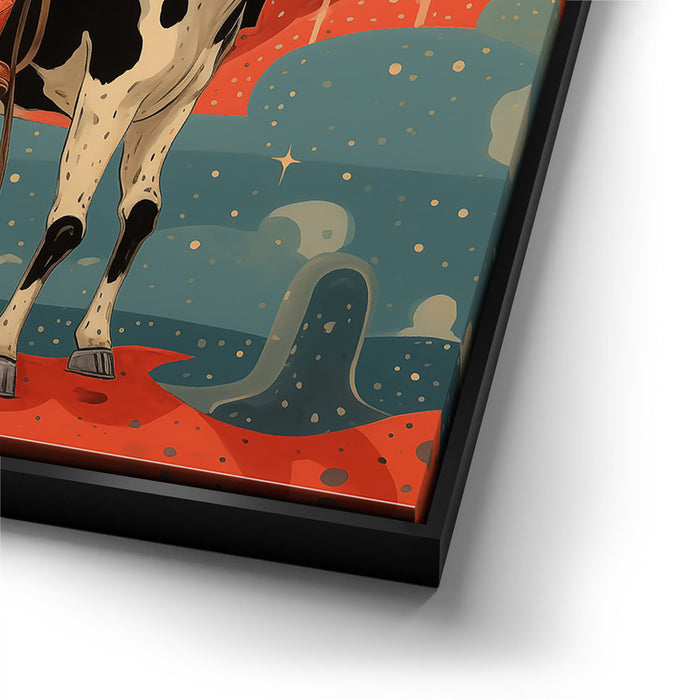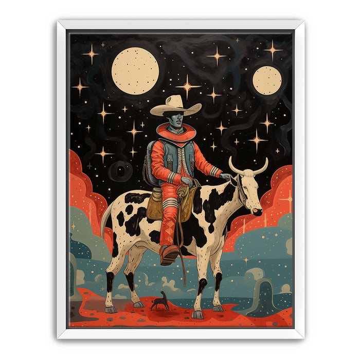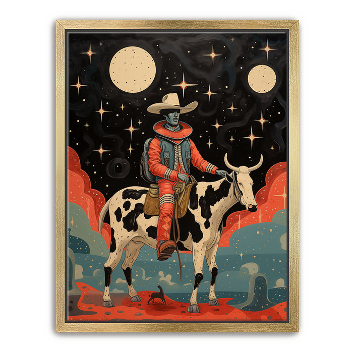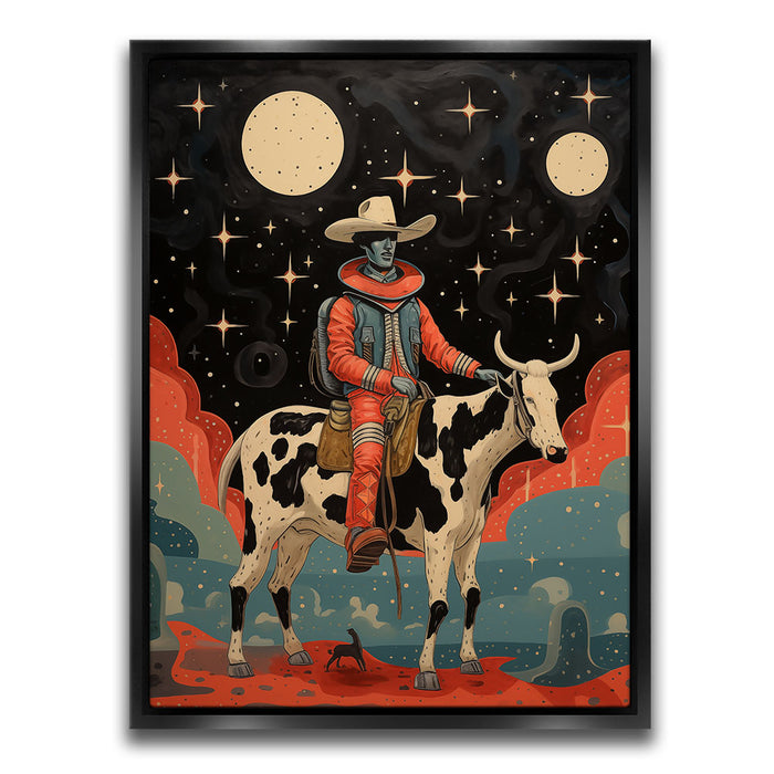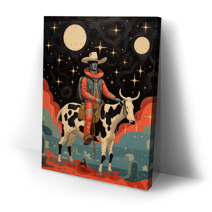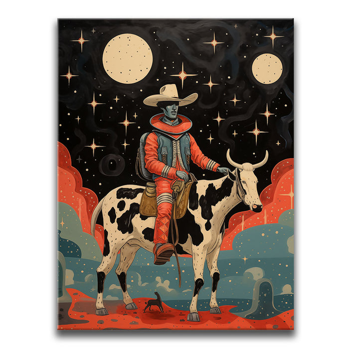 Intergalactic Cowboy by Sean Pearce is a vibrant abstract portrait that fuses the spirit of the Wild West with the mysteries of outer space. Featuring a cosmic cowboy set against a glowing full moon, this colorful artwork blends zoo animals like cows with space travel elements, creating a surreal fusion of cowboy life and interstellar exploration.