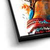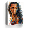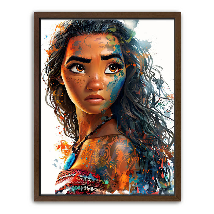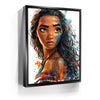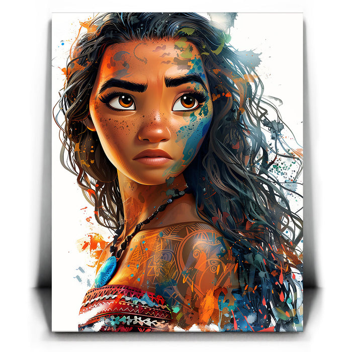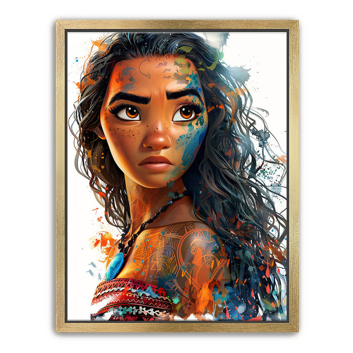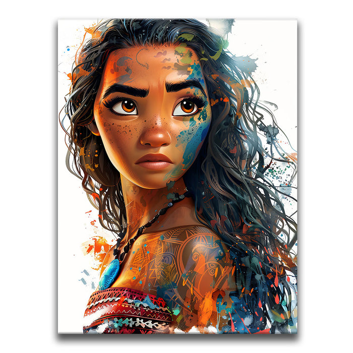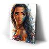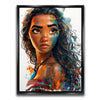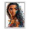 The woman's expression is one of focus and resolve, while the surrounding splashes of color and patterns add a sense of movement and energy. This artwork blends elements of animation with a powerful portrayal of feminine beauty and cultural identity.