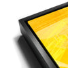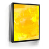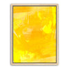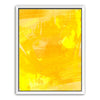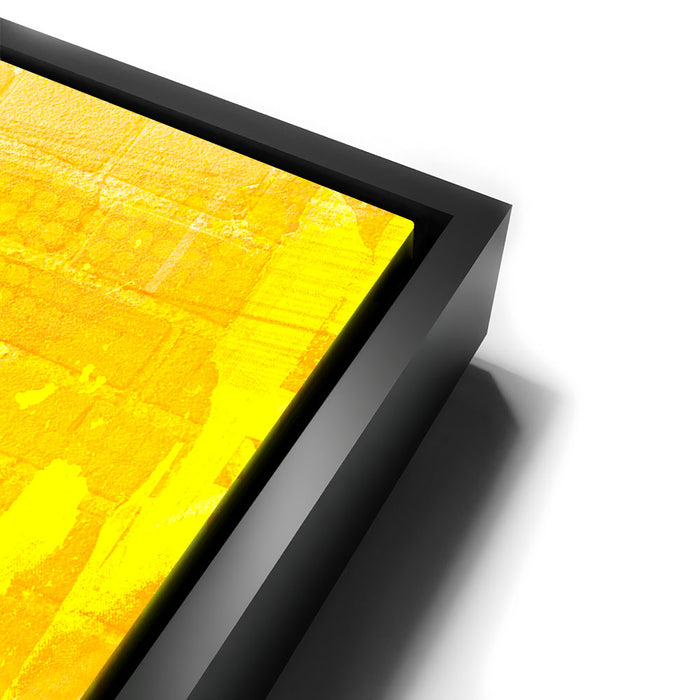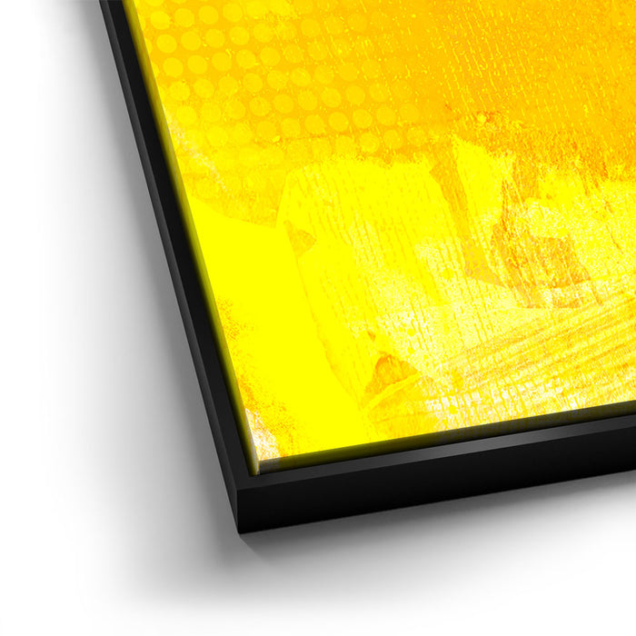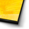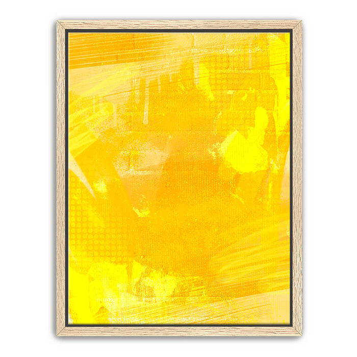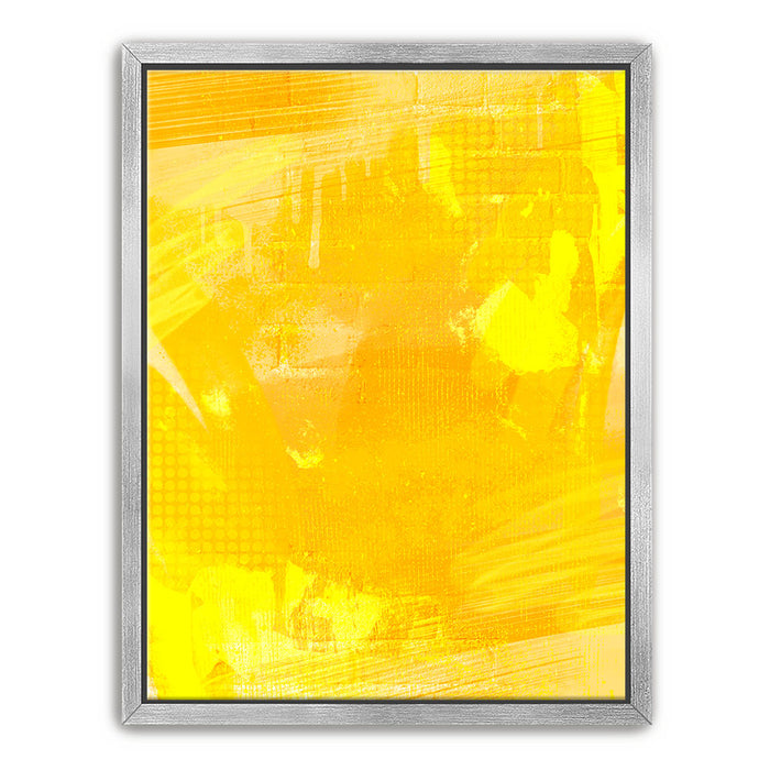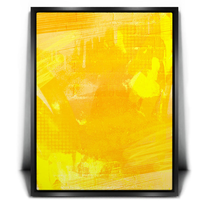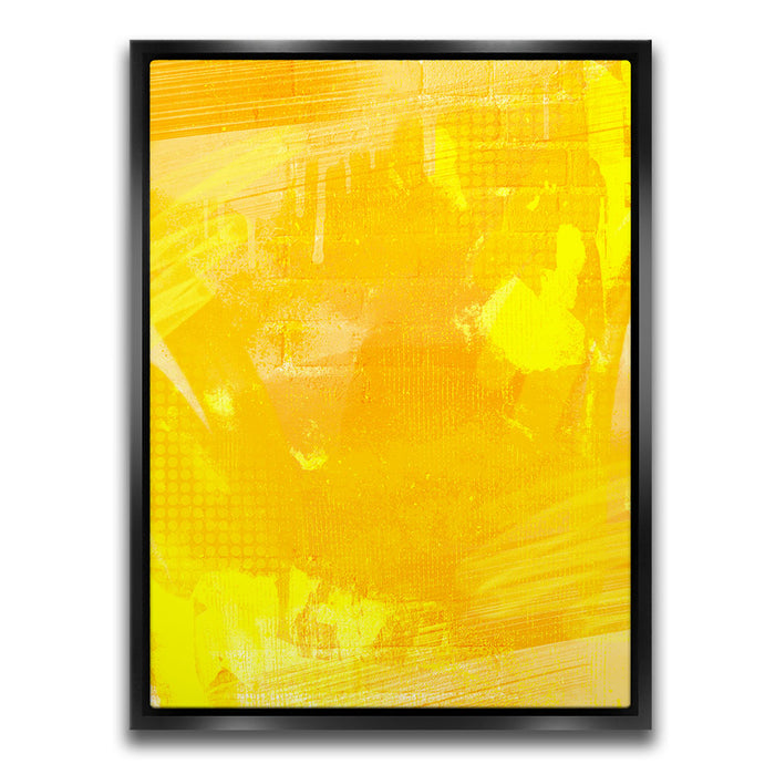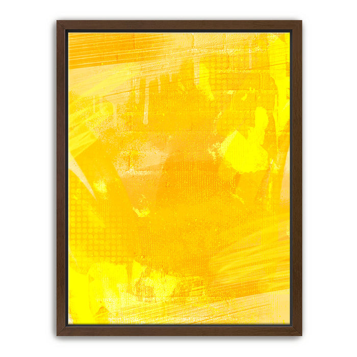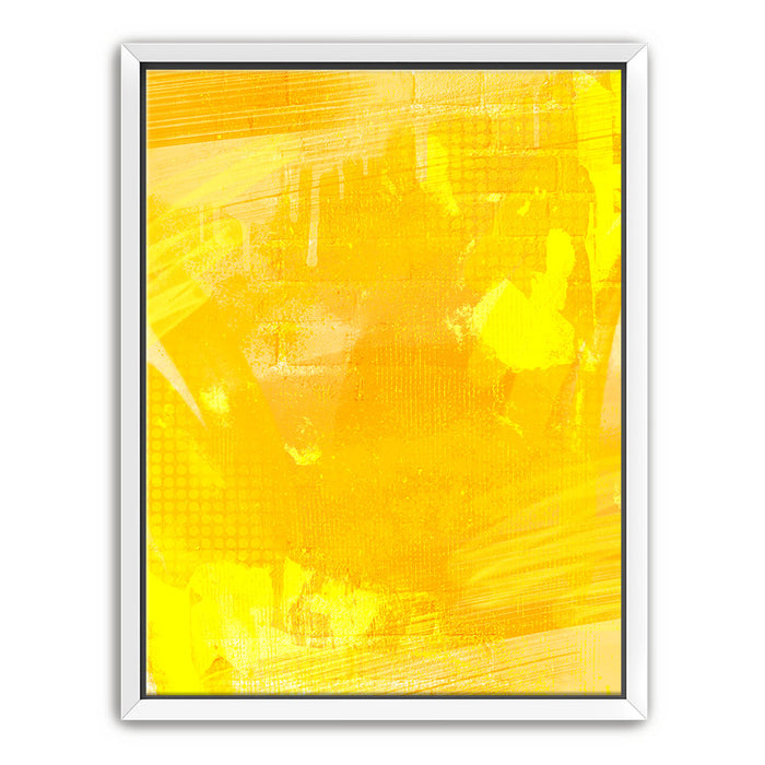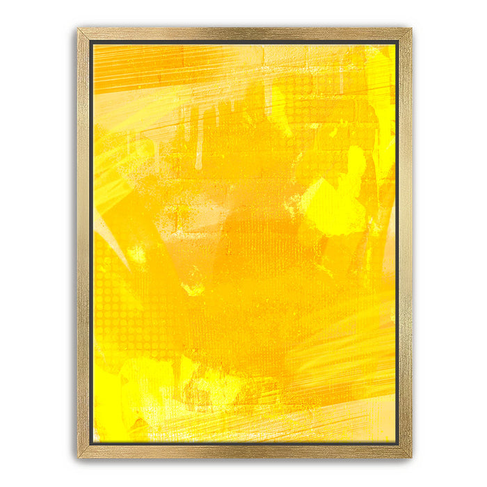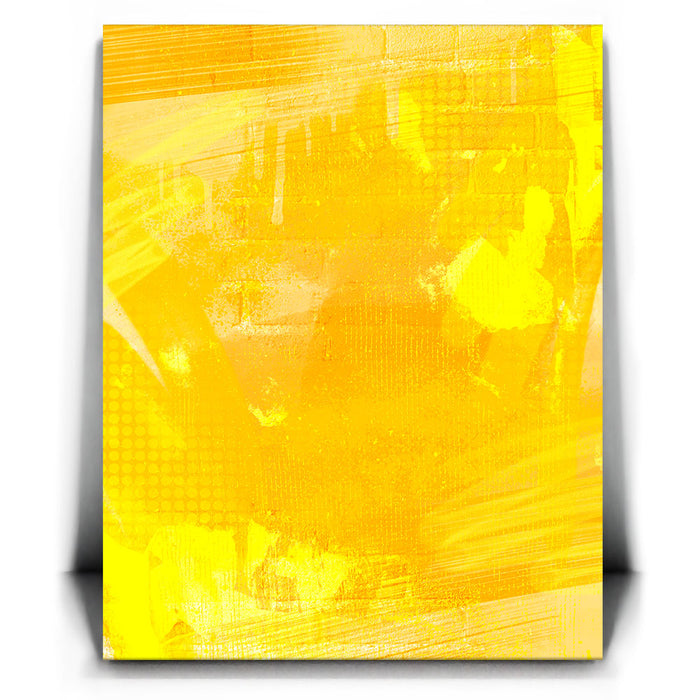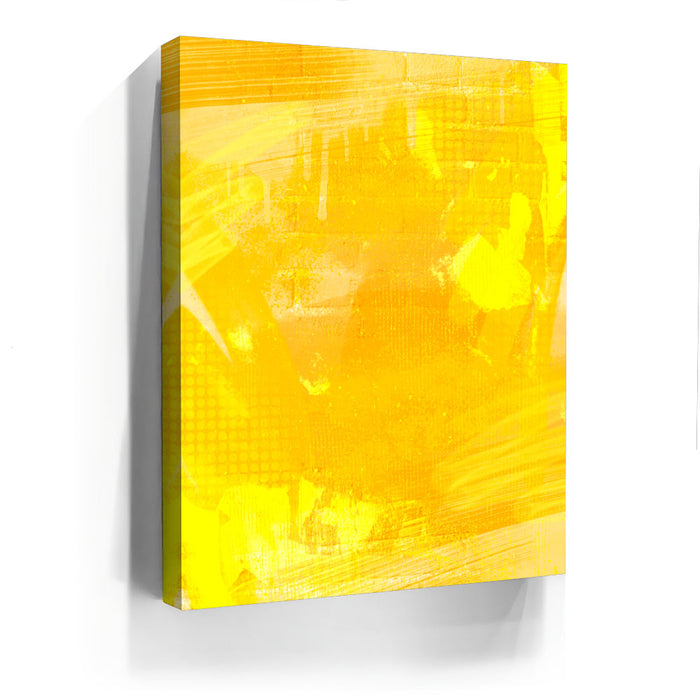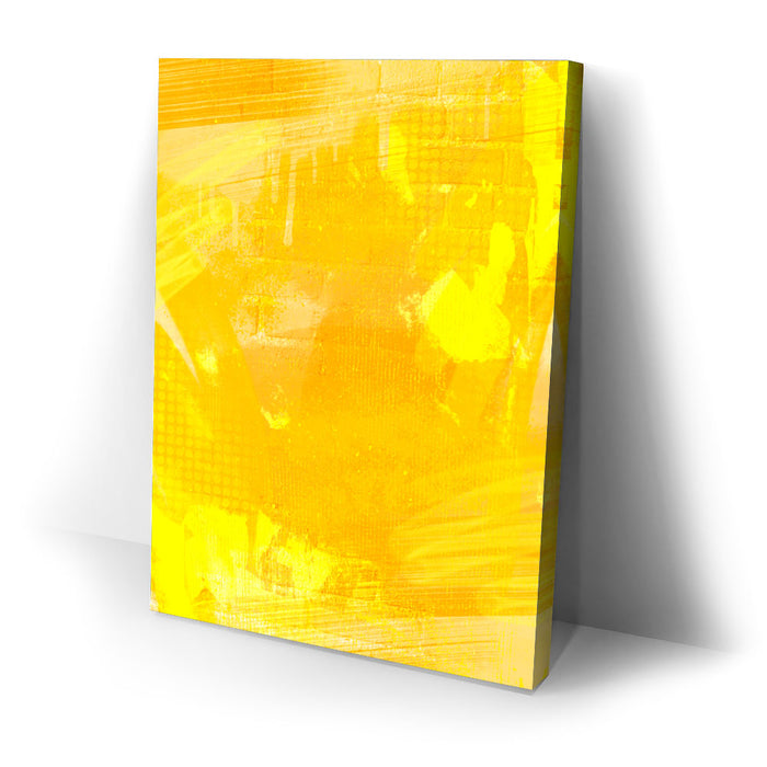 This dynamic abstract wall art piece radiates with the warmth of yellow paint, creating an uplifting and energetic atmosphere. The artwork showcases a variety of textures and techniques, from smooth strokes to layered splashes, all unified by the vibrant yellow hue.